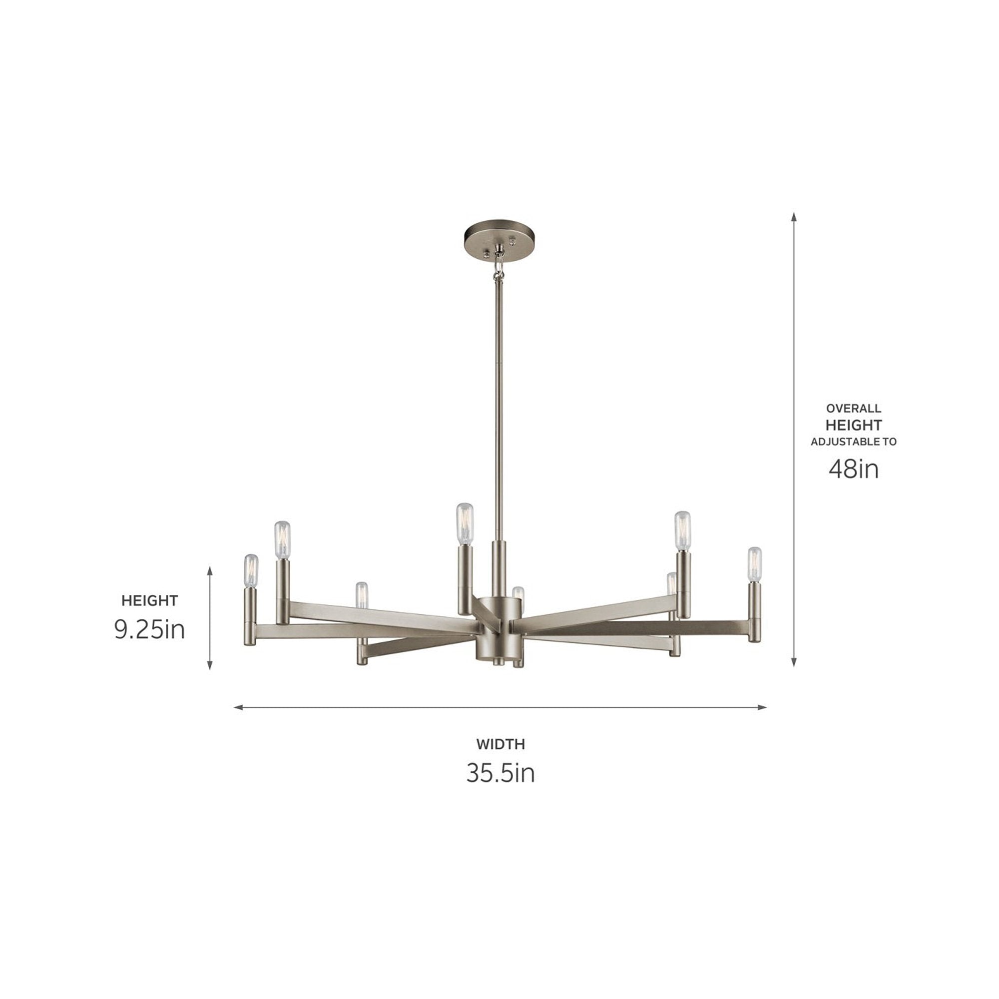 - 8-Light: 35.5"D X 9.25"H; 48" max height