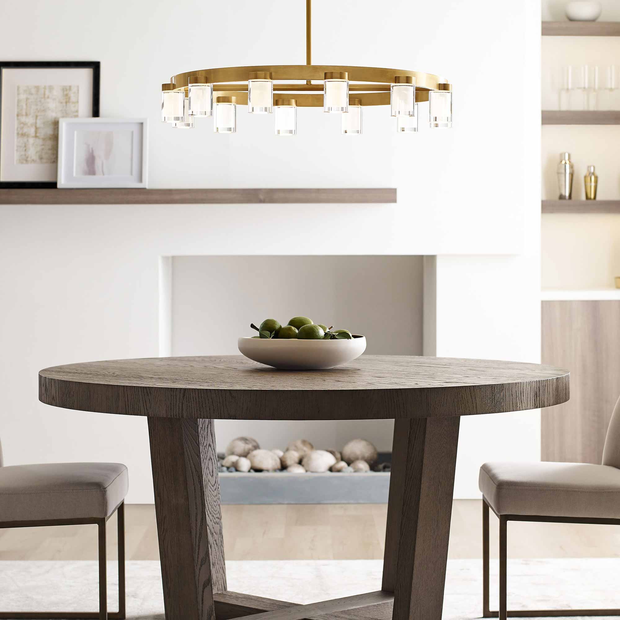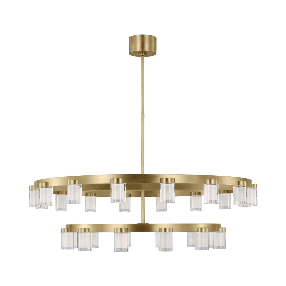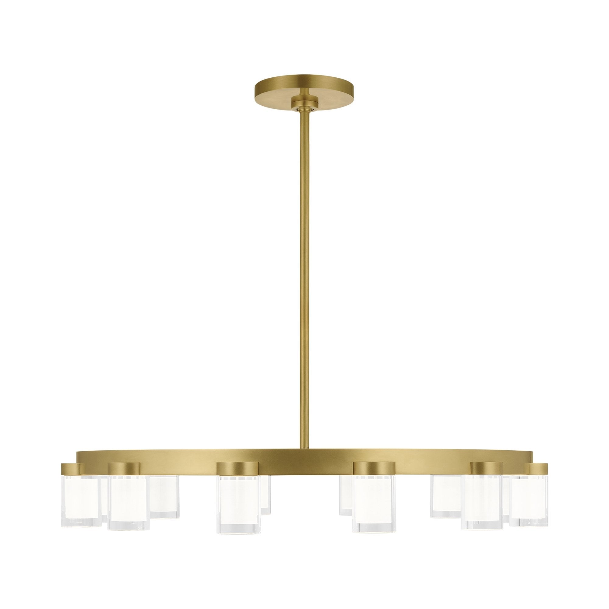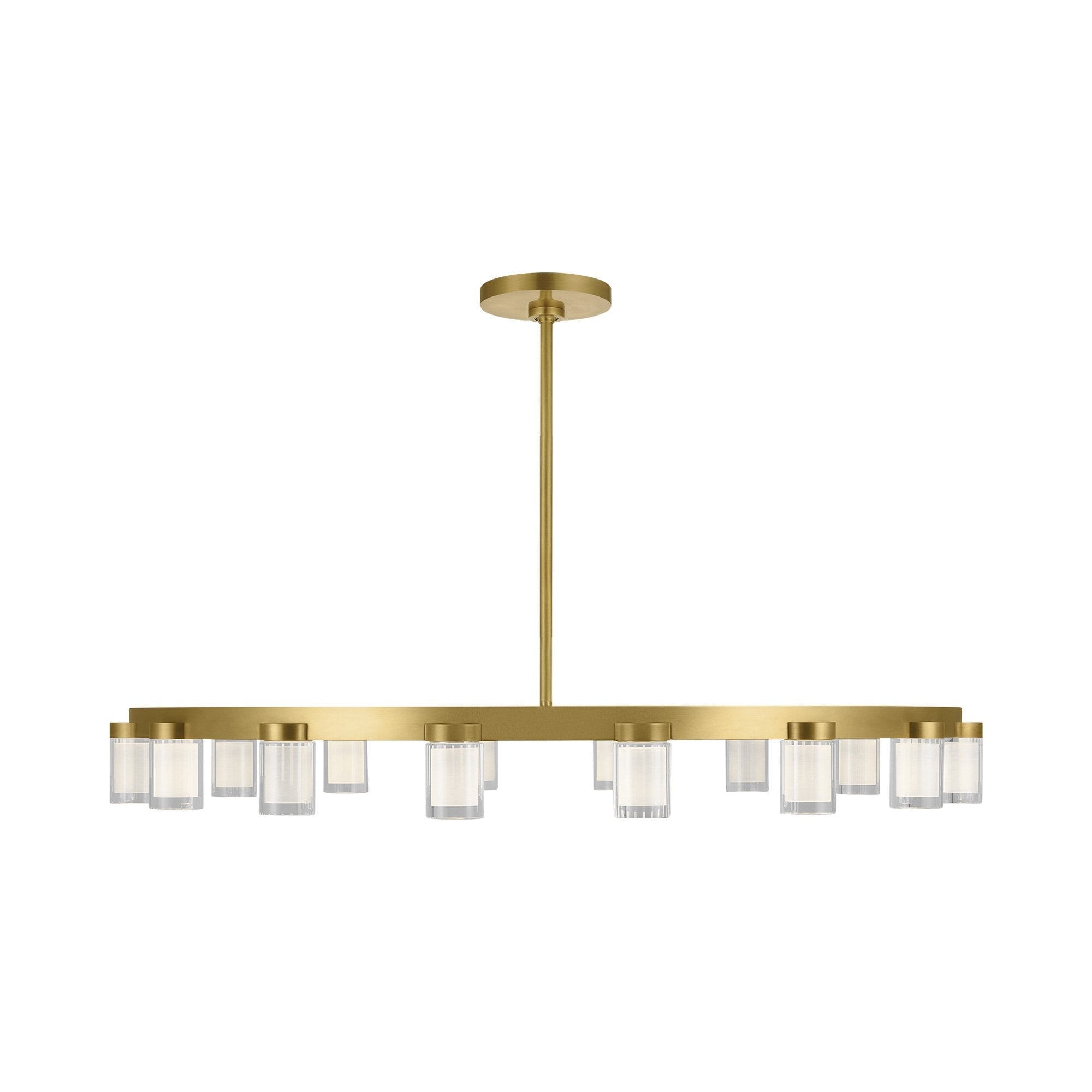 The Esfera LED Chandelier by Kelly Wearstler for Visual Comfort Modern realizes the beauty of elemental materials and spatial symmetries. In an elevated exchange of visual textures and clarity of form, the transitional design of this piece is a modern portrait of the convergence of cylindrical multi-dimensional prisms as integral sources of light with simple, linear metal detailing in varied geometric gestures as the connecting base.