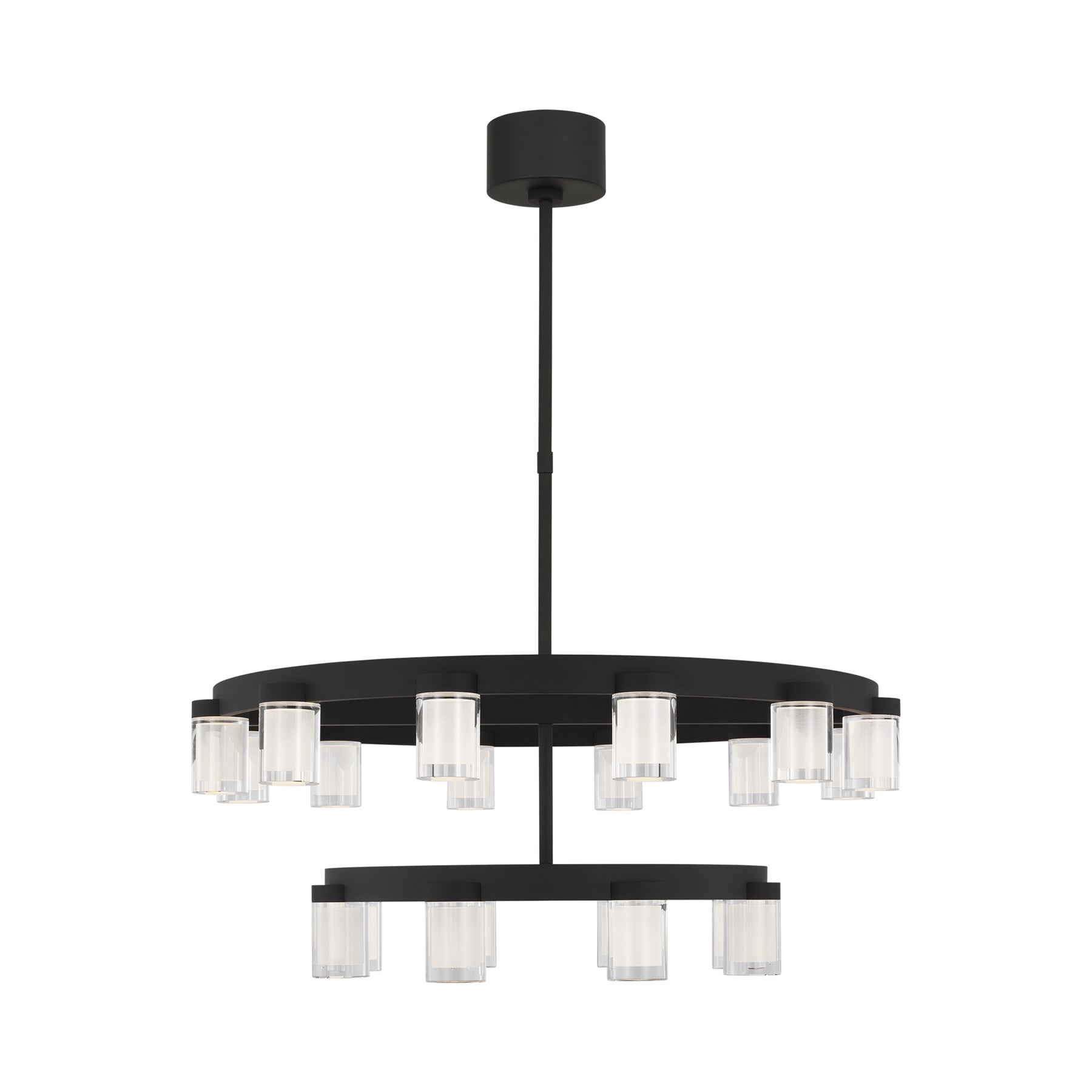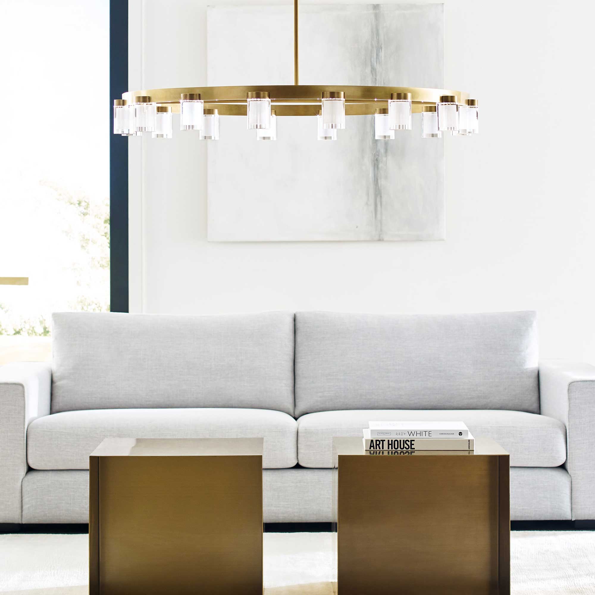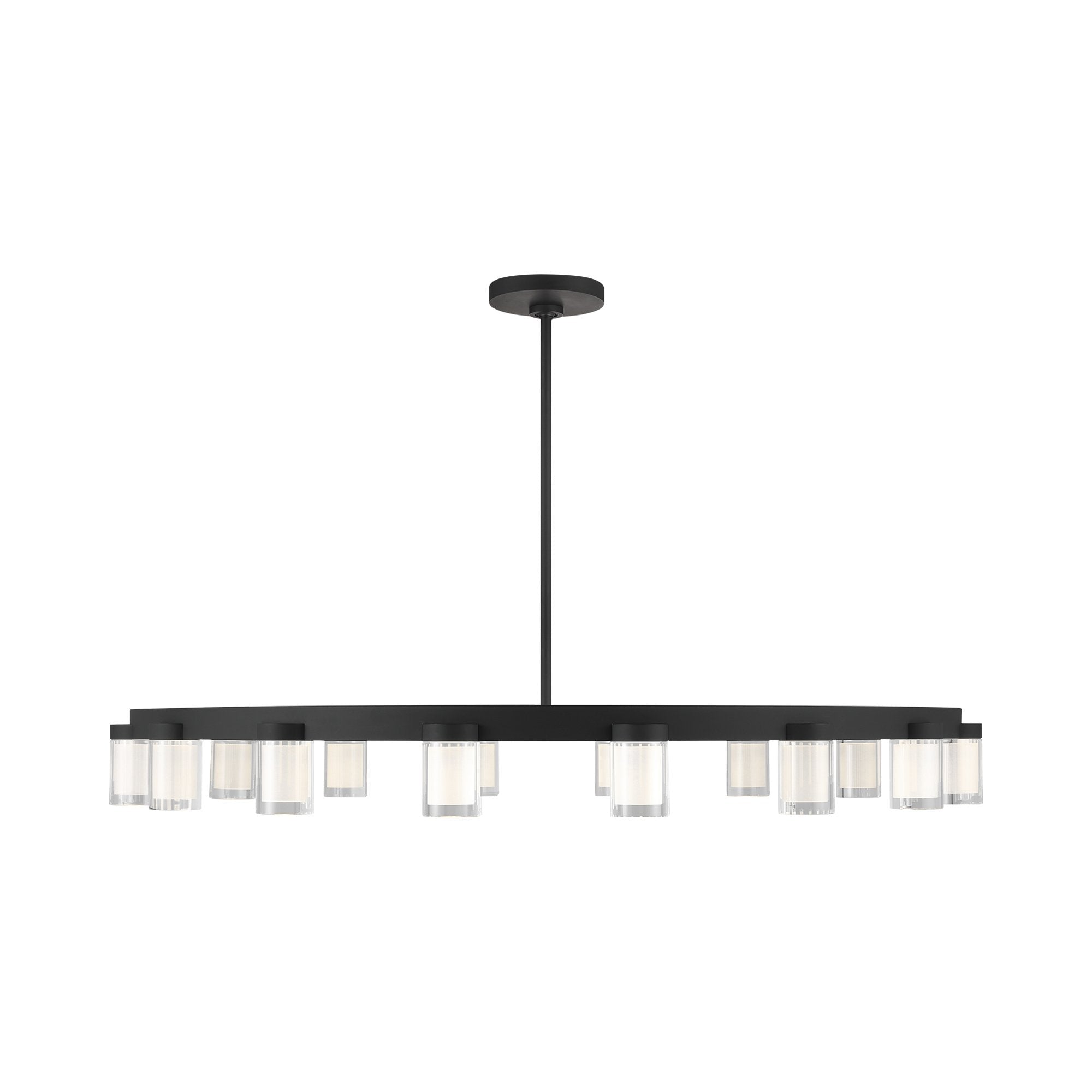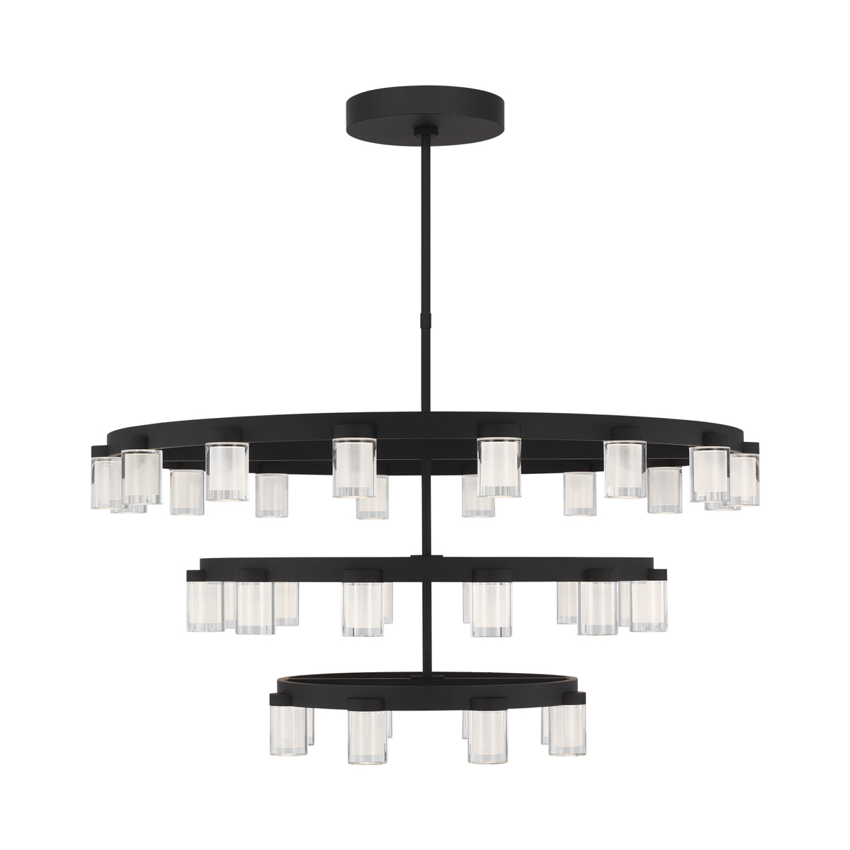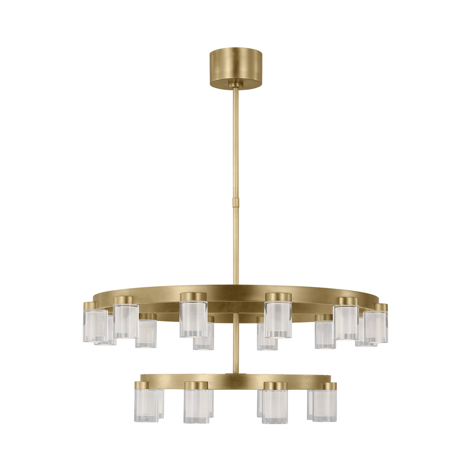 The Esfera LED Chandelier by Kelly Wearstler for Visual Comfort Modern realizes the beauty of elemental materials and spatial symmetries. In an elevated exchange of visual textures and clarity of form, the transitional design of this piece is a modern portrait of the convergence of cylindrical multi-dimensional prisms as integral sources of light with simple, linear metal detailing in varied geometric gestures as the connecting base.