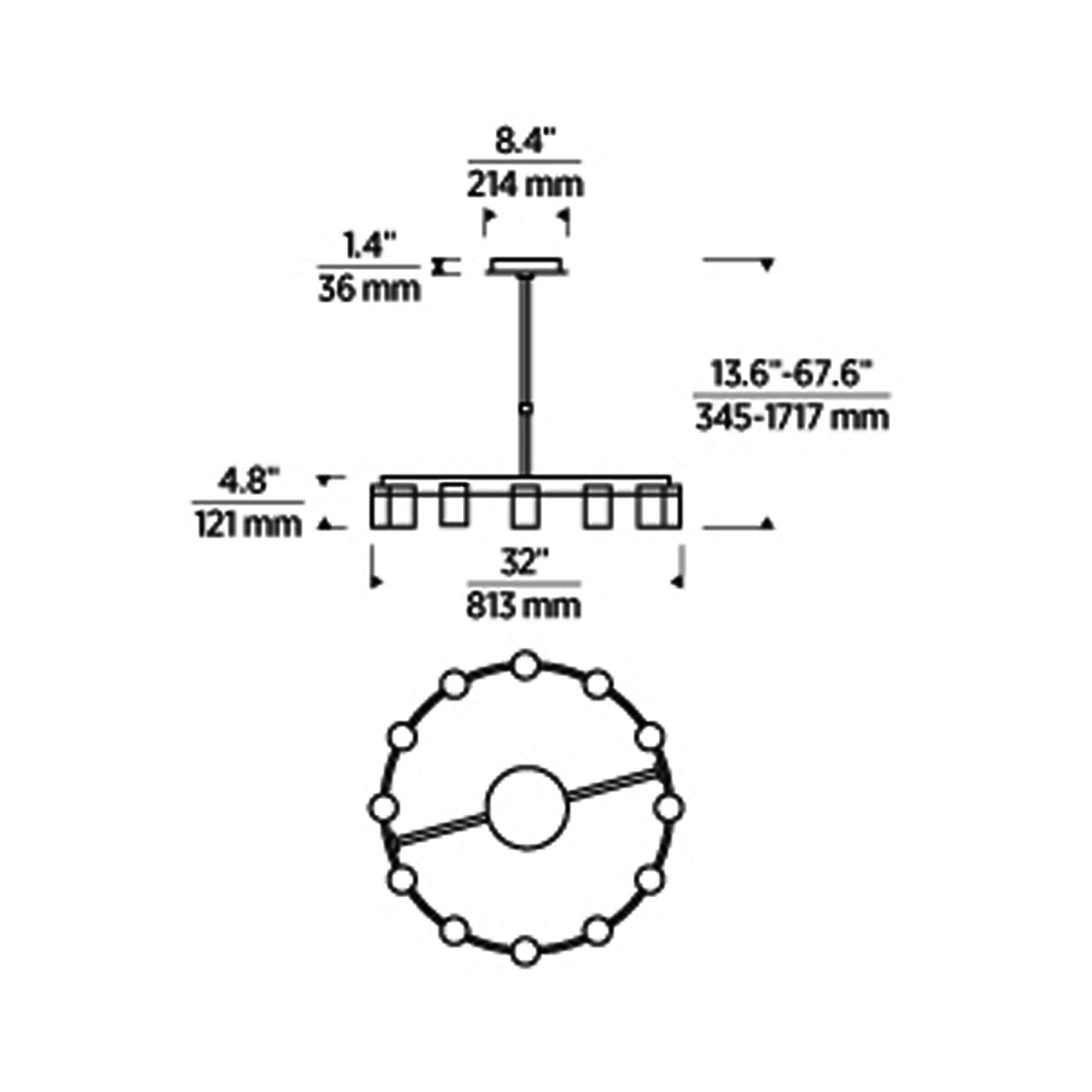 - 12-Light: 32"D X 4.8"H; 67.5" max height