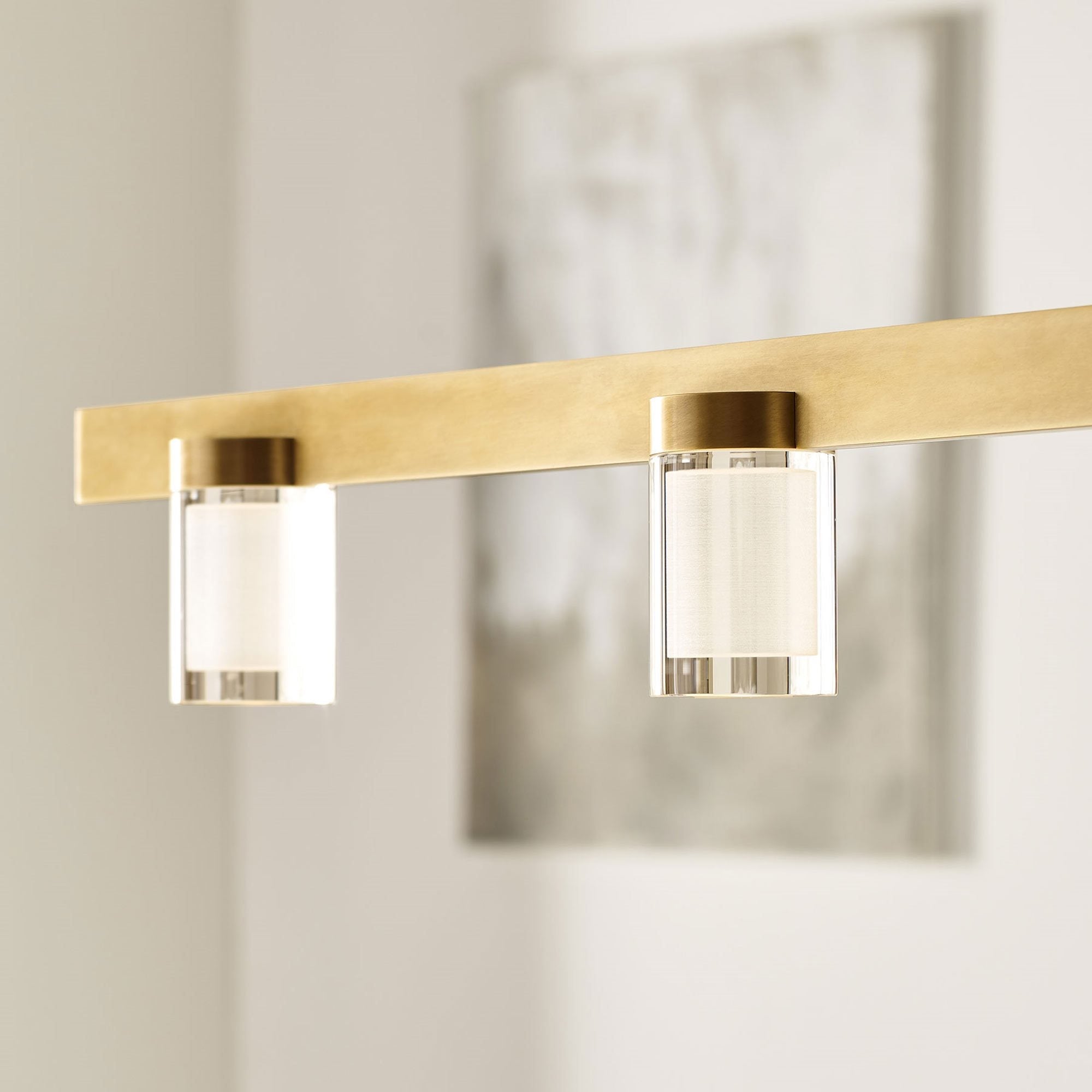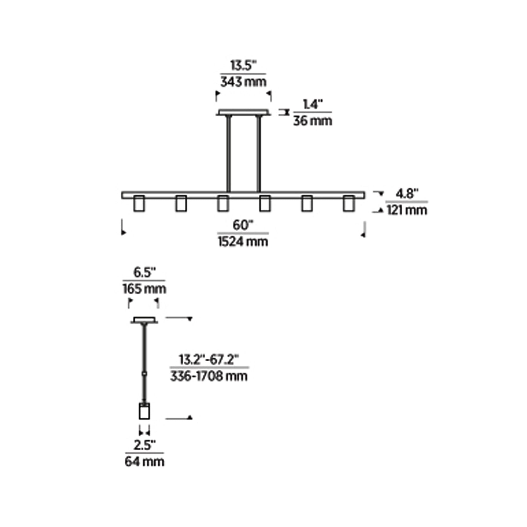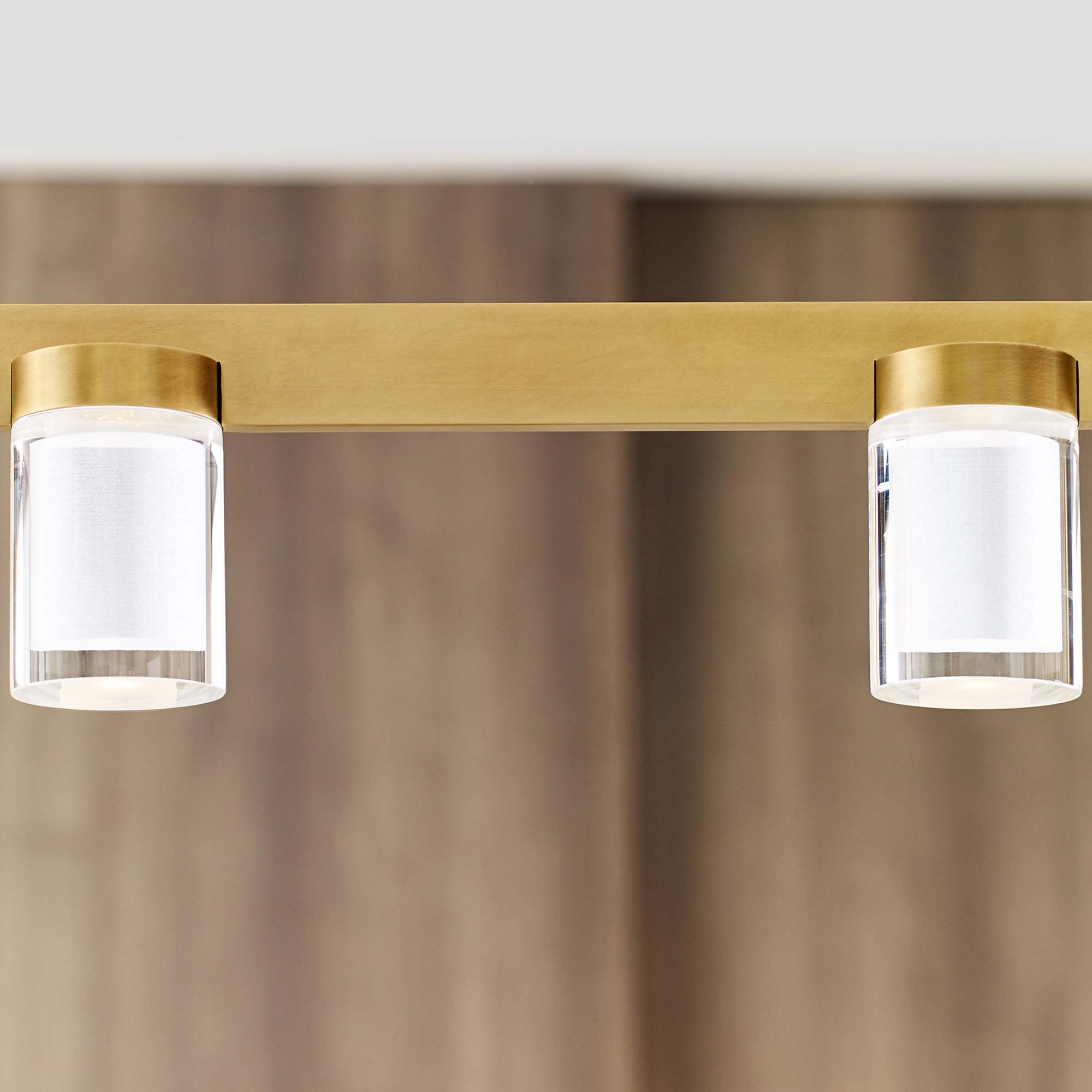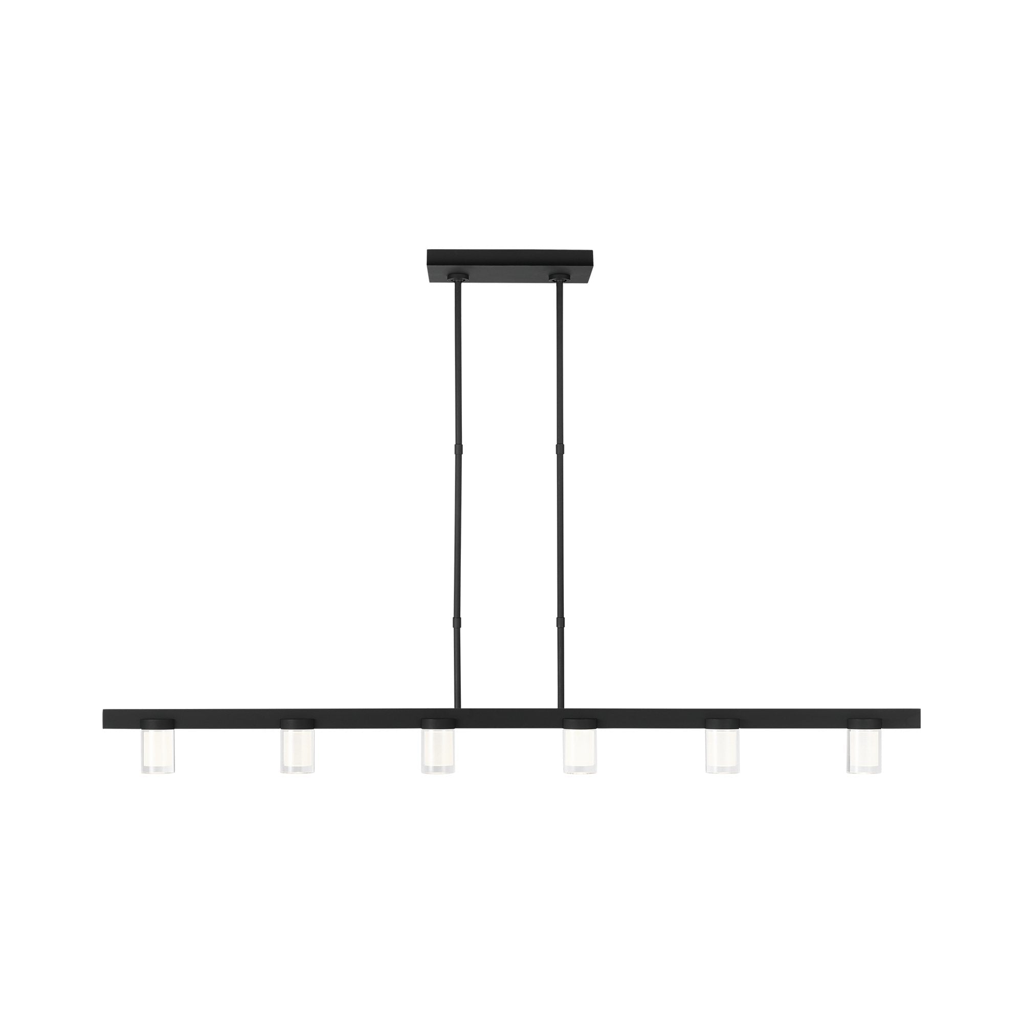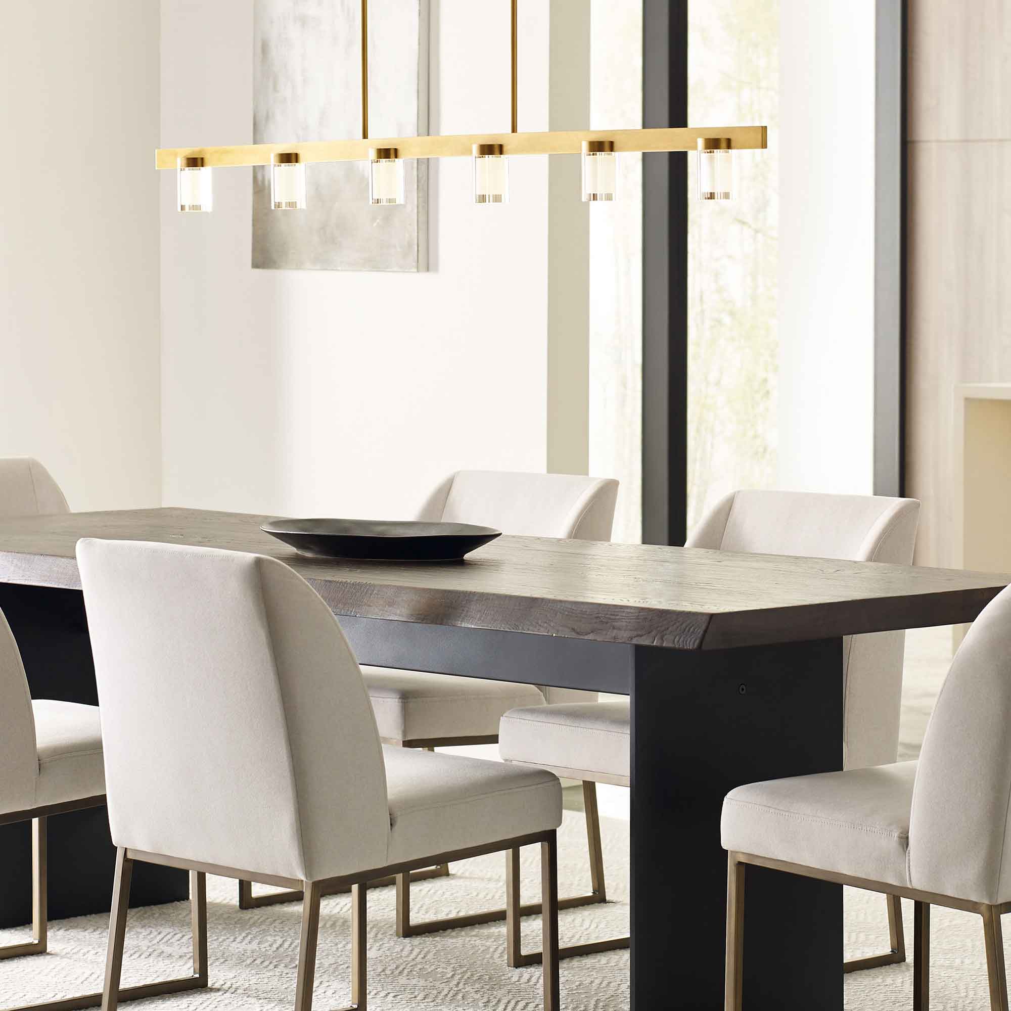 The Esfera LED Linear Pendant Light by Kelly Wearstler for Visual Comfort Modern realizes the beauty of elemental materials and spatial symmetries. In an elevated exchange of visual textures and clarity of form, the transitional design of this piece is a modern portrait of the convergence of cylindrical multi-dimensional prisms as integral sources of light with simple, linear metal detailing in varied geometric gestures as the connecting base.