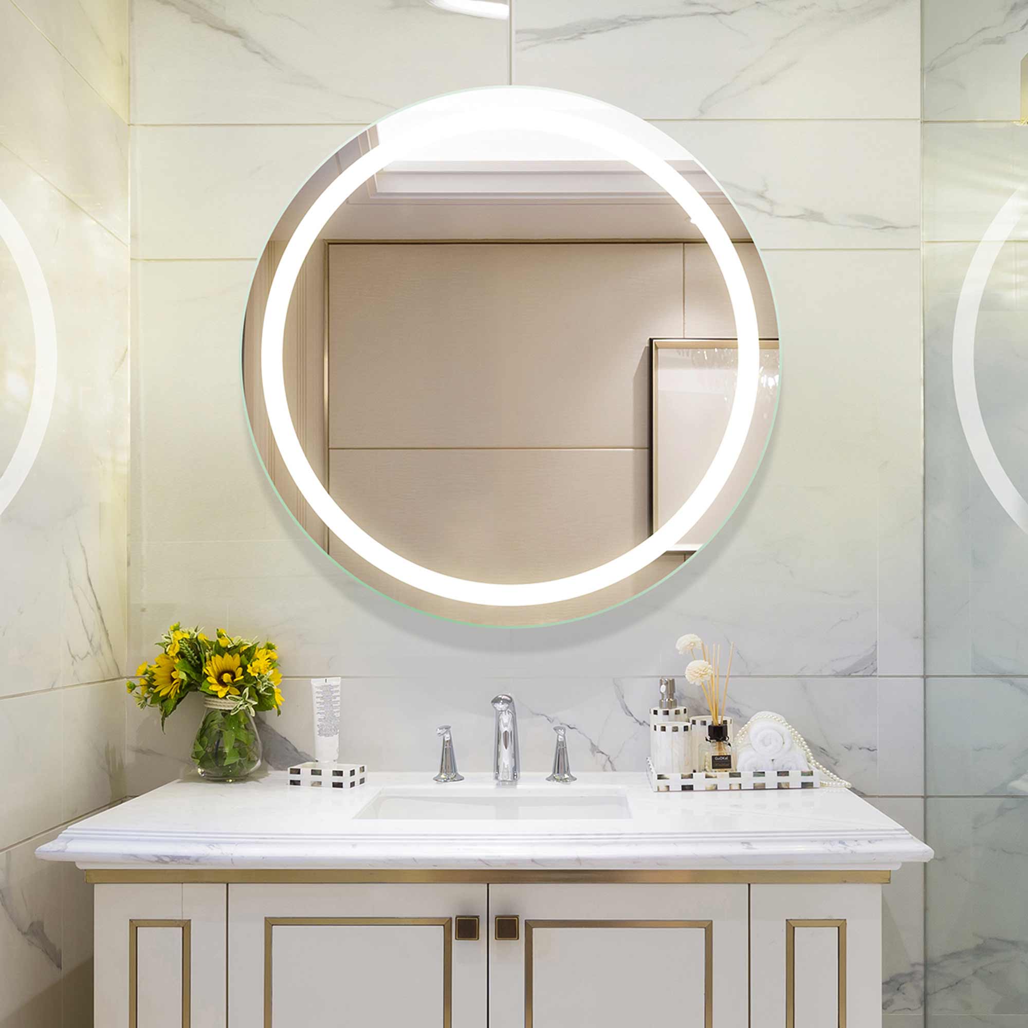 A circle of brilliant illumination glows from the edge of the round Eternity LED Lighted Mirror from Electric Mirror.