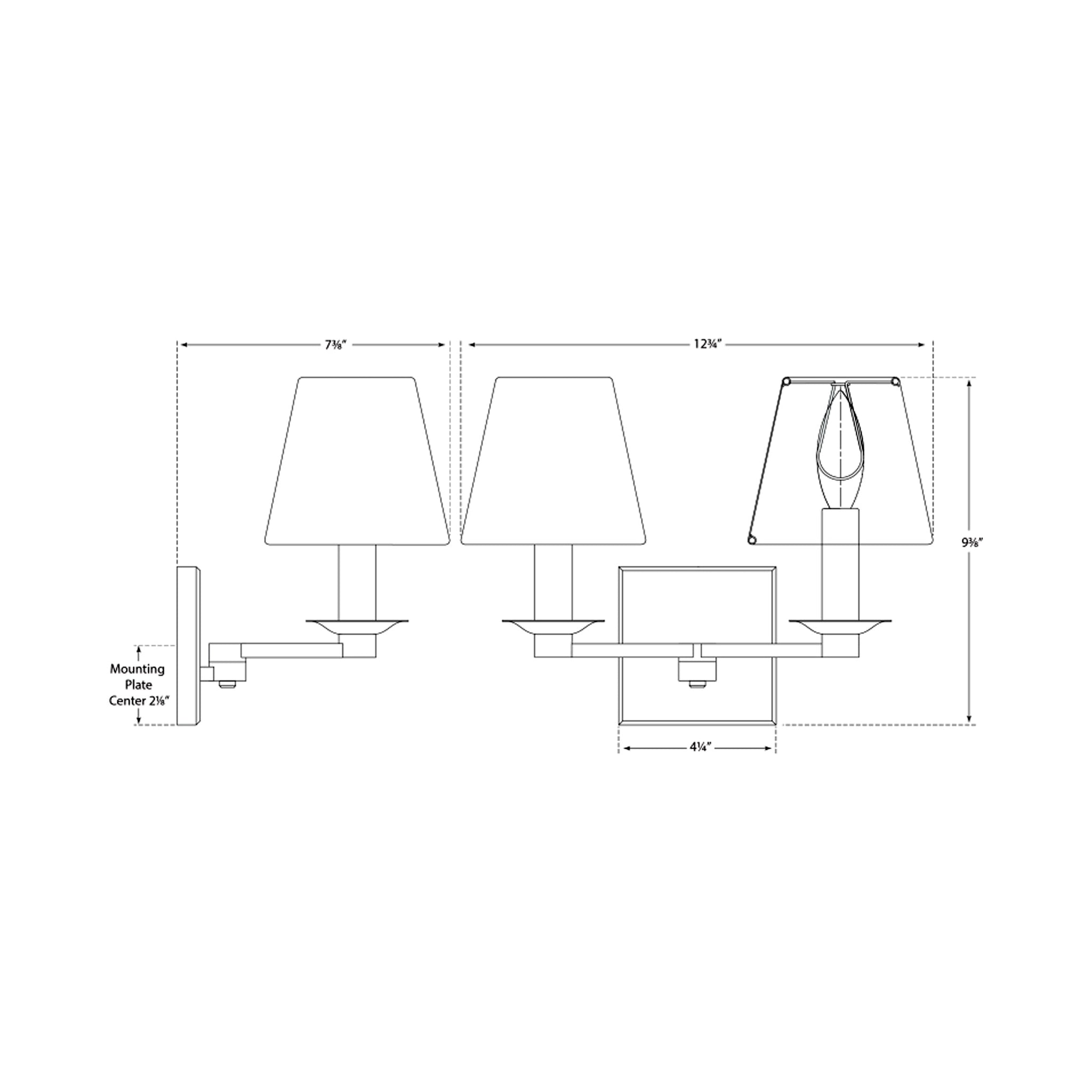 - 2-Light: 12.75"W X 9.38"H; 7.38" Extension