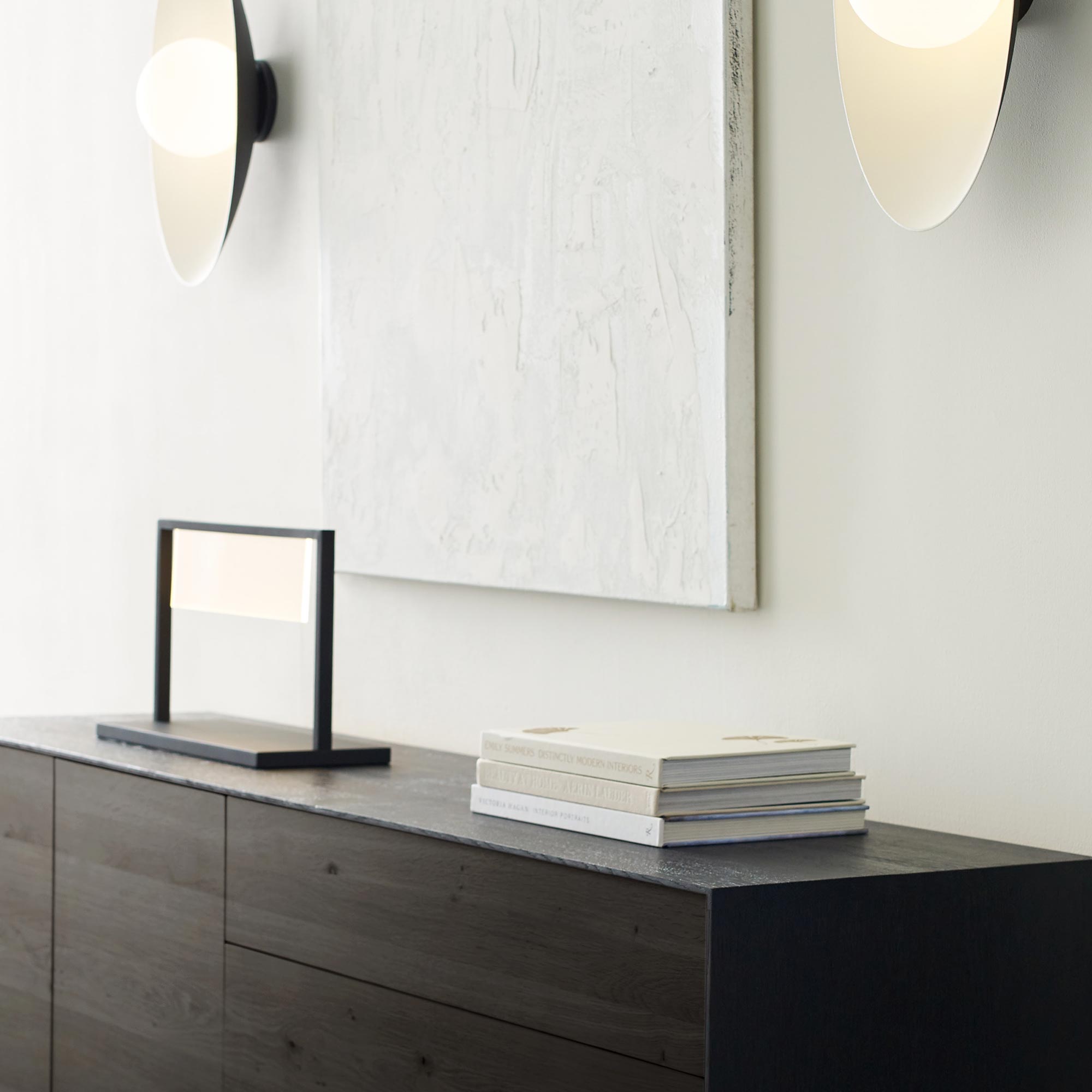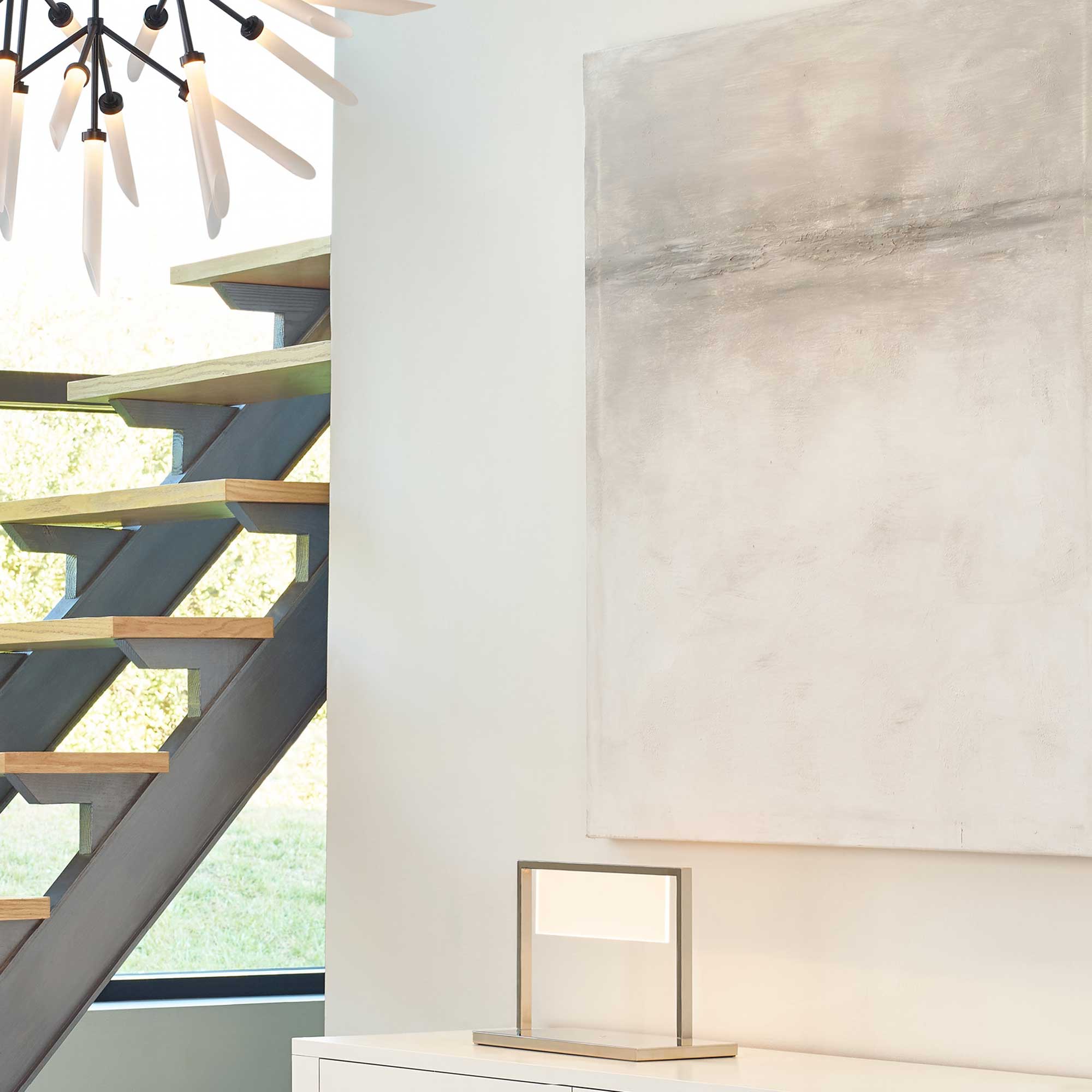 Marrying functional lighting with modern art, the Everett LED Table Lamp from Visual Comfort Modern is an intriguing, engaging choice to brighten your bedroom or living area. A slim, acrylic LED panel illuminated and suspends within an open frame, creating an eye-catching piece for a side table or credenza. An integrated three-step touch dimmer adds versatility, allowing for the creation of just the right atmosphere.