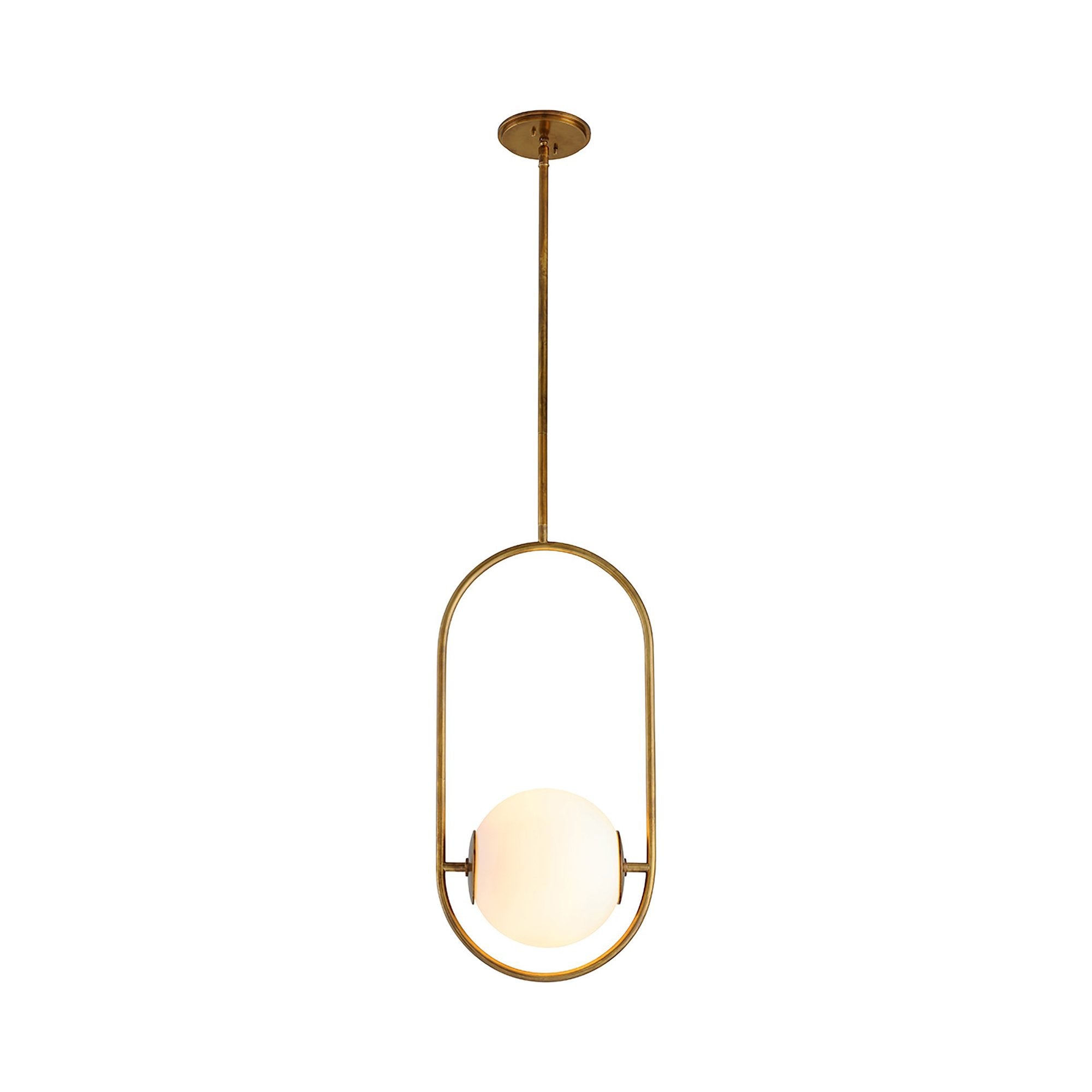 With an open concept design and retro feel, the Everley Pendant Light from Corbett Lighting creates a delightful aesthetic mixing vintage brass finish metal with a charming opal white glass orb shade.