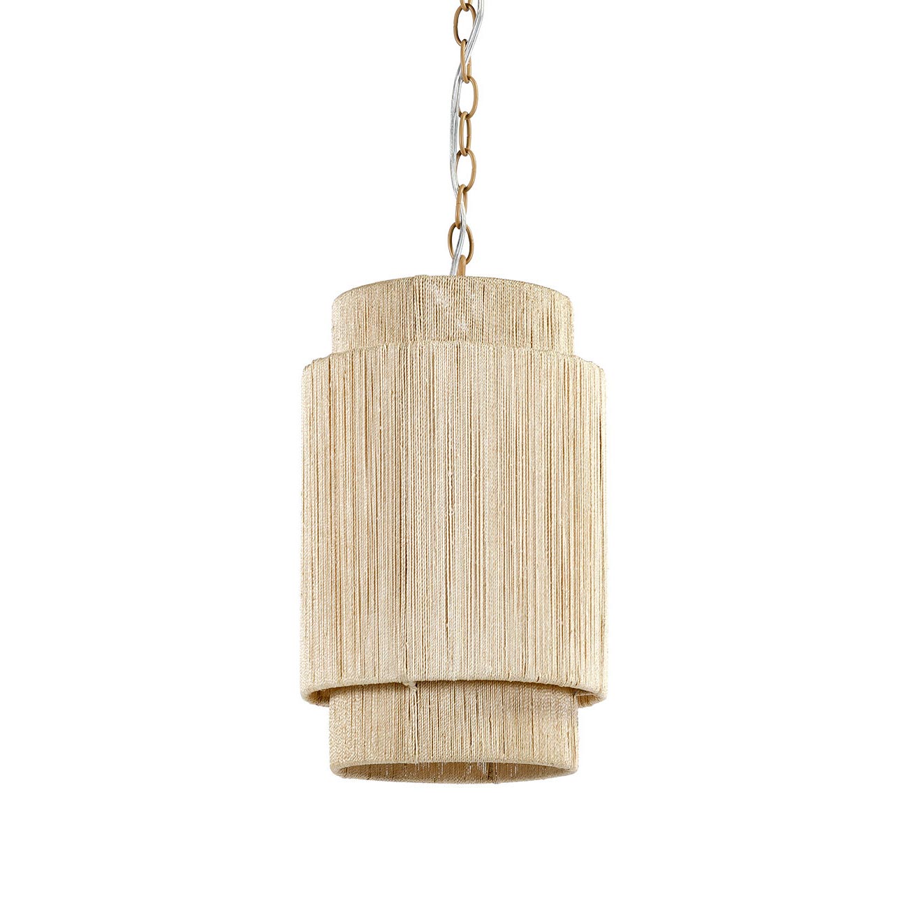 Distinctive cylinders of fine abaca rope create a layered effect for the contemporary Everly Pendant Light from Palecek. Its rugged texture and natural coloration complement a power coated metal frame that creates dynamic structure over a breakfast nook or in an entryway.