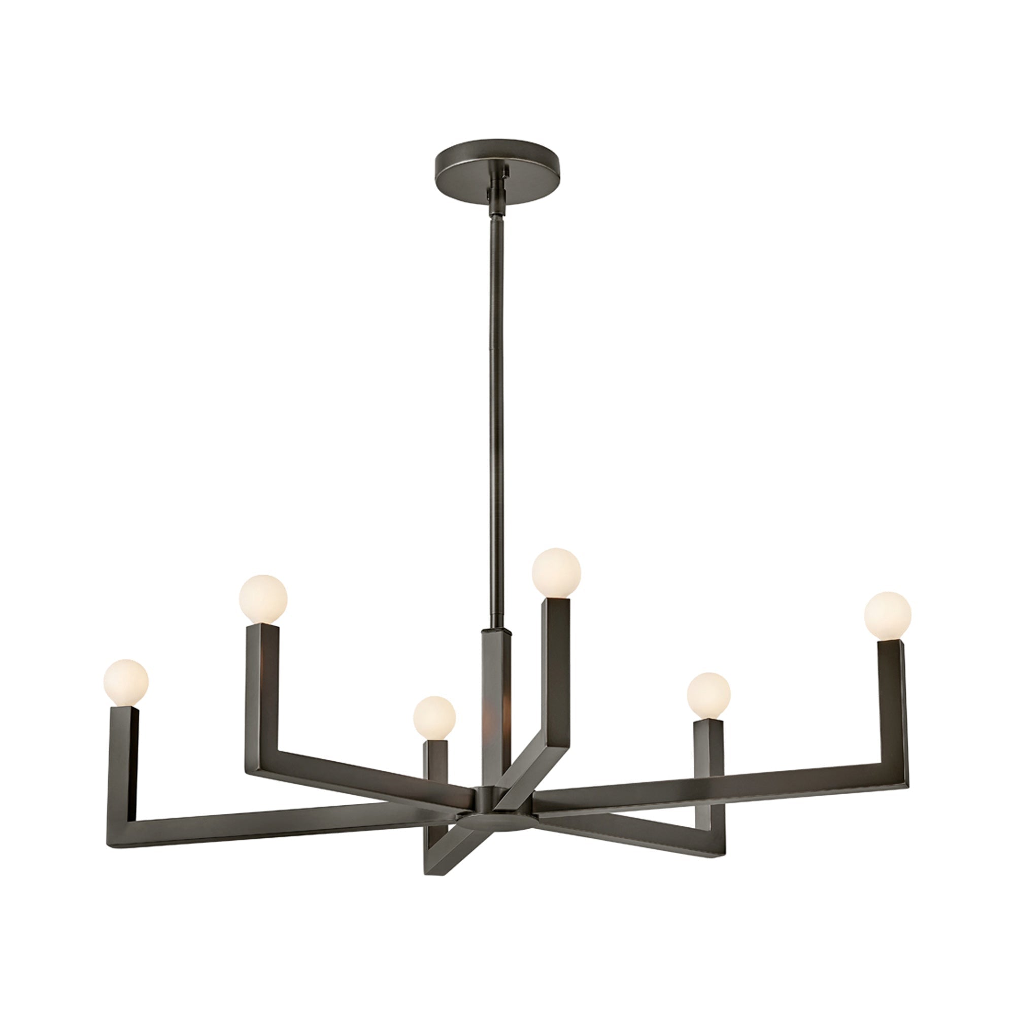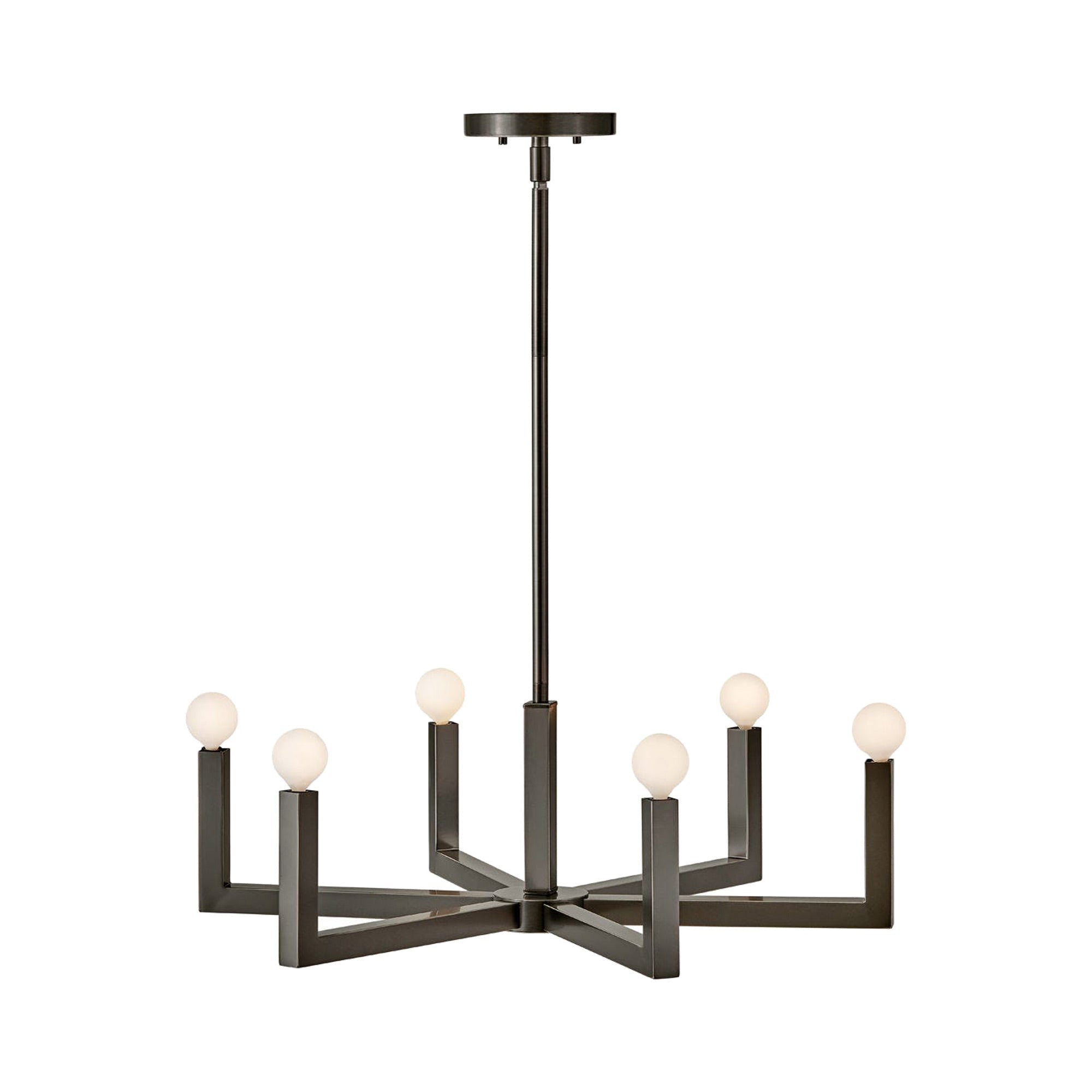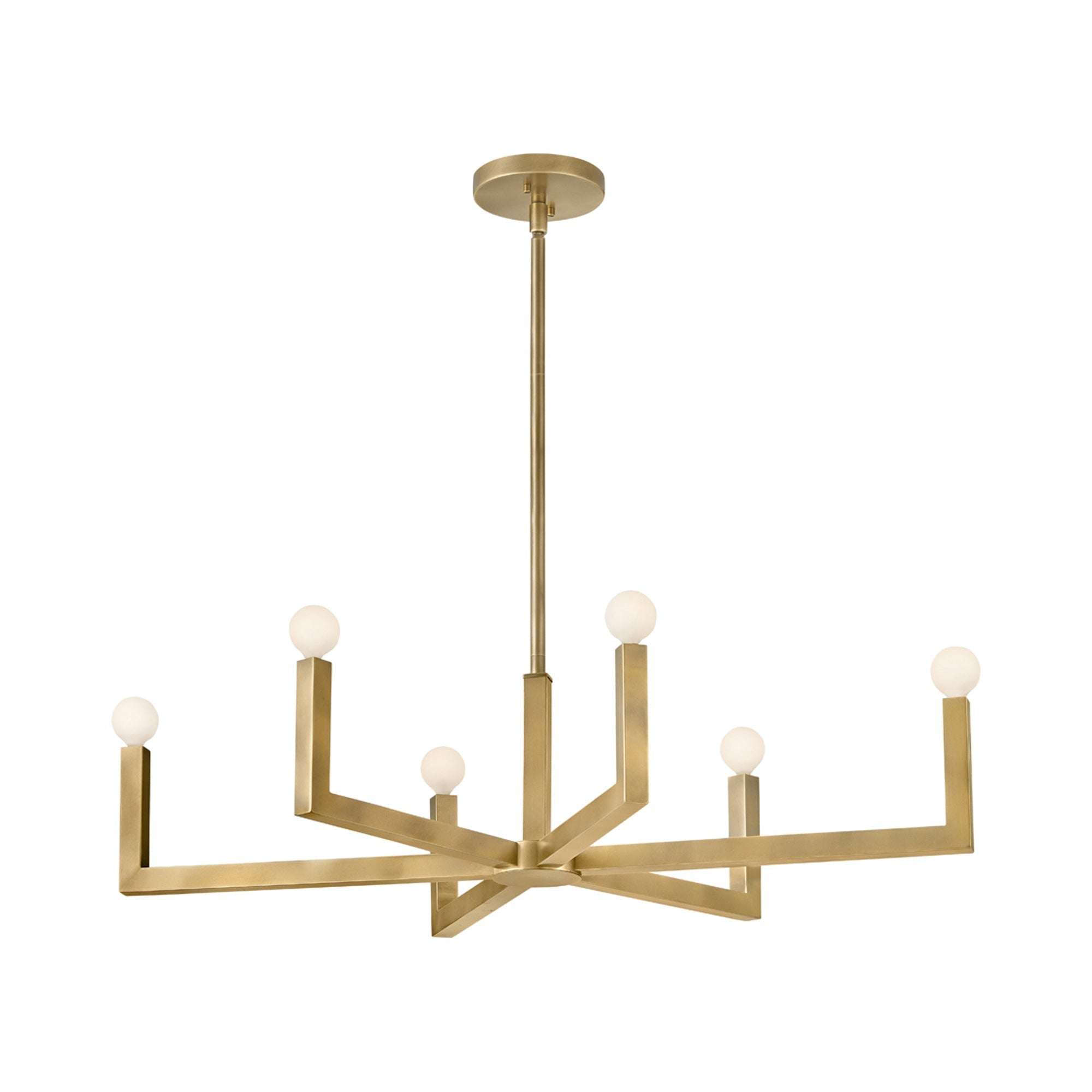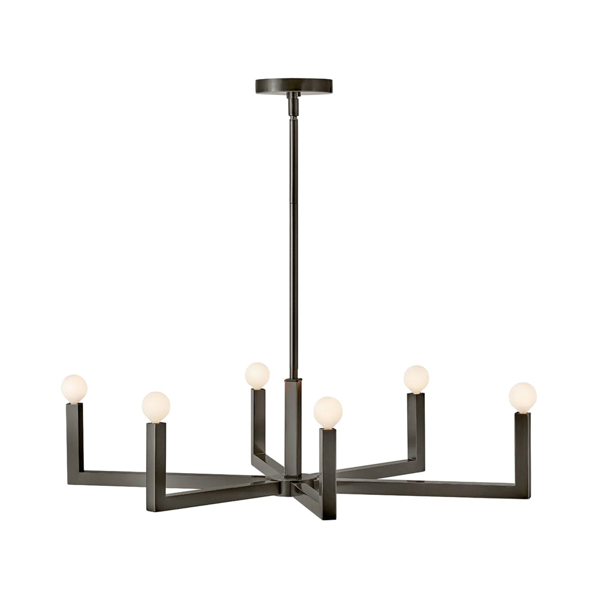 The Ezra family stunningly pairs minimalist elegance with industrial edge. Strong square arms set at 45° angles intersect to create a rounded chandelier and oval linear chandelier design in black oxide and heritage brass finishes.