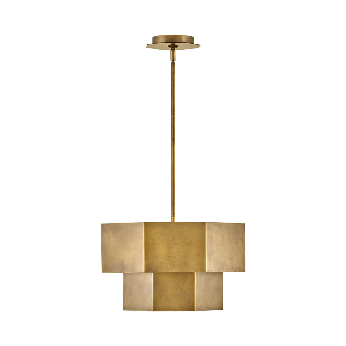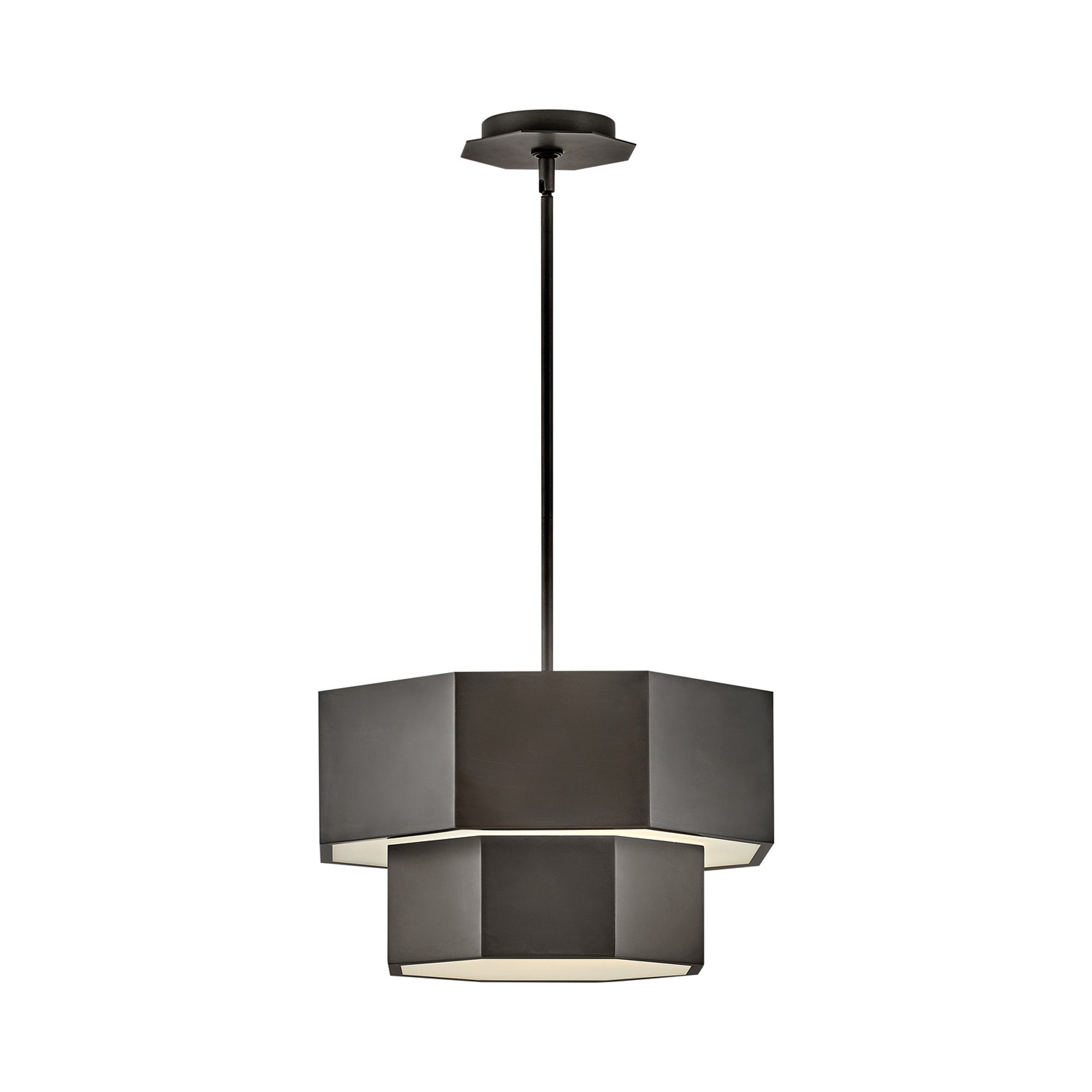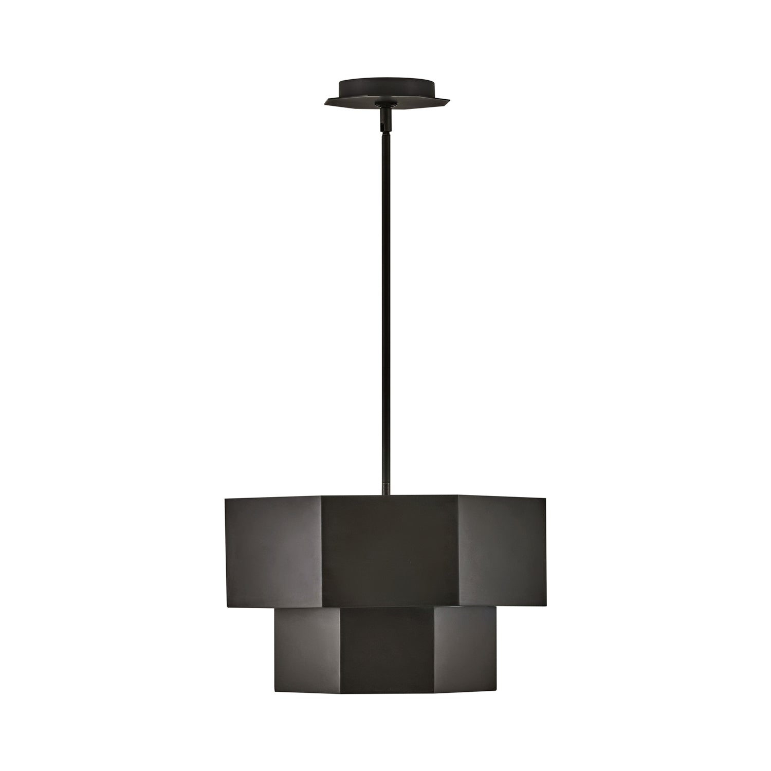 Geometric elements dress up an updated version of Mid-Century Modern and retro styles with a light fixture that creates a signature statement. The Facet Semi-Flush Mount Ceiling Light from Hinkley offers the ultimate in customization with several included down rods to change from a flush mount to a longer chandelier configuration. Facets reflect an appropriate name for this metal two-tiered light with a hexagonal diffuser that sends glowing LED light downward from its double lamped configuration.
