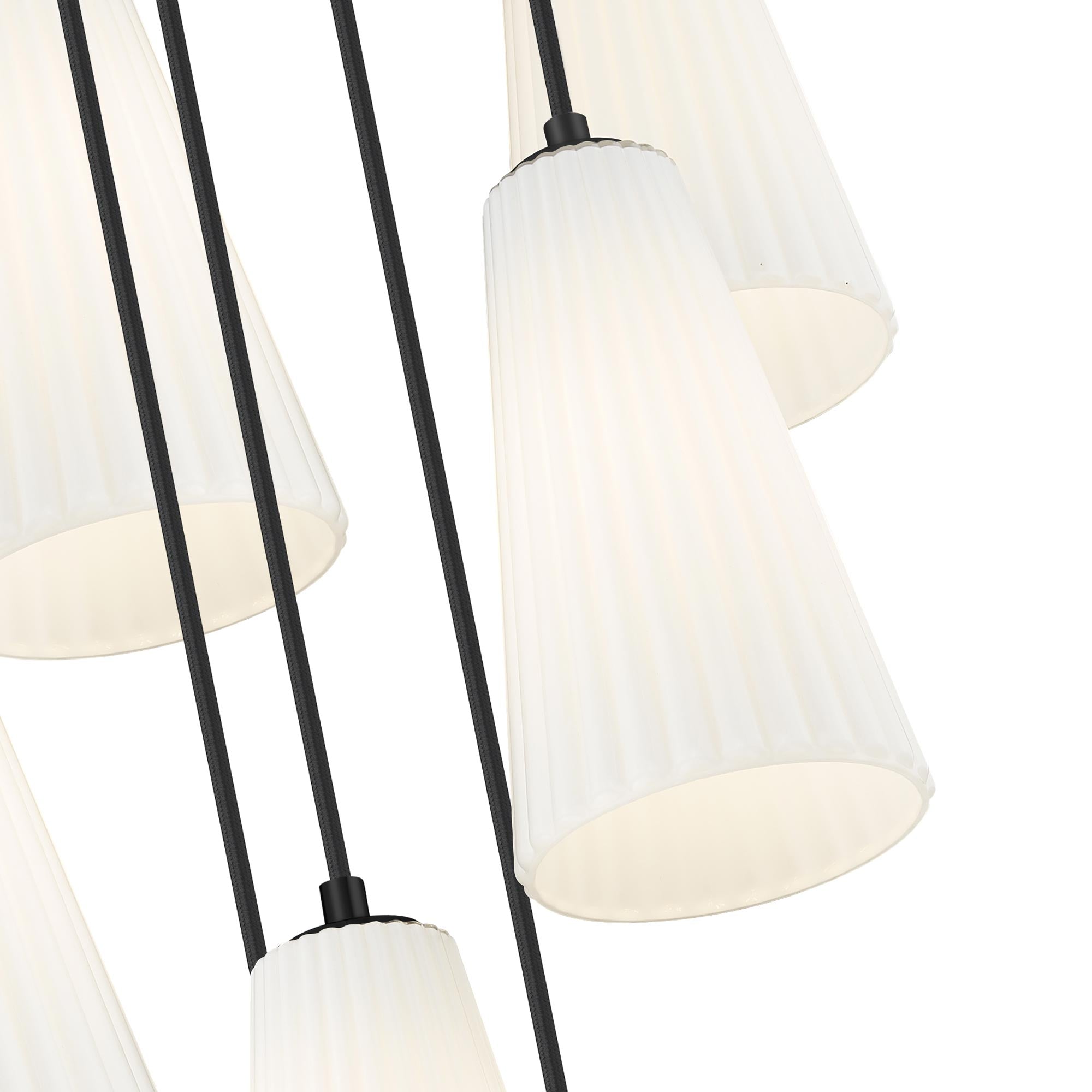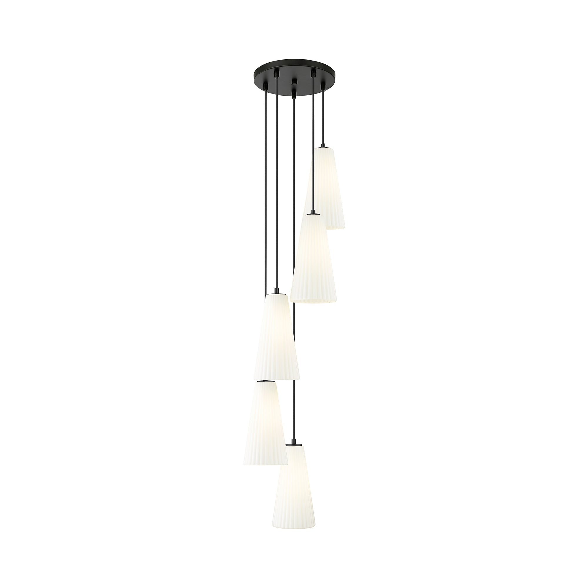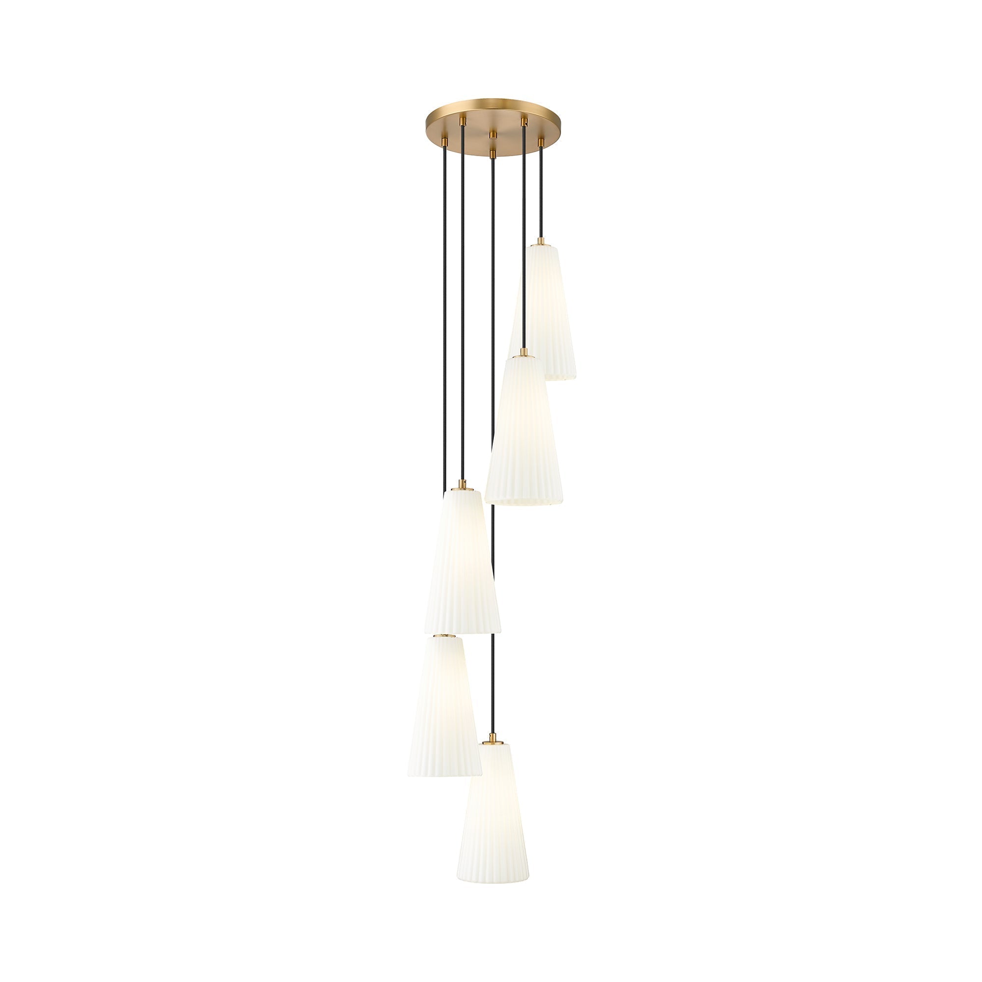 Festive with a bell motif, the Farrell Multi-Light Pendant Light from Z-Lite creates a light aesthetic from a fashionable interior light fixture. Graduated lengths of chic white tapered shades dangle from a round canopy, offering a virtual shower of shapely elements.