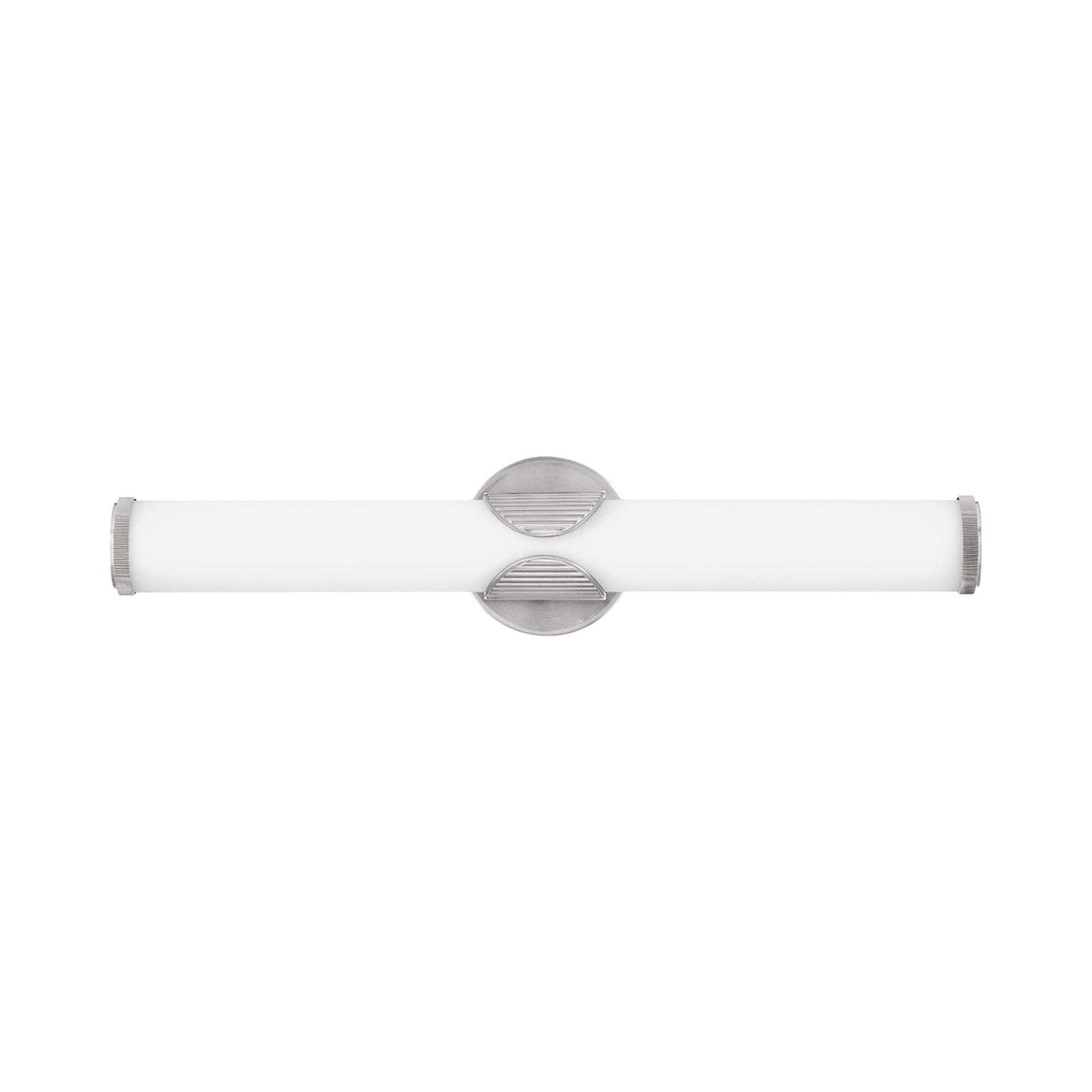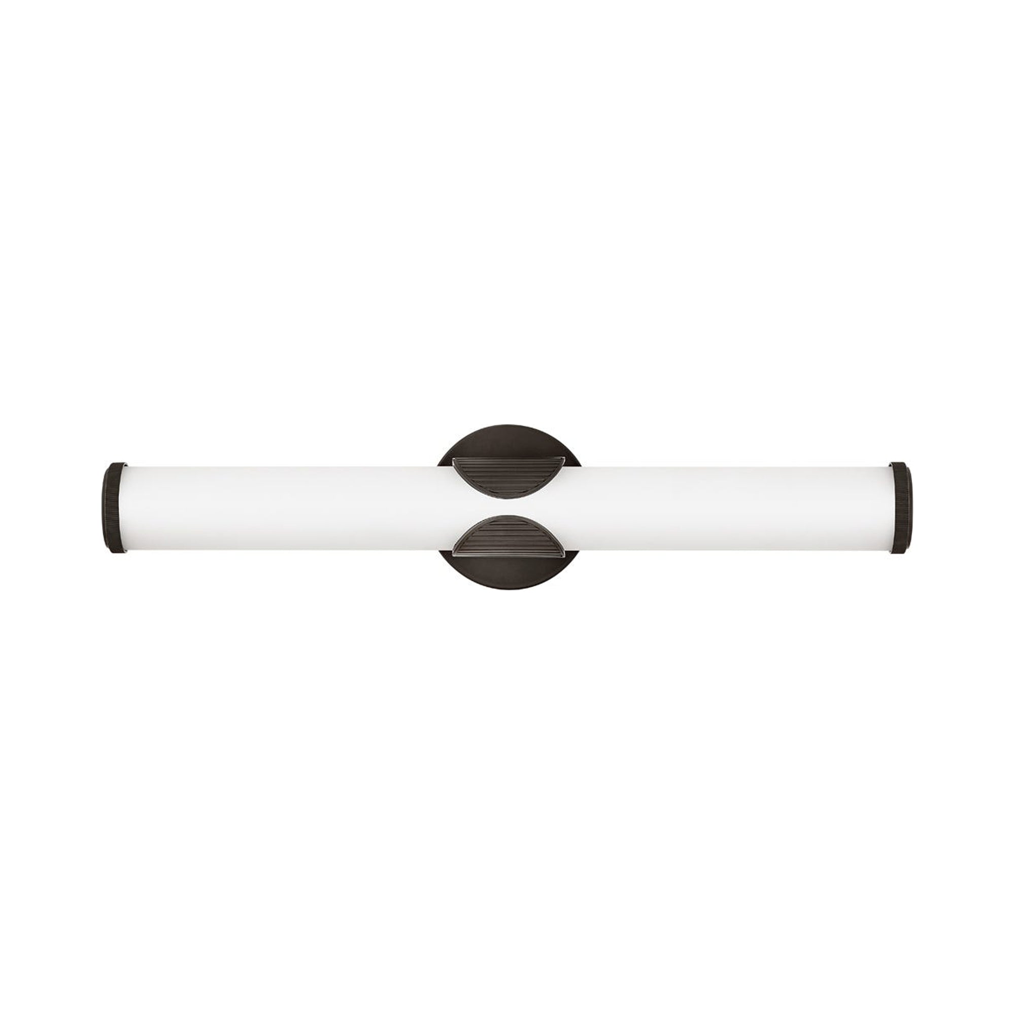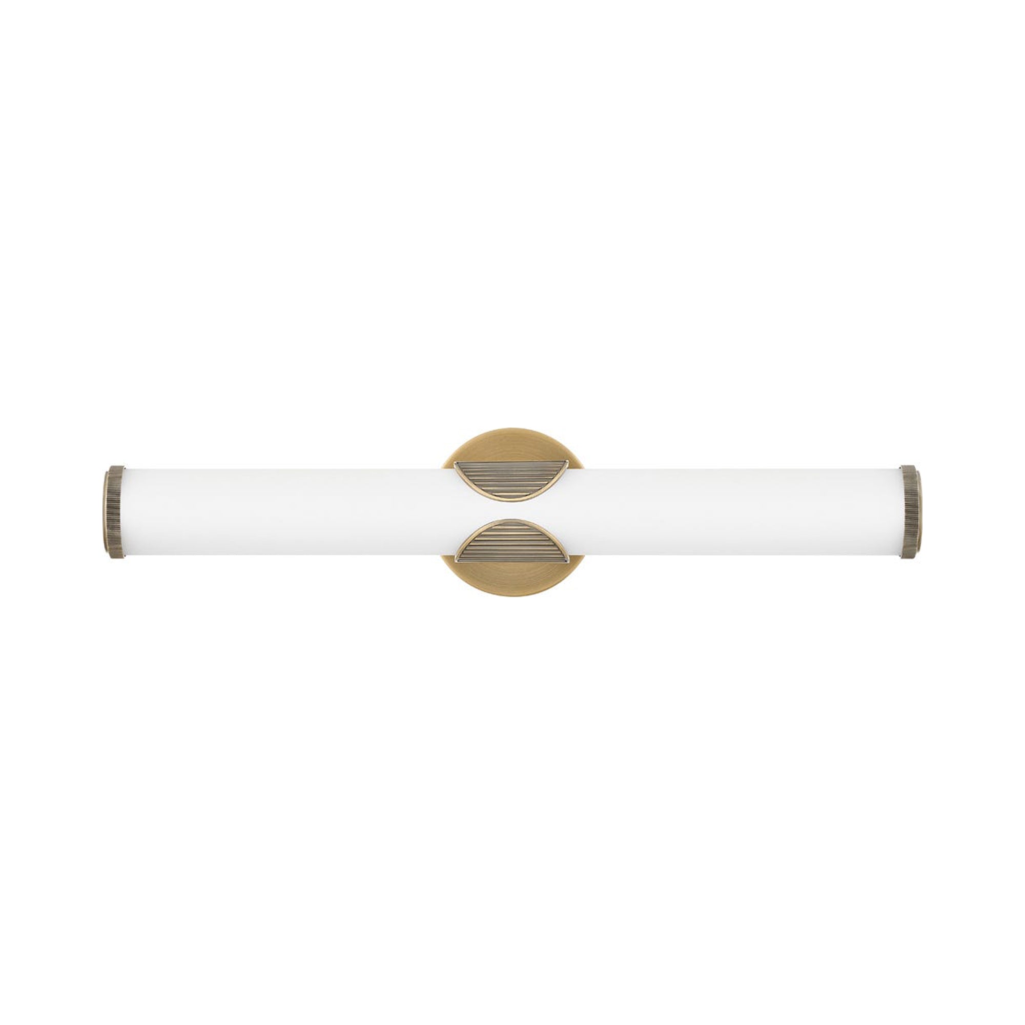 Just a touch of artisan flair highlights an Art Deco look in the Femi LED Bath Vanity Light from Hinkley. Step back to a mid-century era to appreciate the cylinder shape of an energy-efficient light with a cylindrical etched opal glass shade nestled into metal framing.