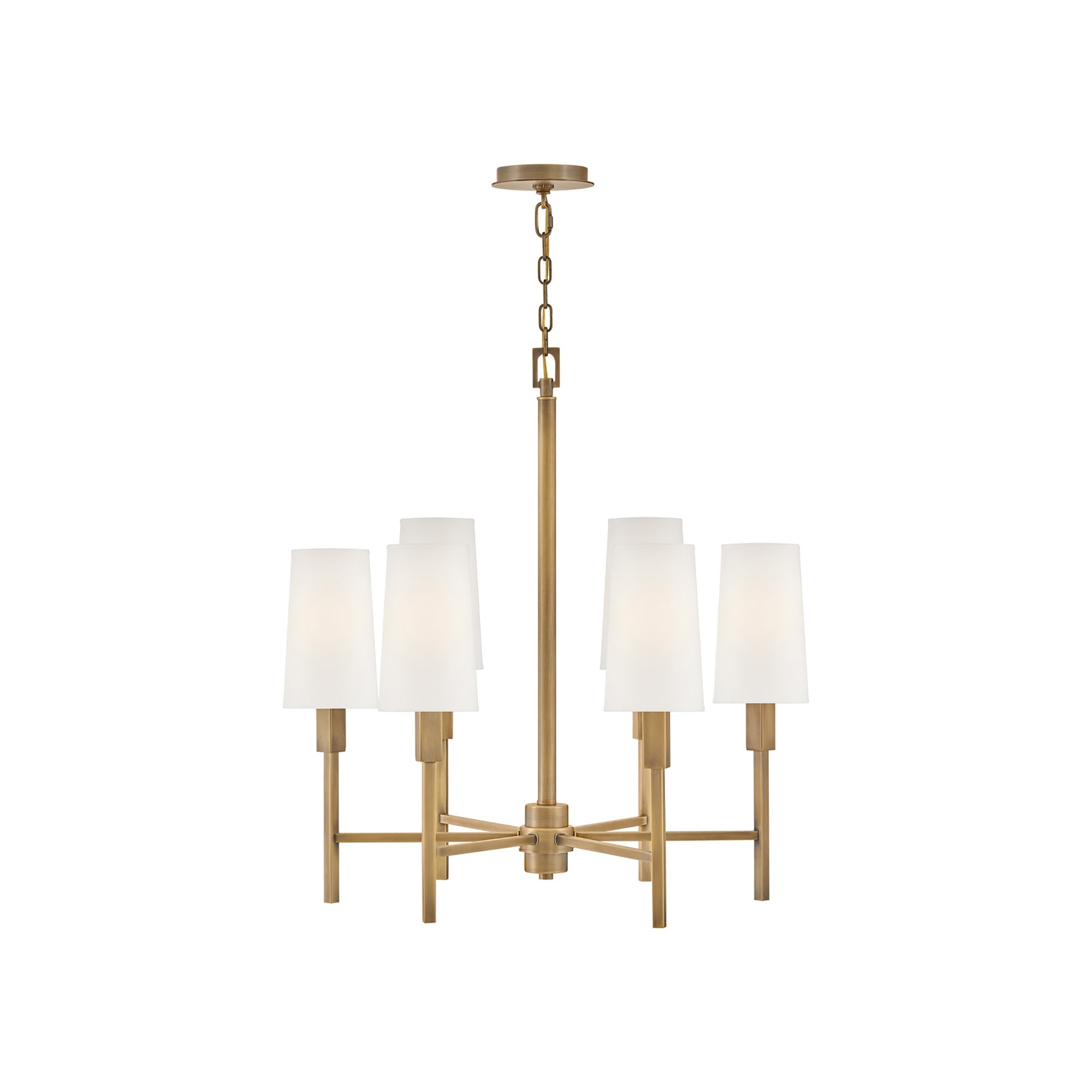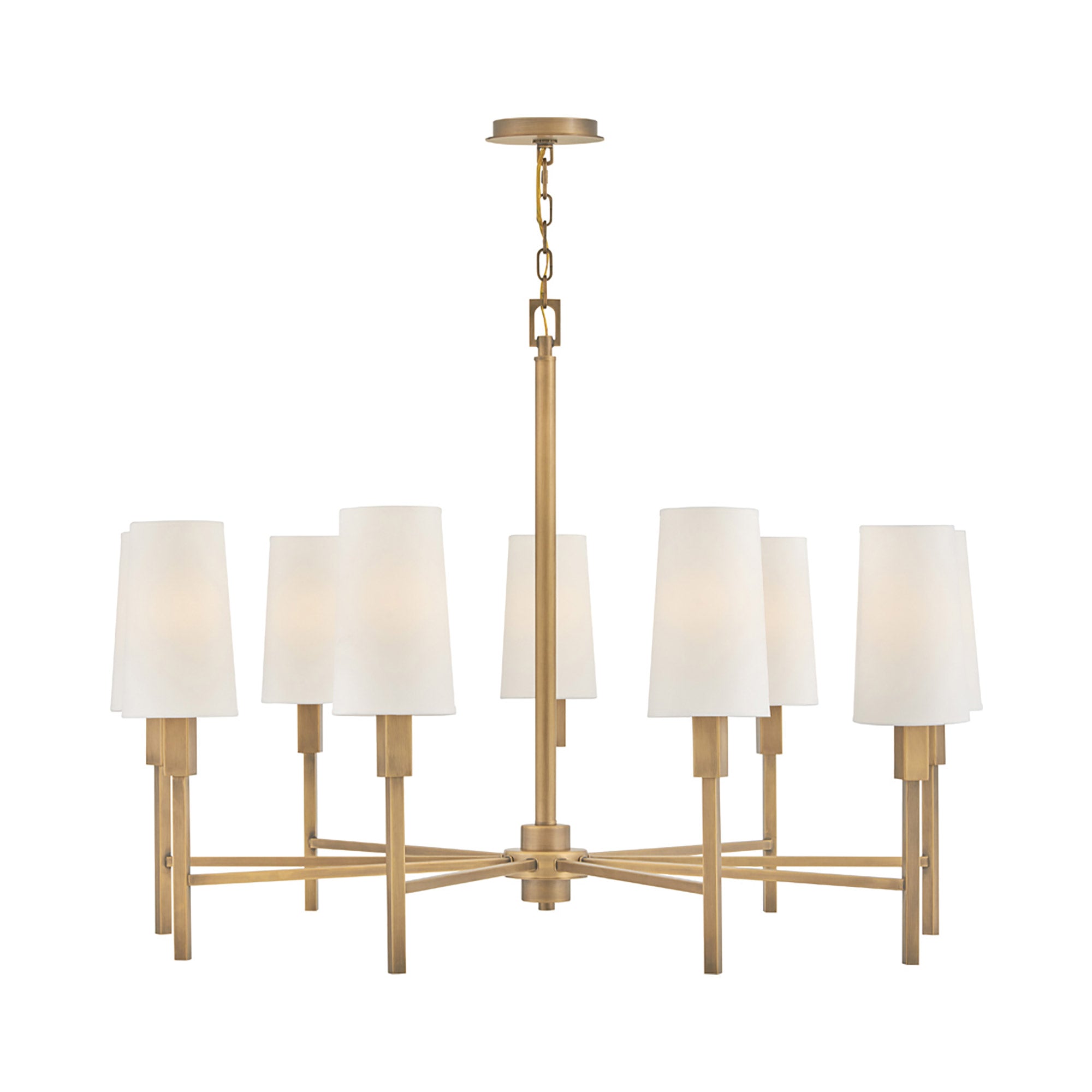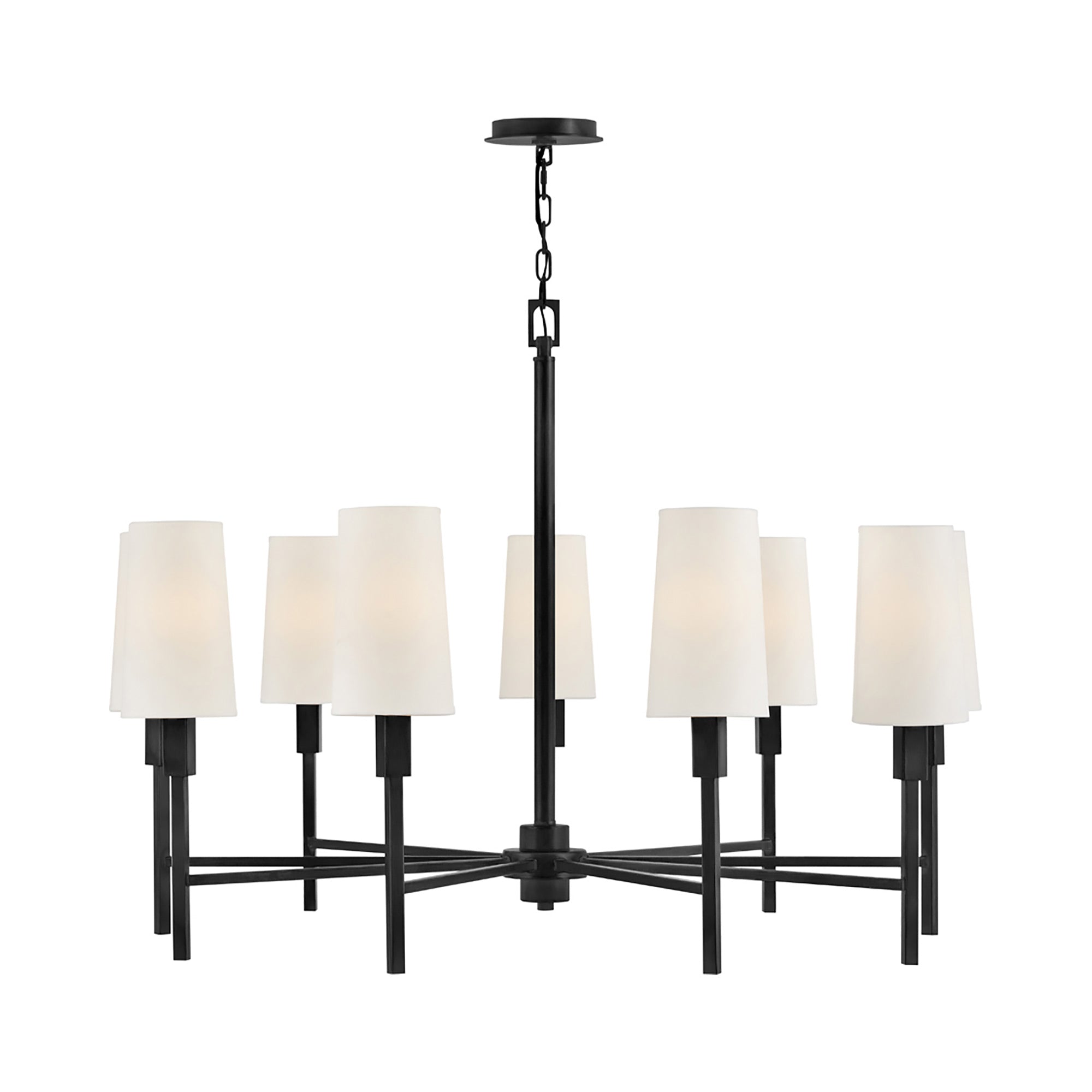 Embrace a bit of tradition as you update a custom space with lighting working its way into a design scheme. Shaded lamps surround metal framing as the Fenwick Chandelier from Hinkley plays on proportionality and simplicity, weaving the two together with metal framing and natural paper shades.