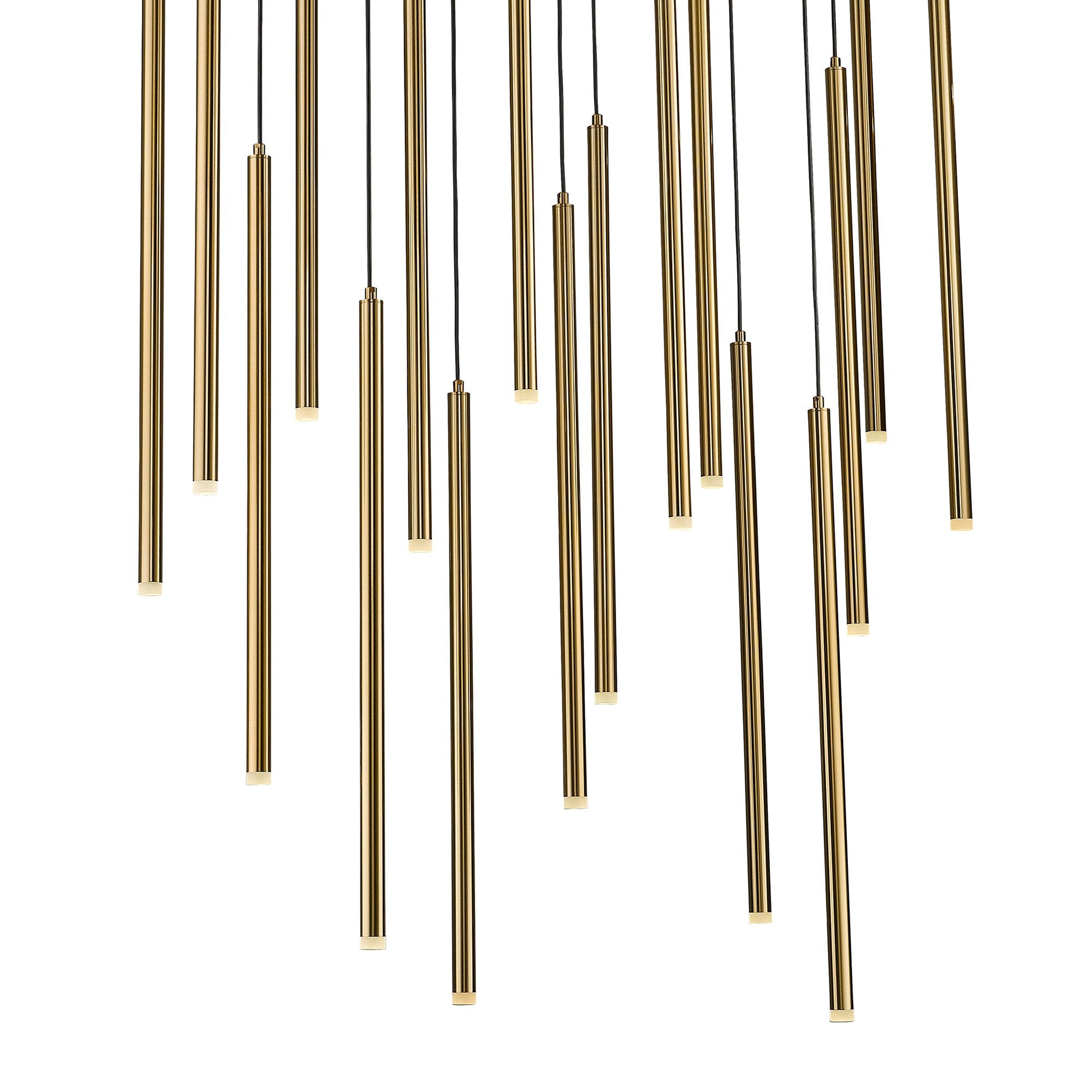 The cascading antique brass rods give the Filmore Ave. LED Linear Pendant Light a dramatic effect. Artfully evoking rainfall, 17 slender tubes that are suspended asymmetrically from a sleek canopy, casting a dramatic glow.