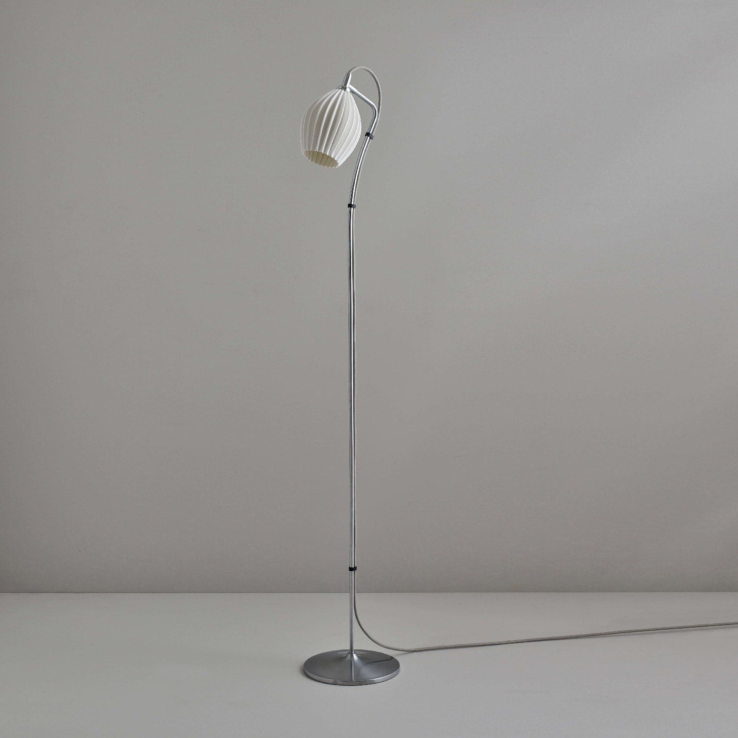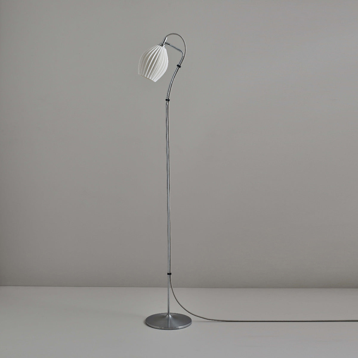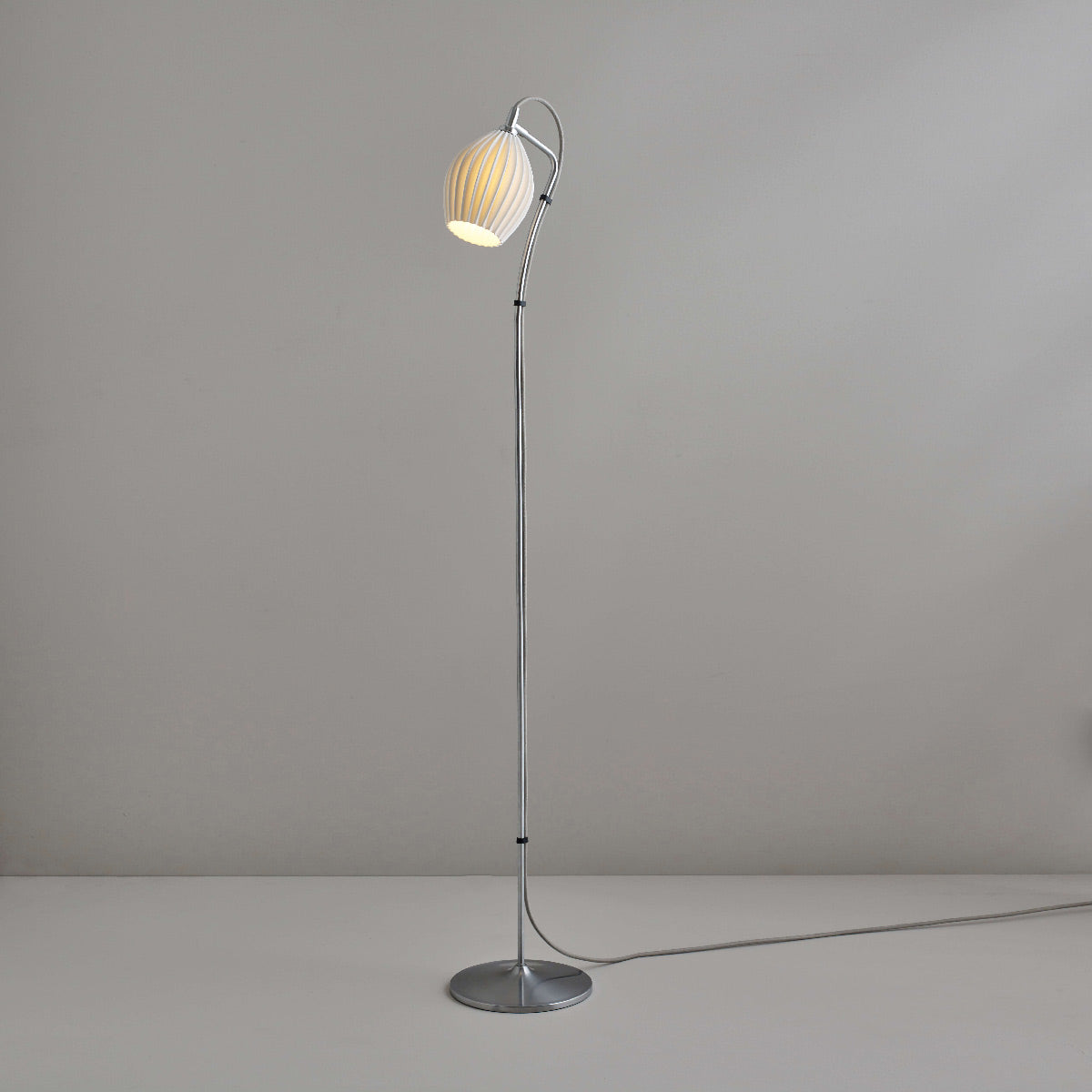 A careful study of the artistry creating this chic lamp produces a dual purpose of artisanal elegance and functionality. Perfect for all settings, the Fin Floor Lamp from Original BTC rests on a curvy silhouette to capture attention, as minimalism turns charming with an organic bone china tulip shade. Lighting is soft and glowing, with a bonus of a chrome finish metal stem and gray cotton braided cable.
