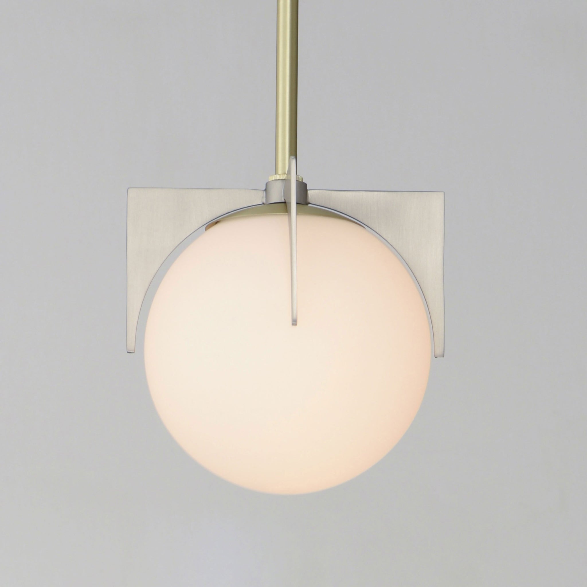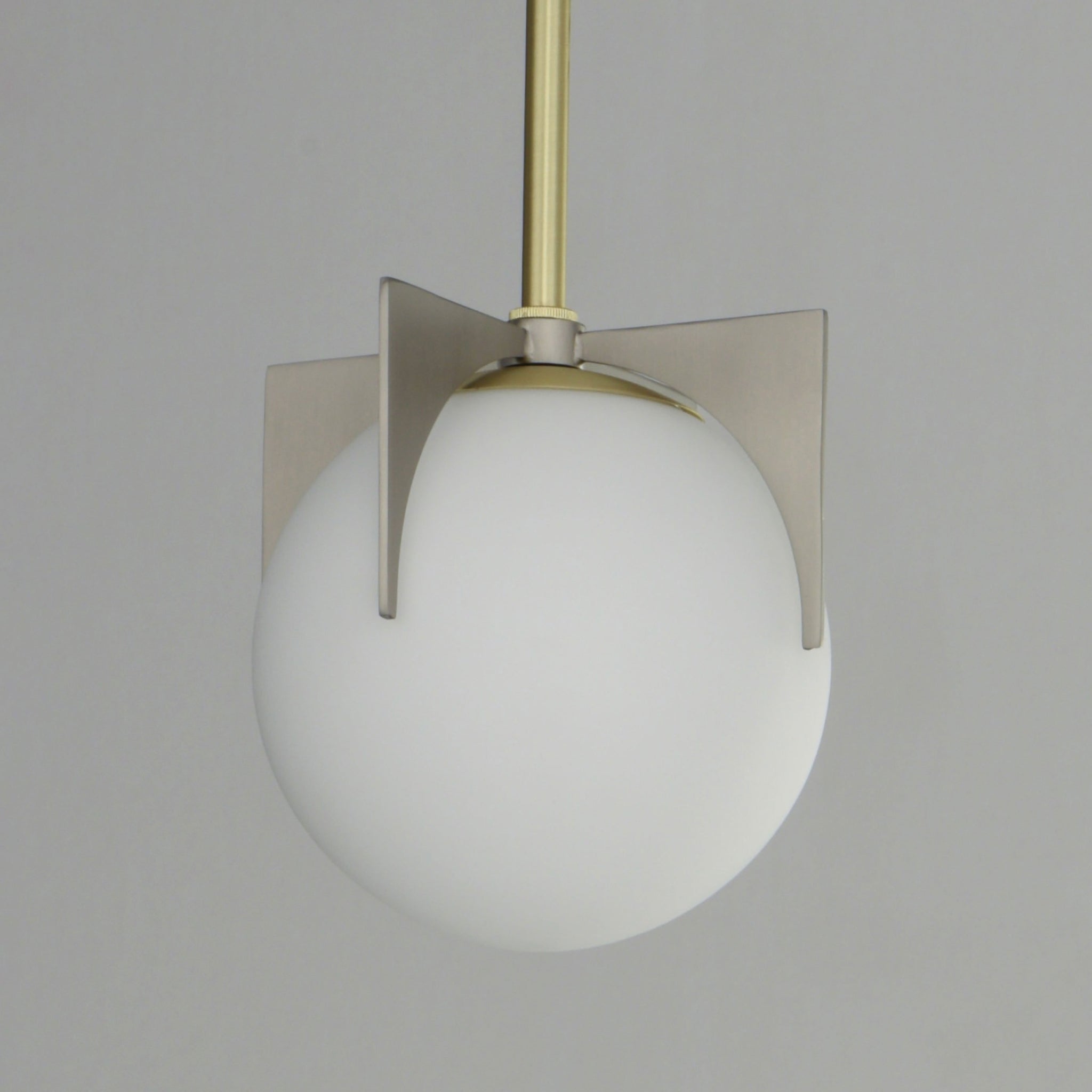 A homage to Mid-Century Modern design, the Finn collection features large Satin White opal glass shades on a contemporary finish combination of Satin Brass and Brushed Platinum. The glass shades are embraced by laser cut fins to create a clean, yet dramatic look.