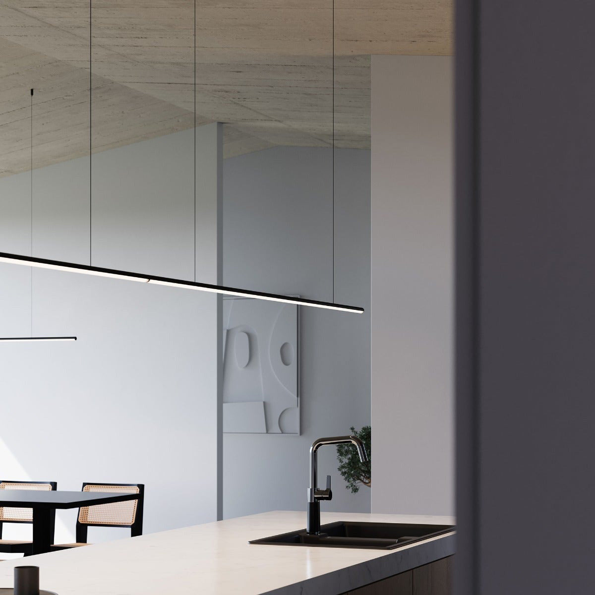 The powerful design effect of subtle simplicity works wonders in a contemporary space as the Fino™ LED Pendant Light from Sonneman takes seriously its objective of delivering energy-efficient illumination. Sleek and sophisticated with a minimalist linear design, this fixture is a superb choice in a host of settings craving soft, even lighting. Thin cables suspend a slender metal frame and continuous diffuser that highlights kitchen islands, workspaces, foyers, or living areas.