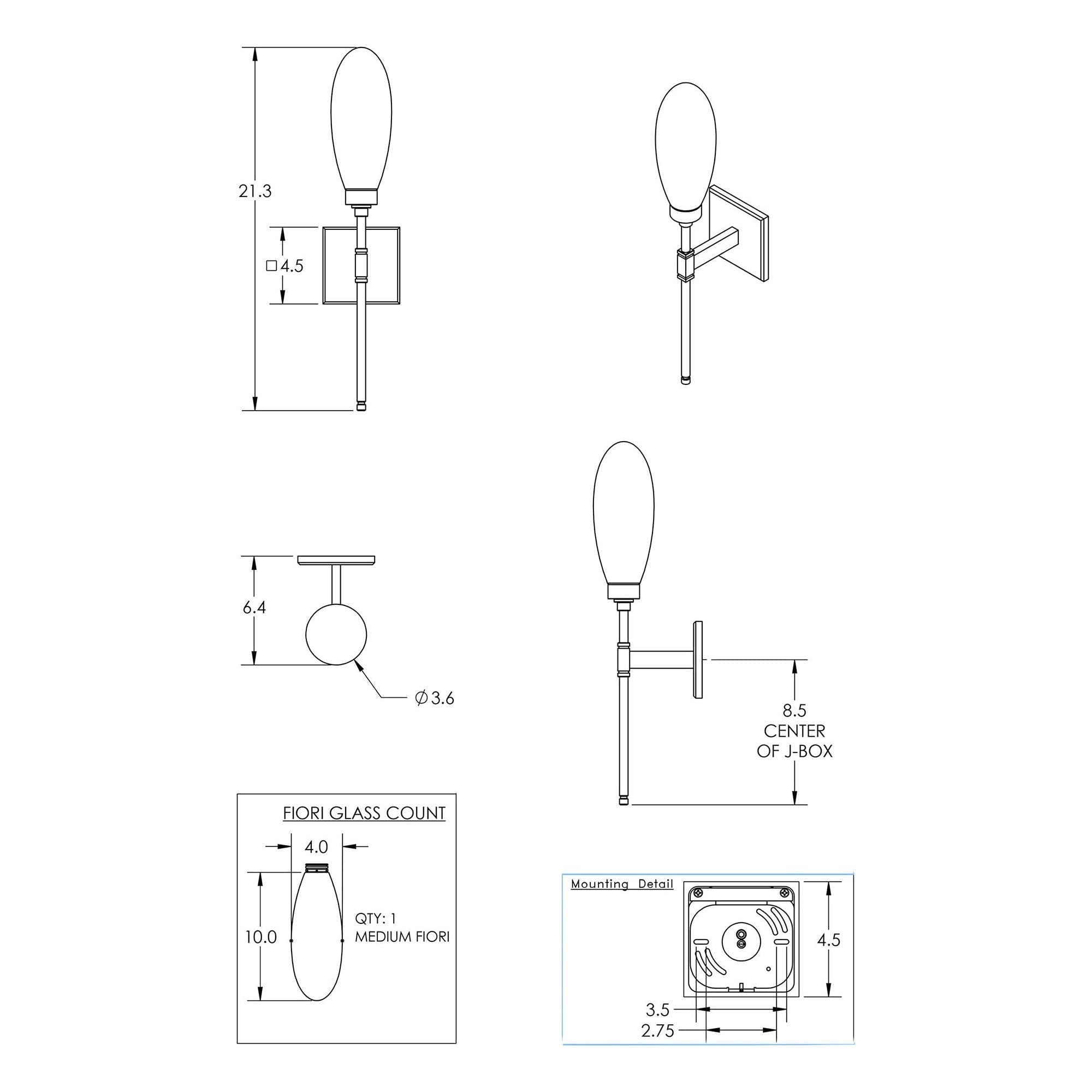 - 1-Light: 4.5"W X 21.3"H; 6.4" Extension
