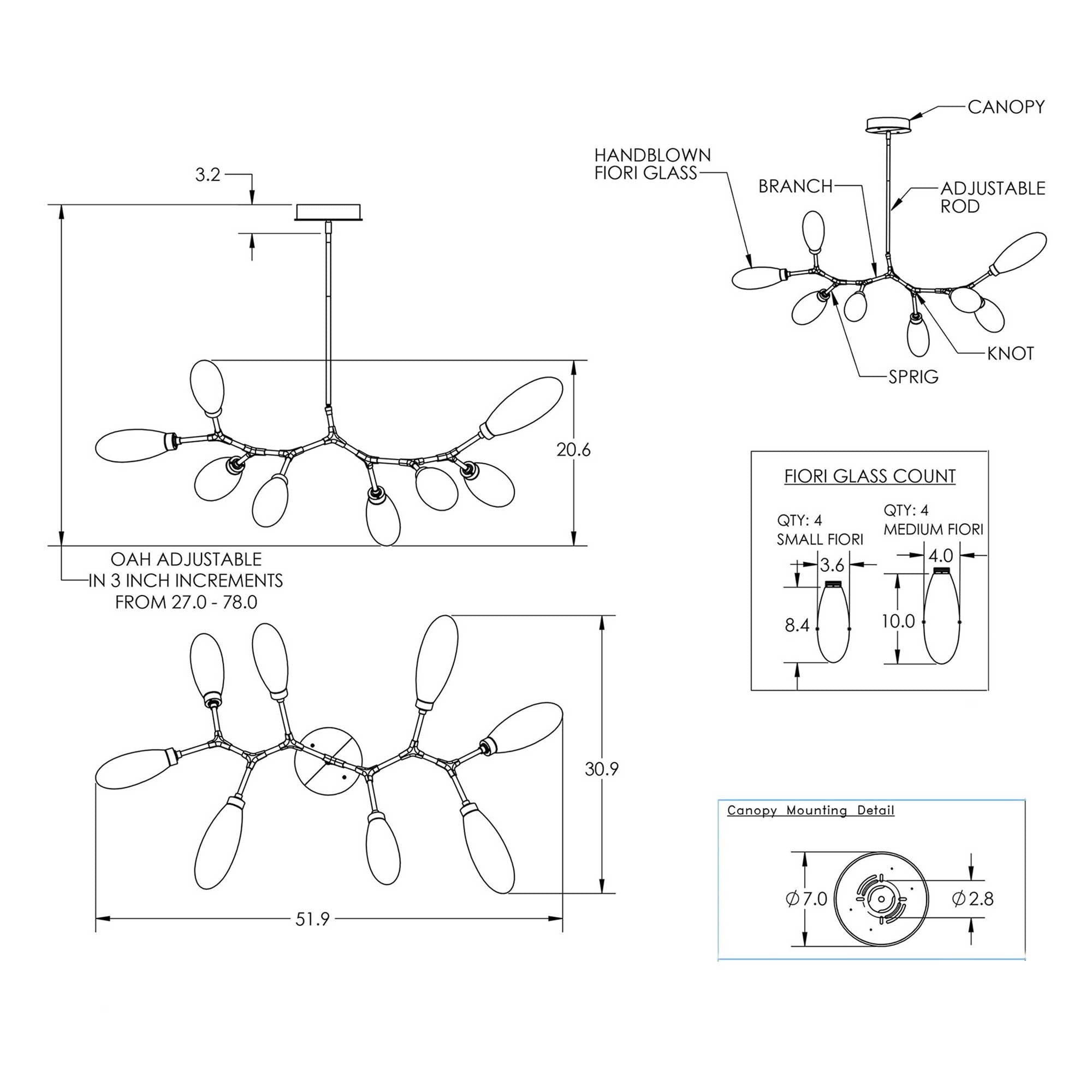 Artisan blown glass buds dazzle on the branch-like frame of the Fiori Modern Branch LED Pendant Light from Hammerton Studio. Its organic nature is suffused with the elegance of glowing white glass and soft curvature.