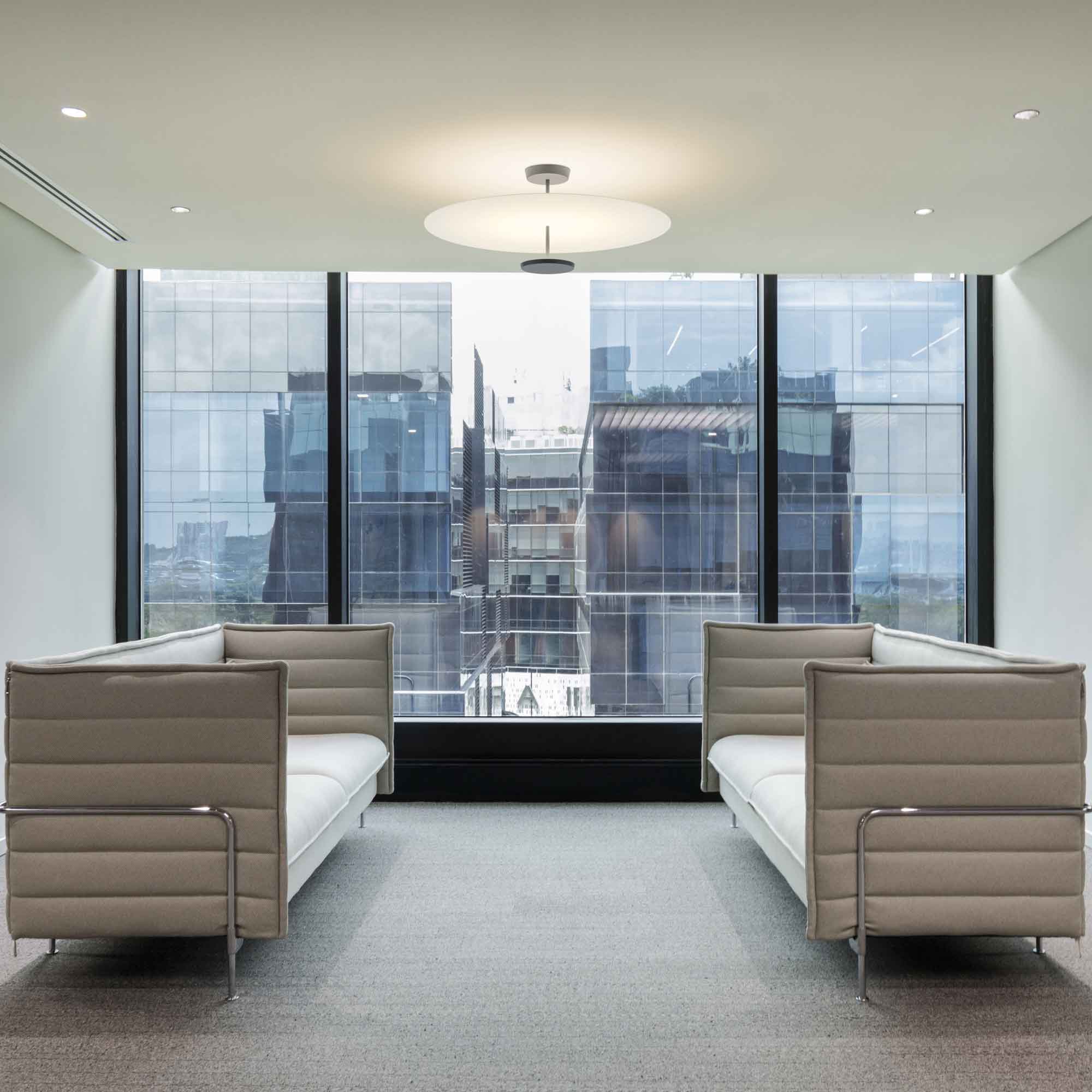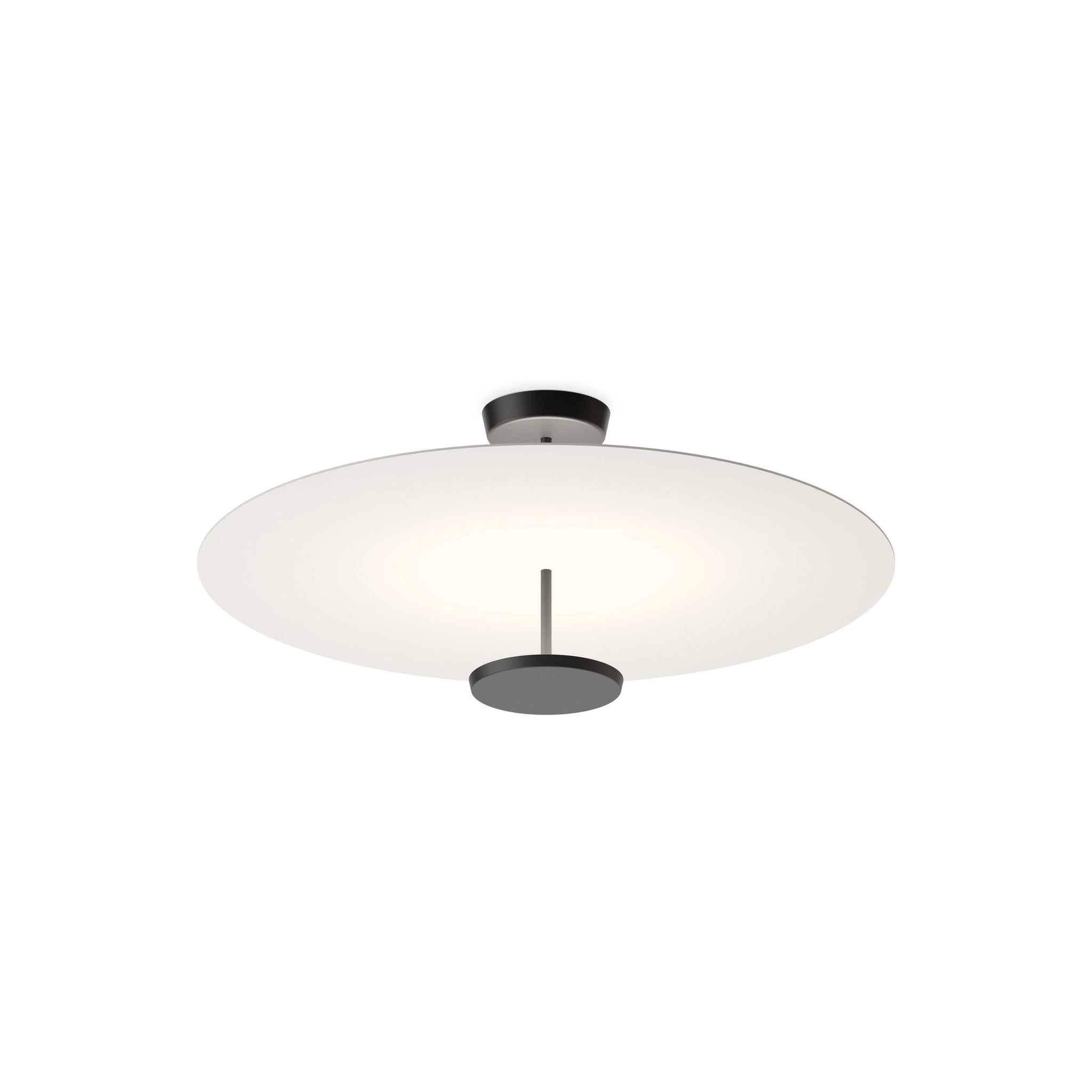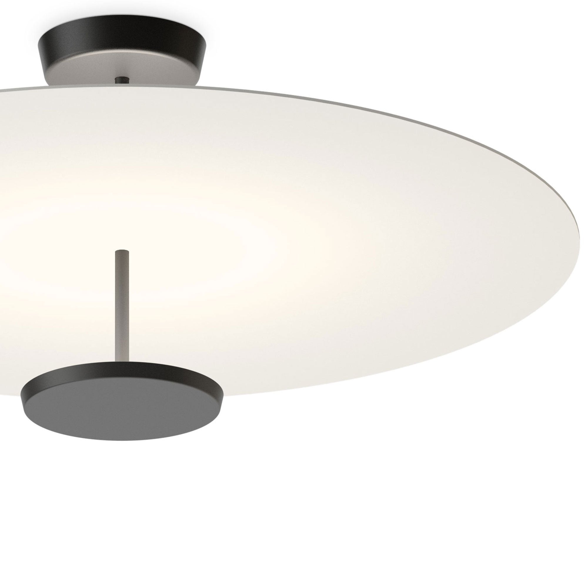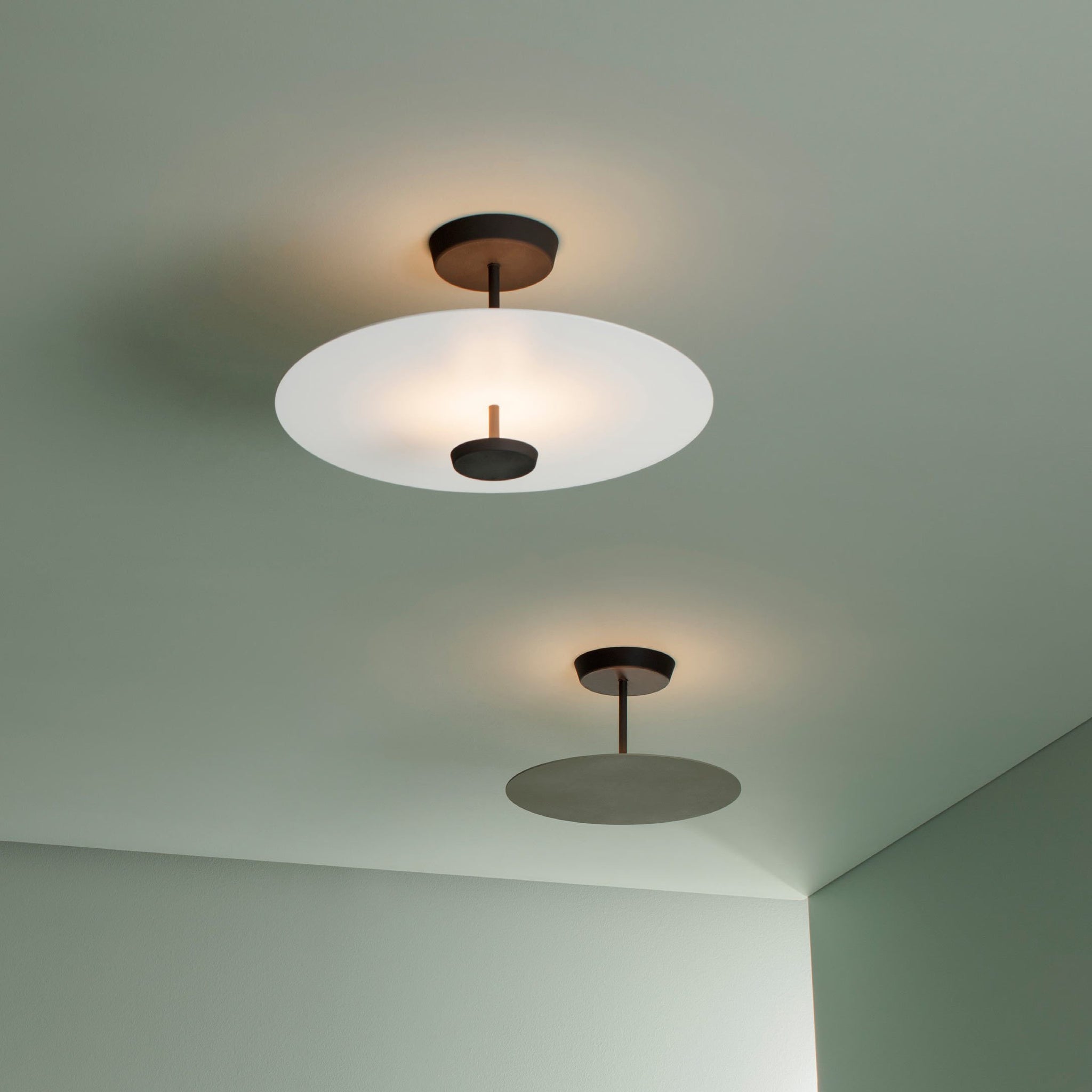 Flat LED Semi Flush Ceiling Light is a lamp composed of two horizontal discs at various heights that create planes of reflected light. The discs are self-illuminated by reflected light. The Flat LED Semi Flush Ceiling Light has a strong graphic quality, combining structure and functionality.