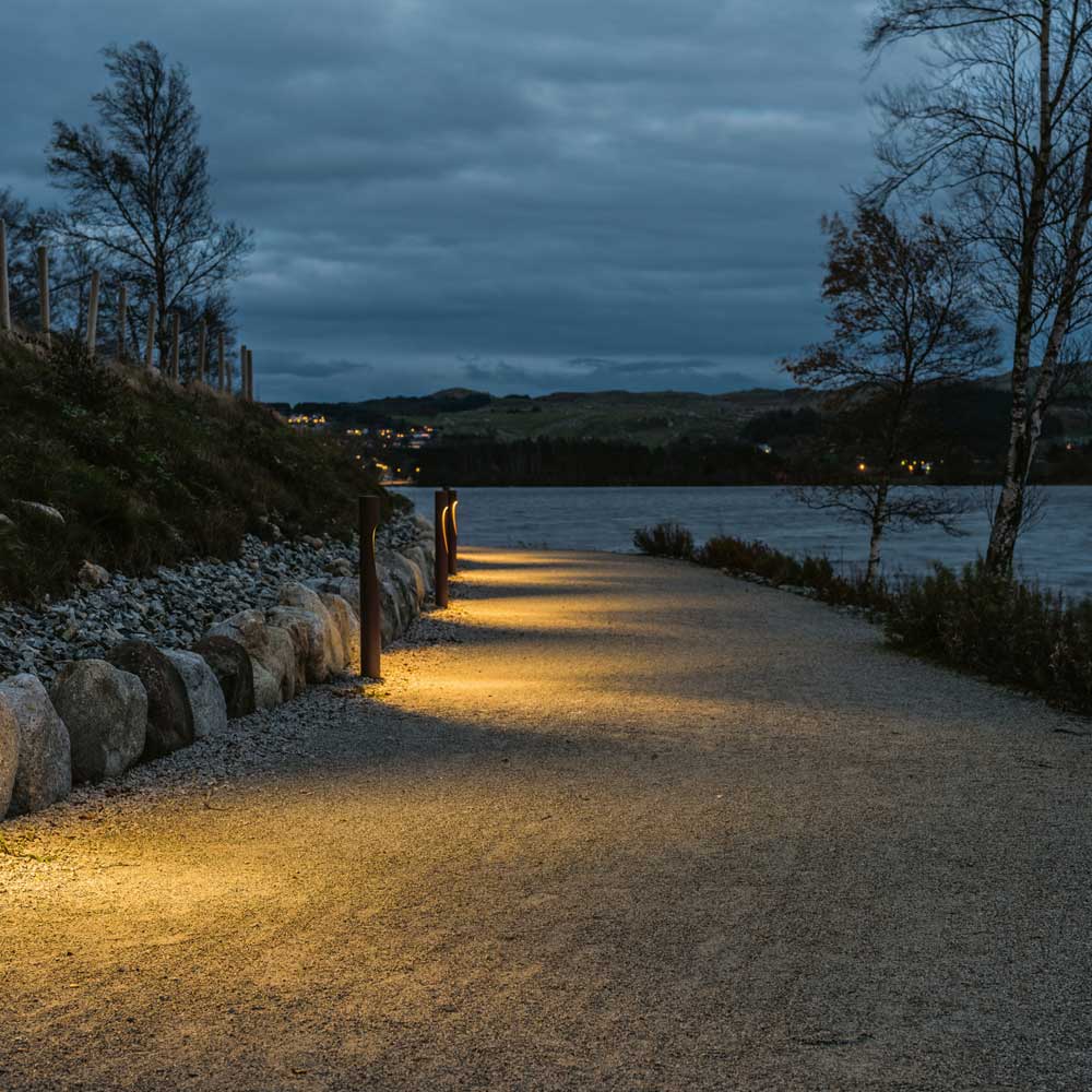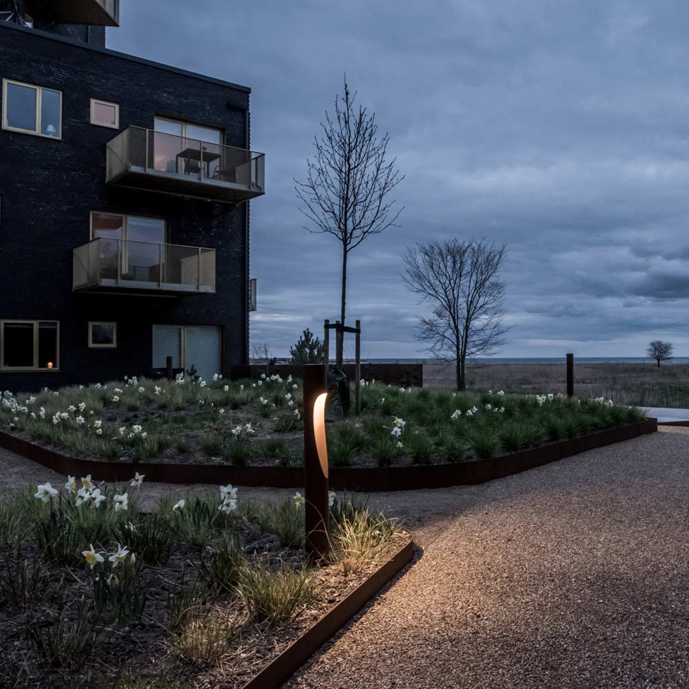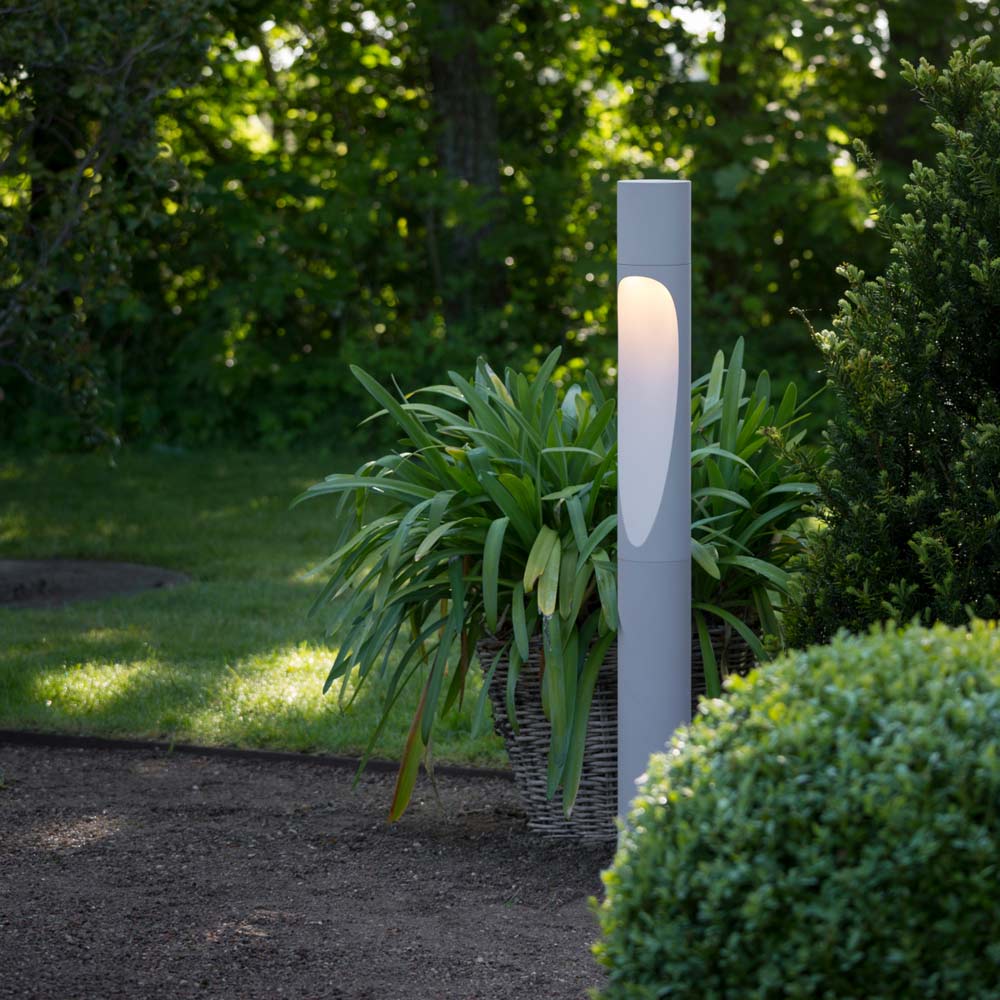 Asymmetric carving interrupts the tall, straight silhouette of the Flindt Garden Outdoor LED Bollard from Louis Poulsen to create a radiant glow that delivers an intriguing pattern across the ground below. Gorgeous in landscaping and across hardscapes, the bollard embraces modern design while assuring glare-free lighting that enhances surrounding architecture, greenery, and ambiance.