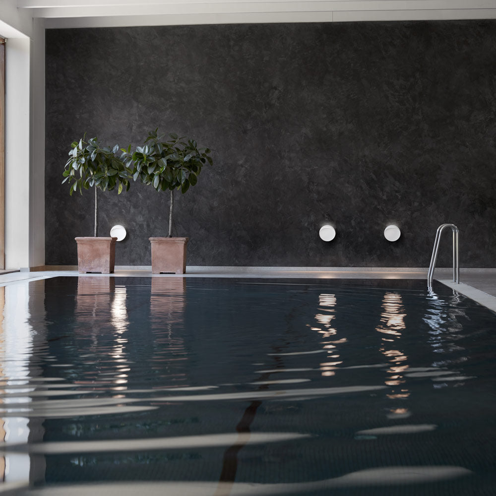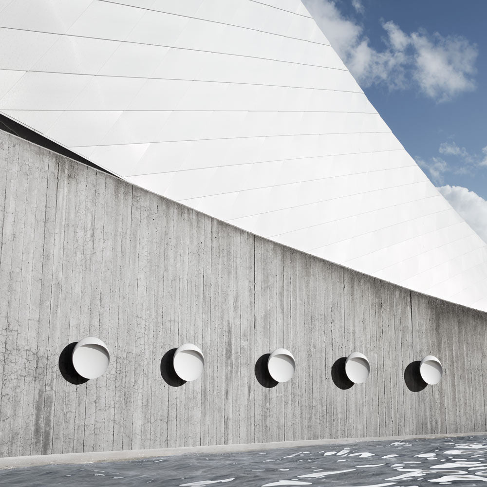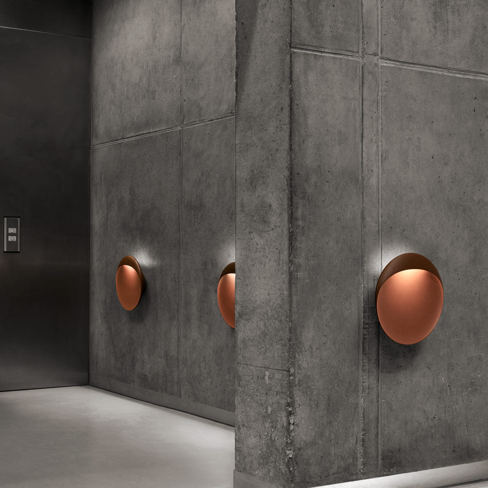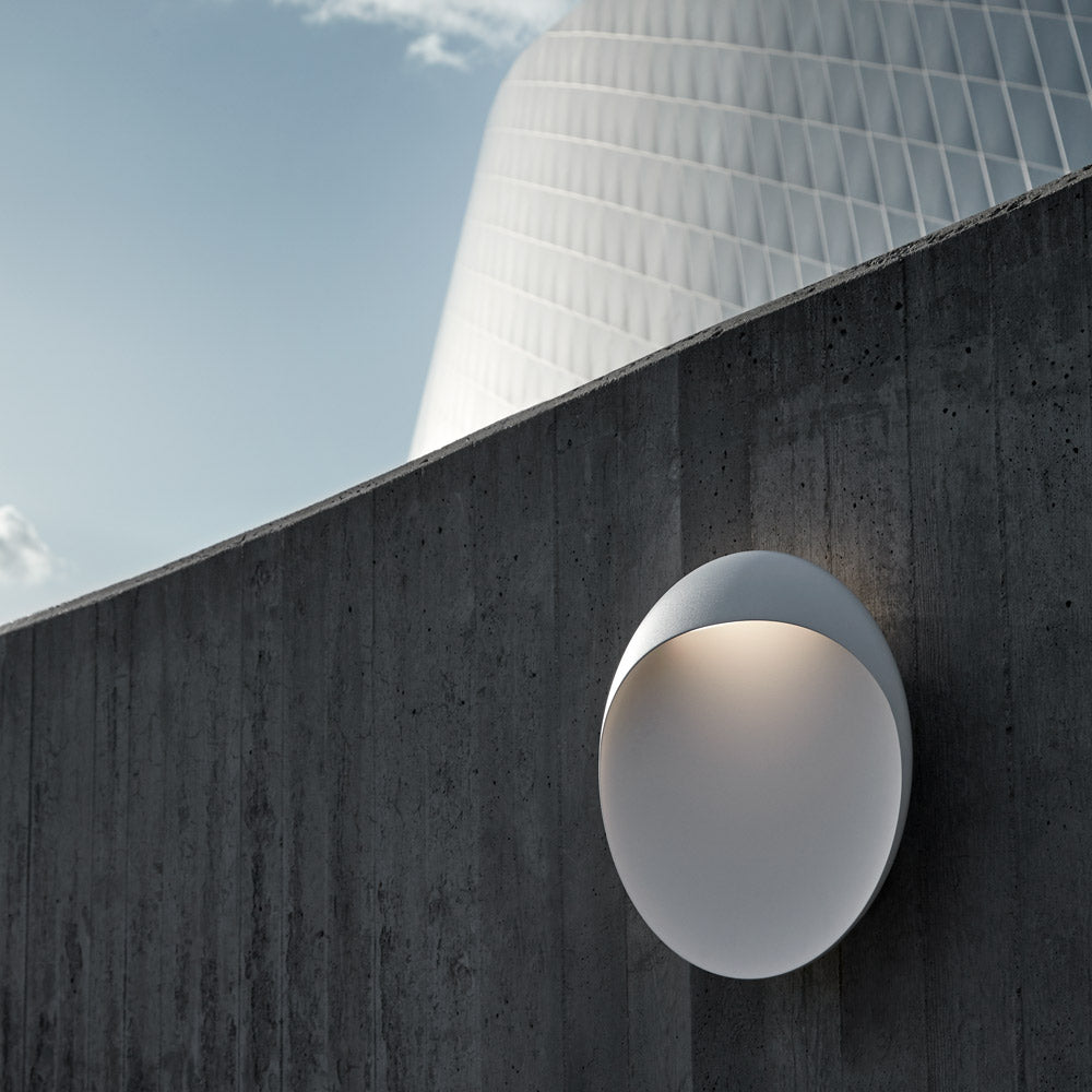 A gentle hood directs downward illumination, playing up the soft, modern ambiance of the Flindt Outdoor LED Wall Light from Louis Poulsen. Perfectly round, the fixture features a hidden light source that glow from within its cutout shape to deliver glare-free glow that enhances surrounding landscaping and architecture while providing soft lighting for added safety in outdoor spaces.