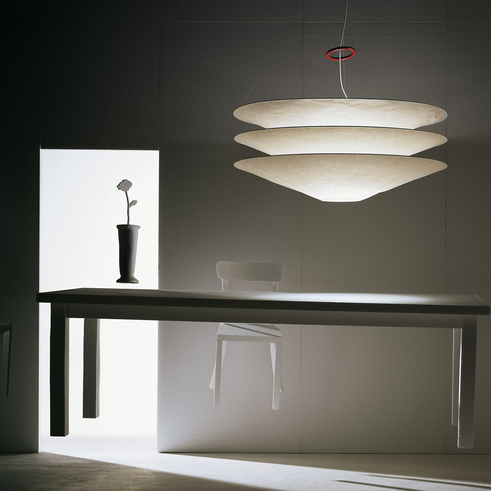 An ethereal sensation of suspending discs creates visual impact as the Floatation Pendant Light from Ingo Maurer changes the tune of a modern space. This tri-shade fixture offers delicate Japanese paper construction supported with metal framing, delivering a delicate origami flavor. This energy-efficient light becomes a focal point in a custom living room or foyer.