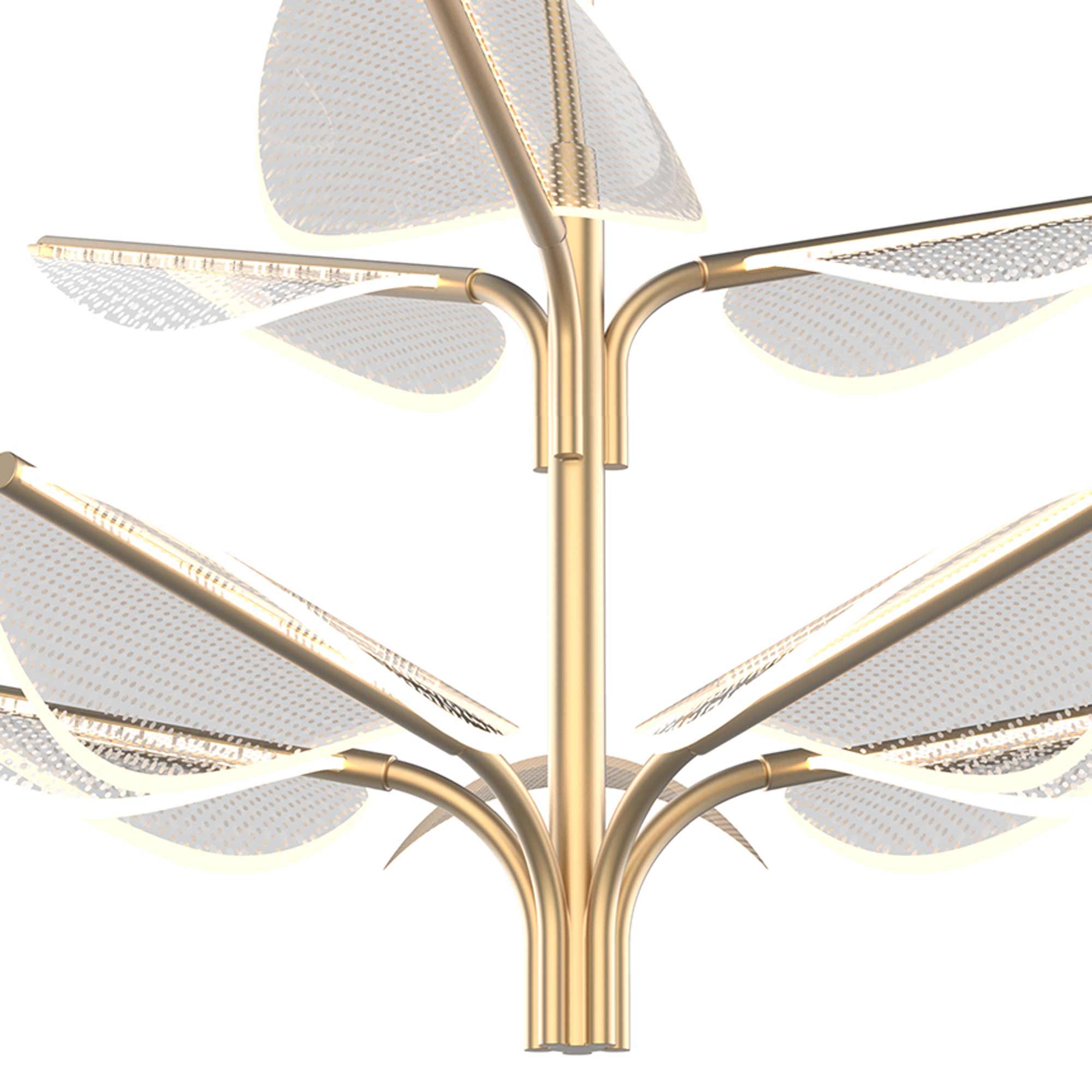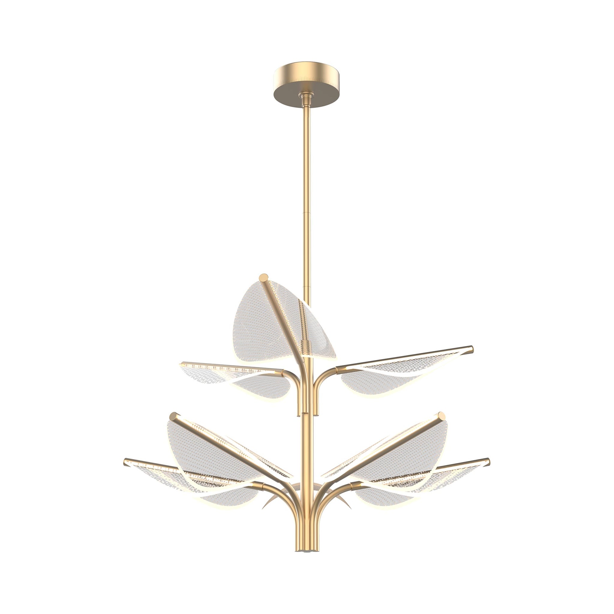 Gorgeous leaf forms are edge-lit to create a hint of Art Deco flair for the contemporary Flora LED Chandelier from Alora Lighting.