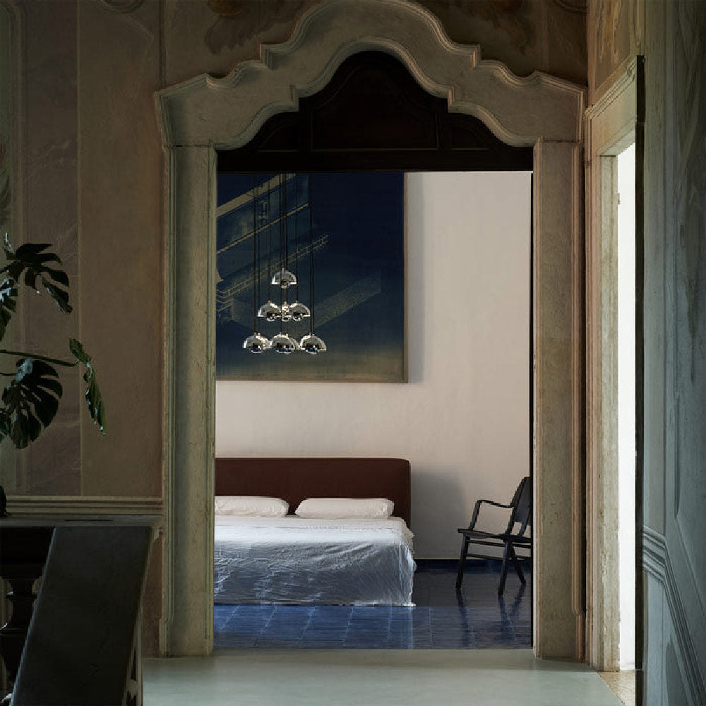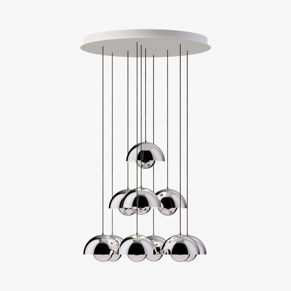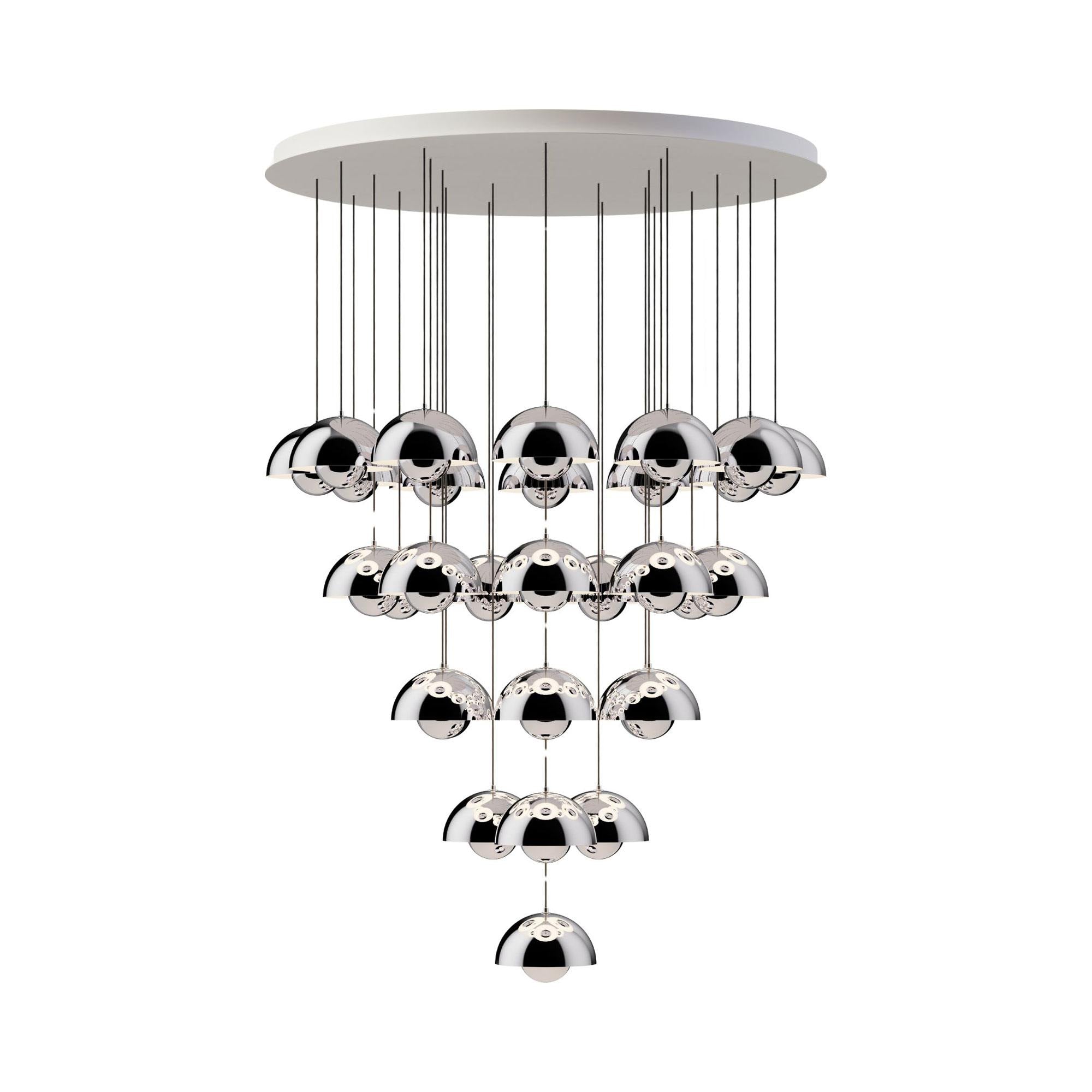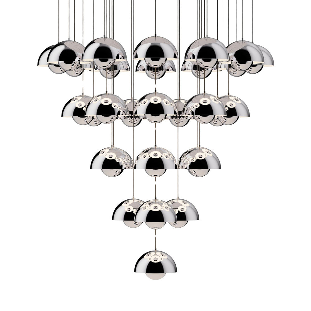 The Flowerpot VP1 Chandelier from &Tradition brings with it a festive deco attitude, both updated and retro in style. A raining parade of pendants arrange carefully, dangling from a canopy and creating a statement. Steel and aluminum construction bring an iconic element.