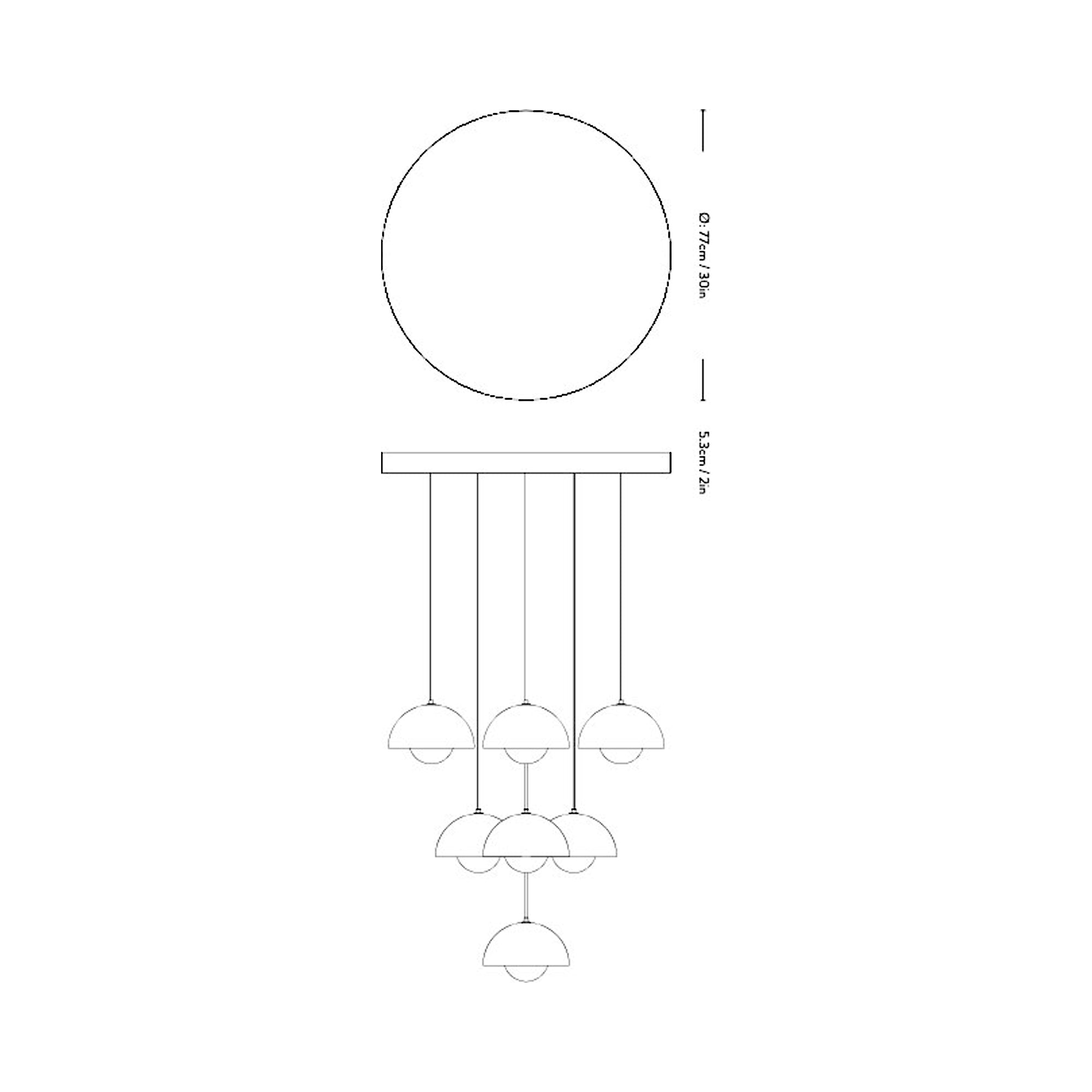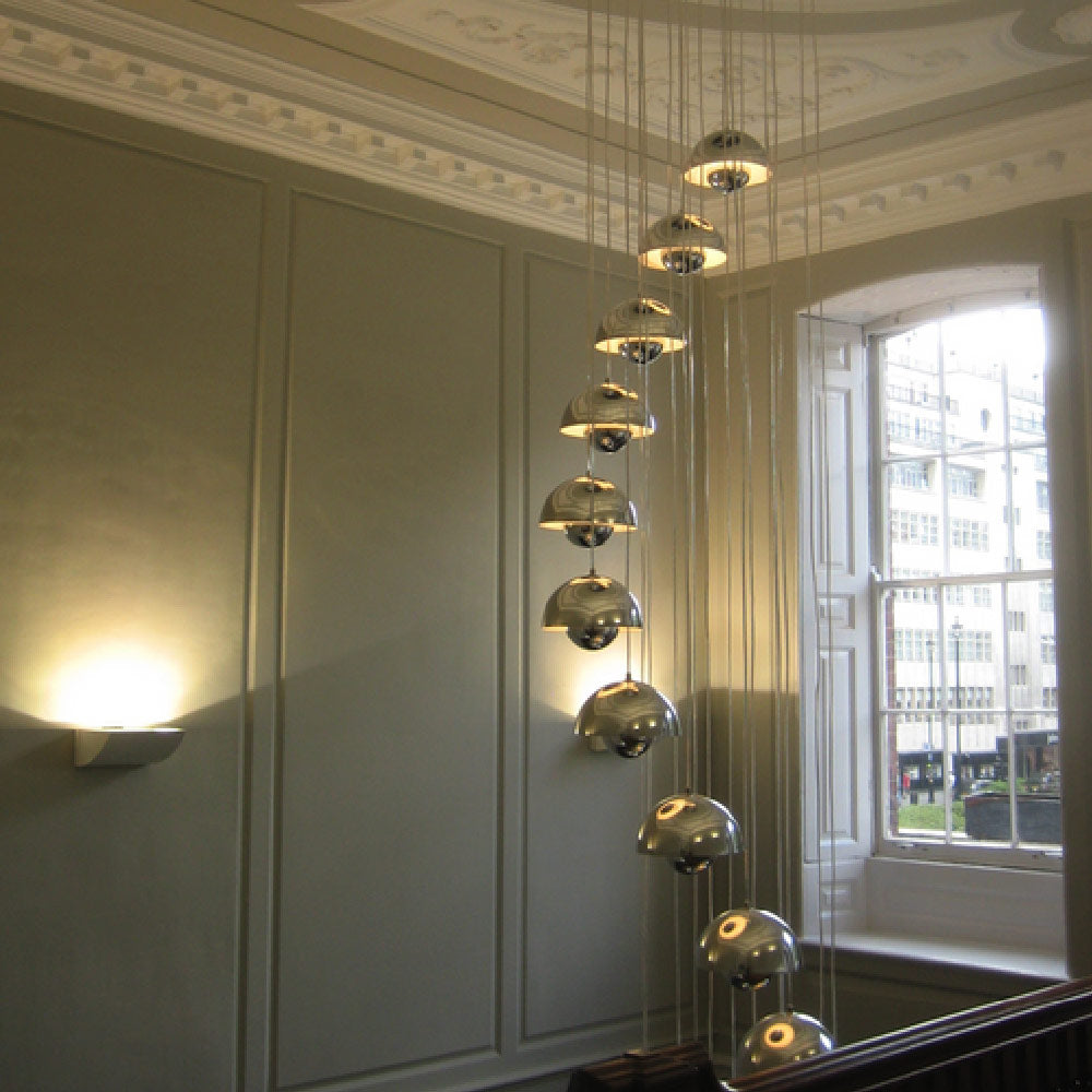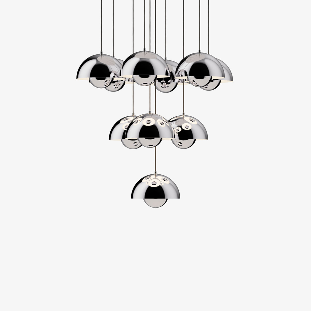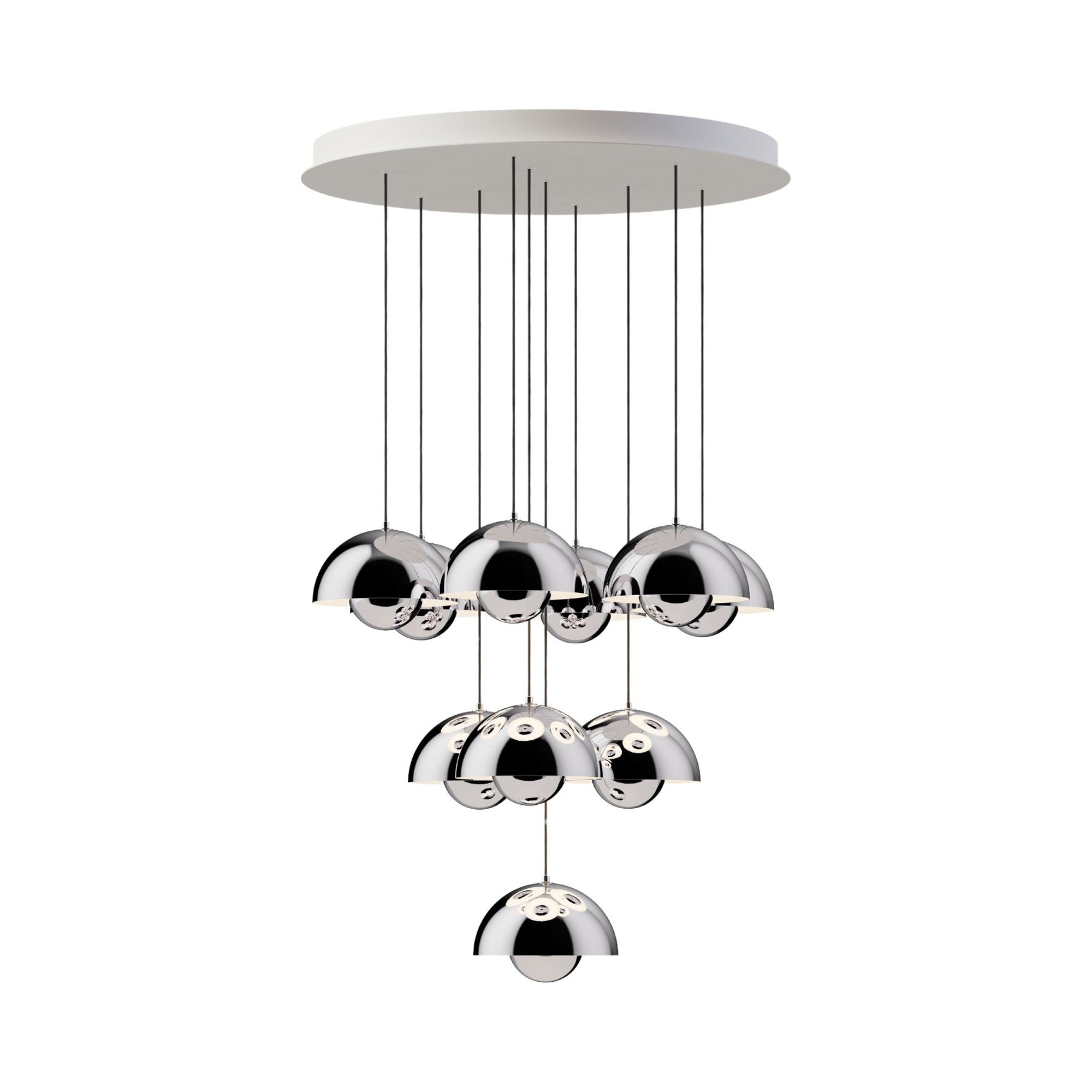 The Flowerpot VP1 Chandelier from &Tradition brings with it a festive deco attitude, both updated and retro in style. A raining parade of pendants arrange carefully, dangling from a canopy and creating a statement. Steel and aluminum construction bring an iconic element.