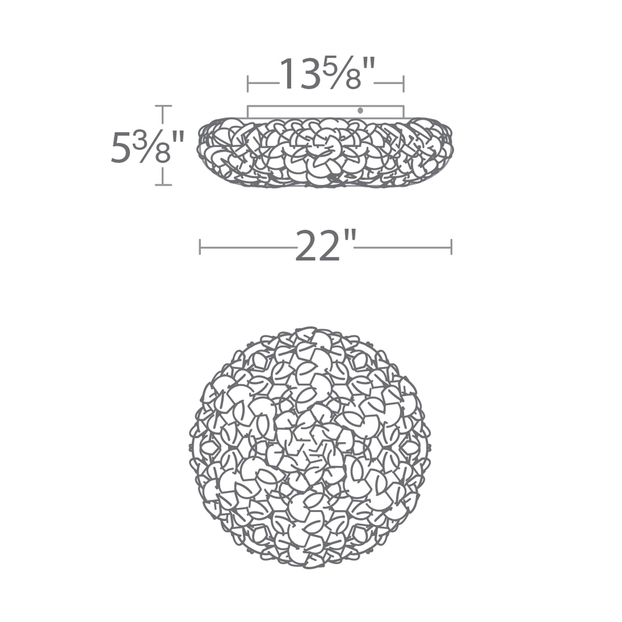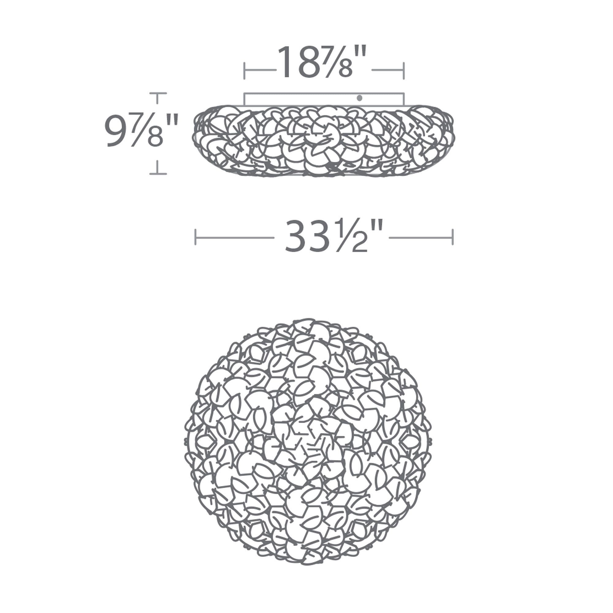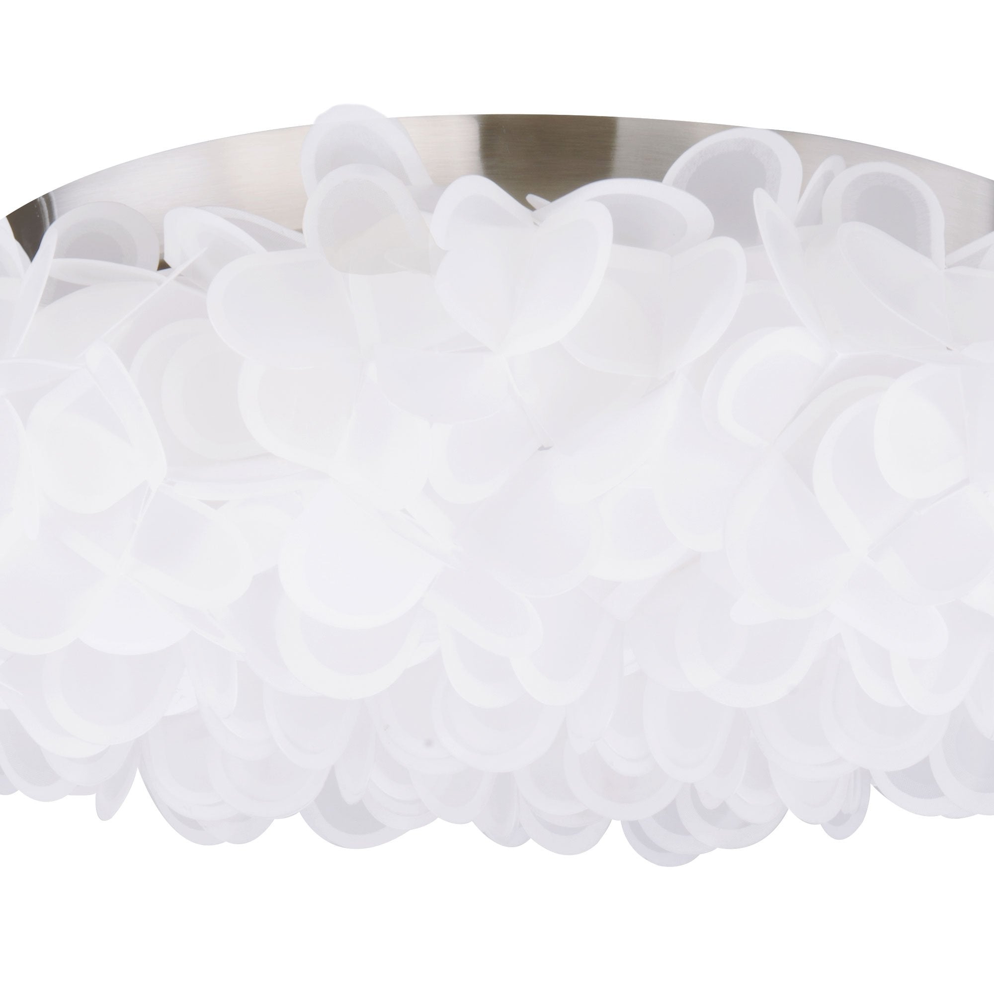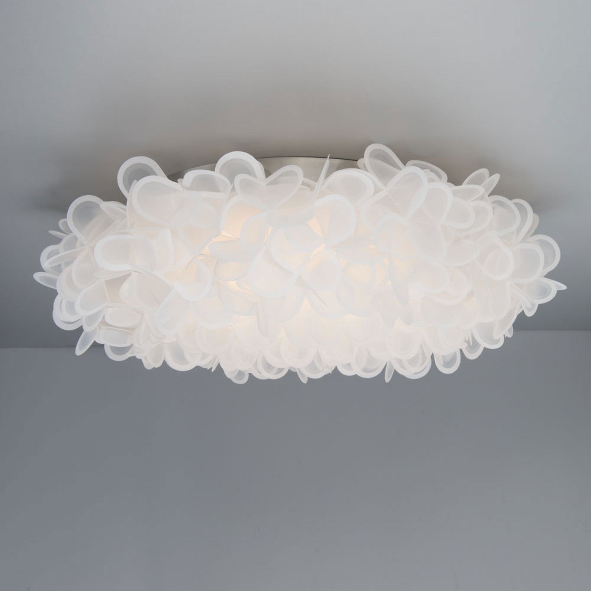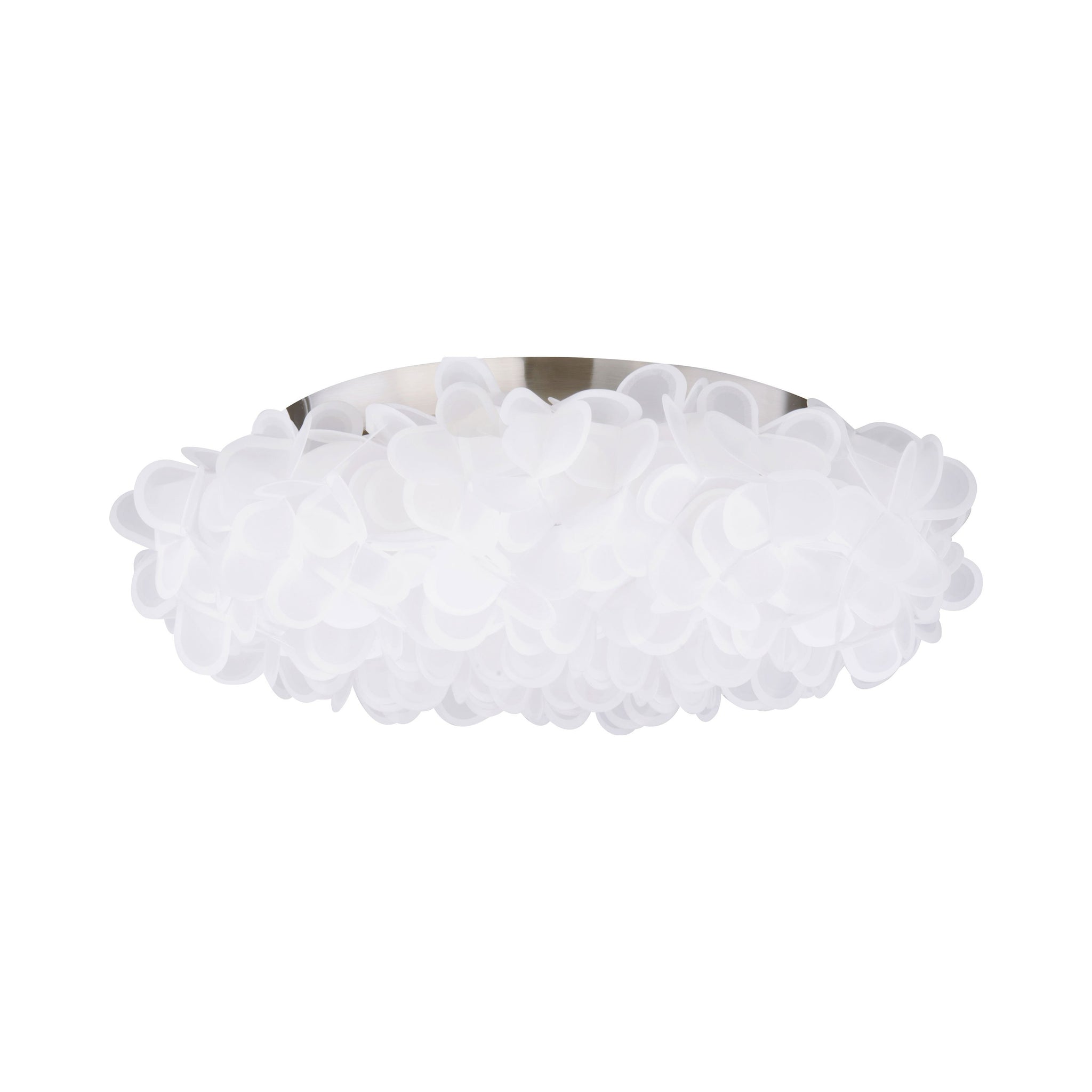 A soft feathered piece with a heavenly look. Handcrafted detailed acrylic that emerges into a glowing cluster of interlocked petals with frosted edges. Celestial silk screened petals diffuse the light with texture around the fixture for a tone on tone style.