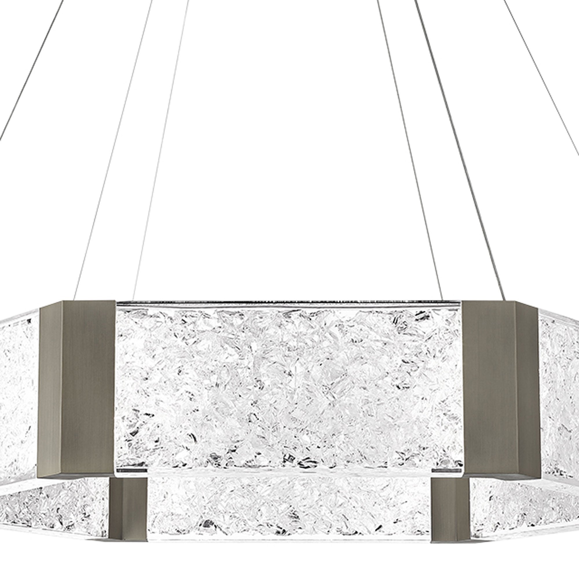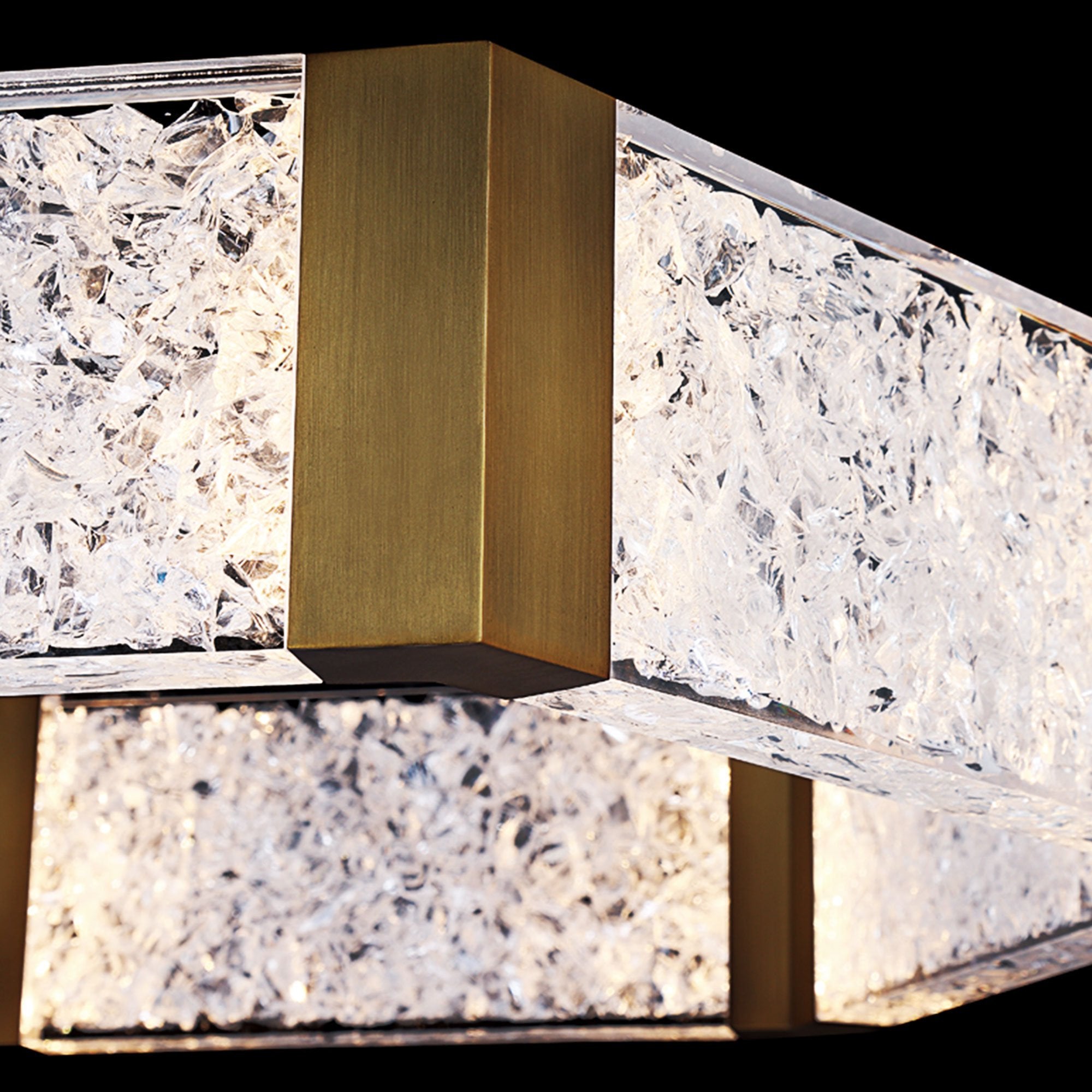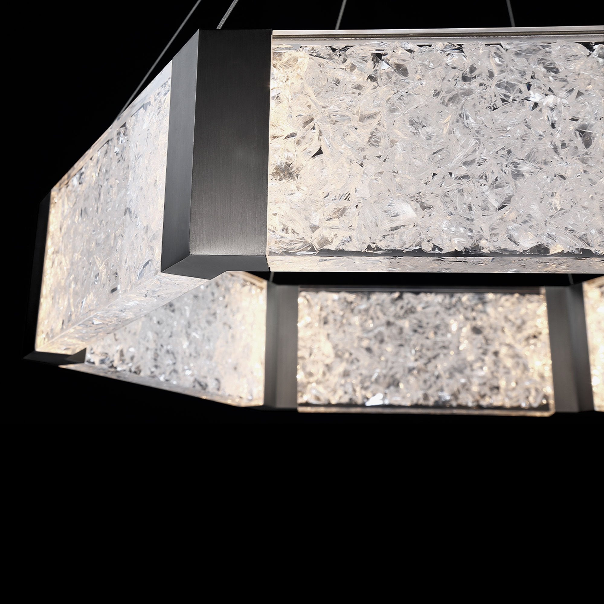 Spectacularly luminous panels made with reclaimed K5 crystal are spellbinding in this exquisite chandelier. Clandestine LED light sources are powered by thin cables that suspend the frame to the canopy for a technologically advanced design with the utmost attention to detail.