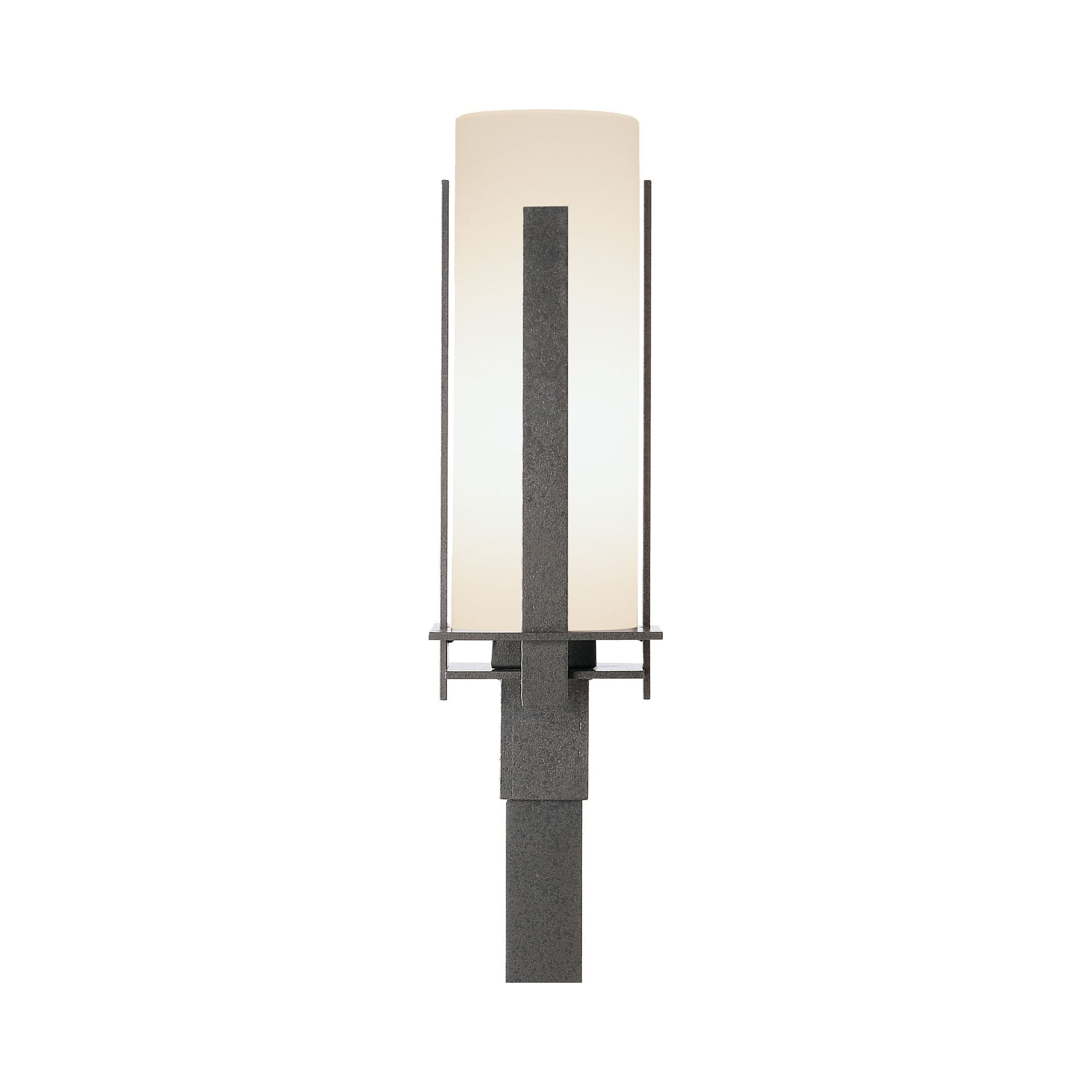 A cage of steel highlights the delicacy of beautiful glass in this compelling Forged Vertical Bars Outdoor Post Light from Hubbardton Forge.