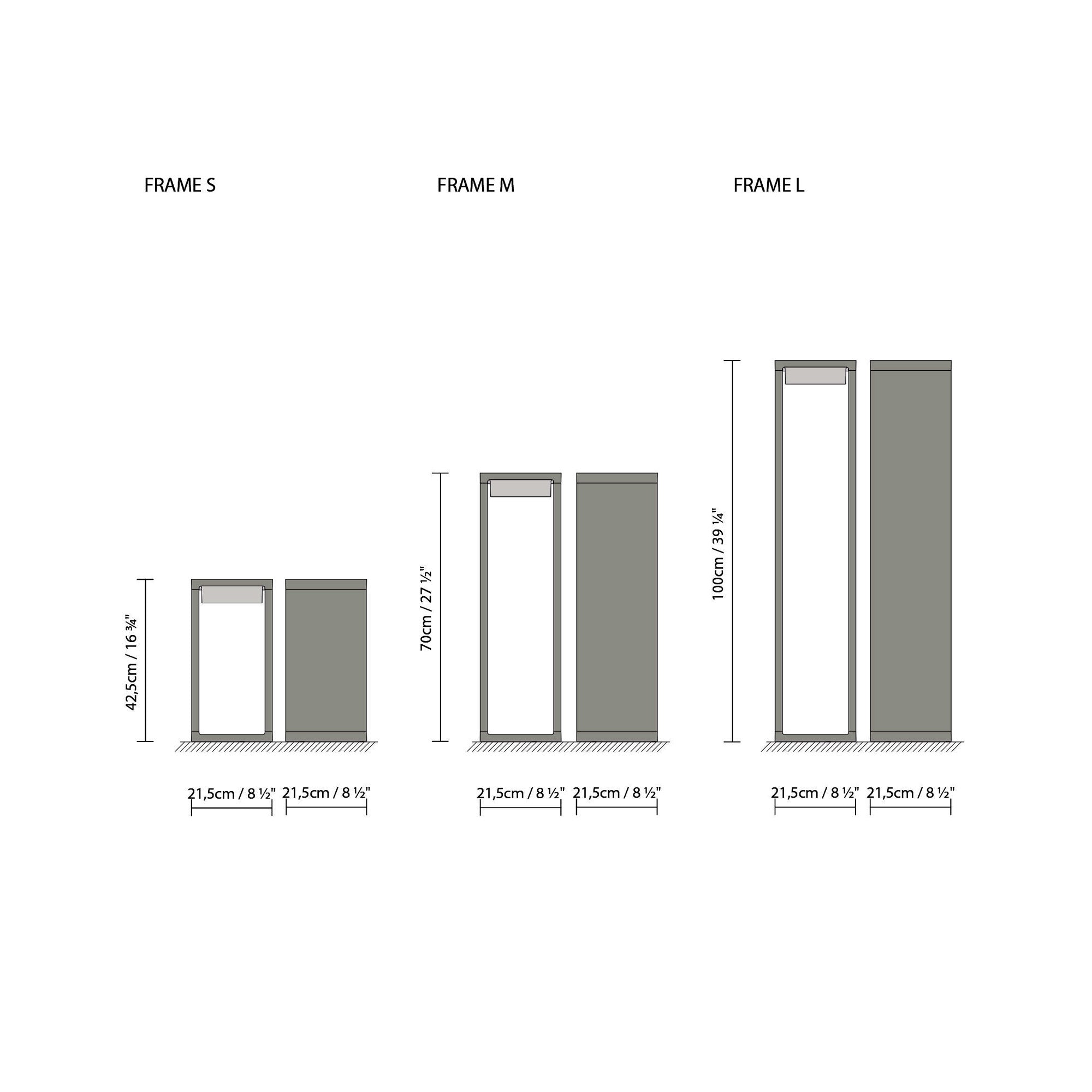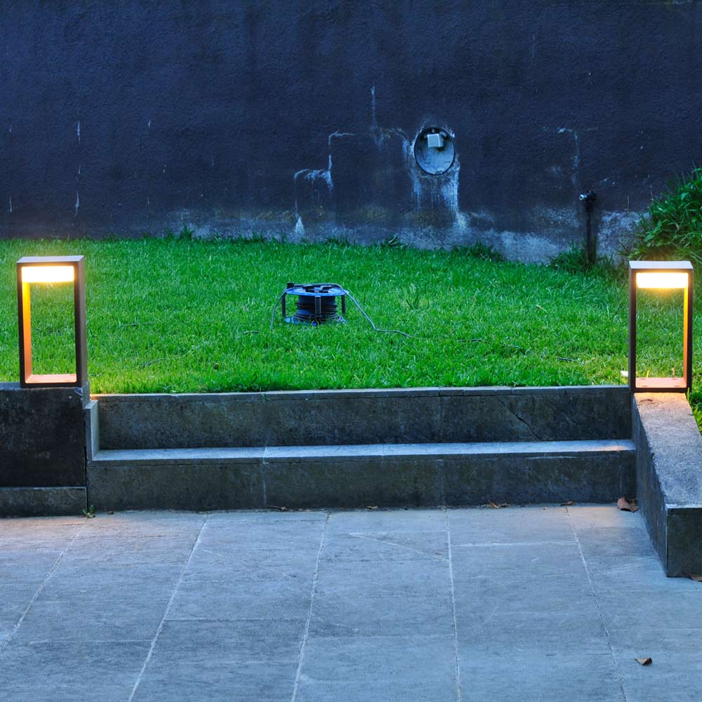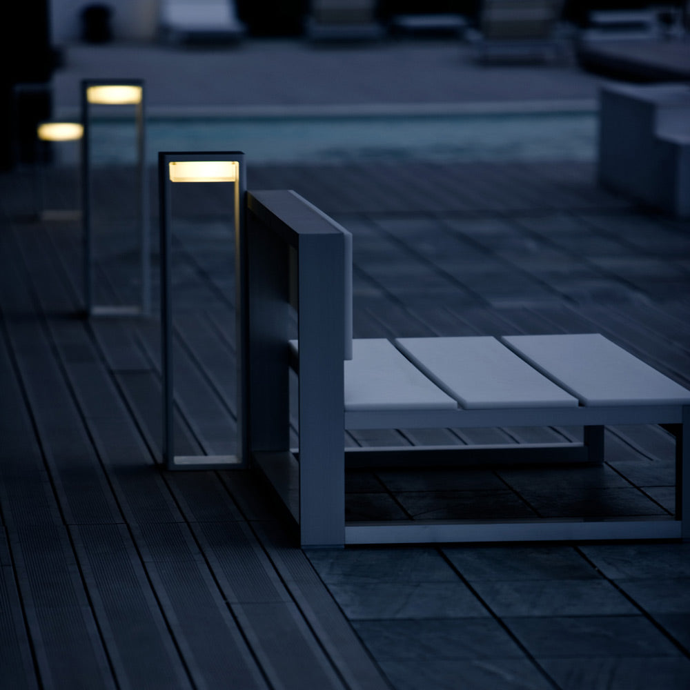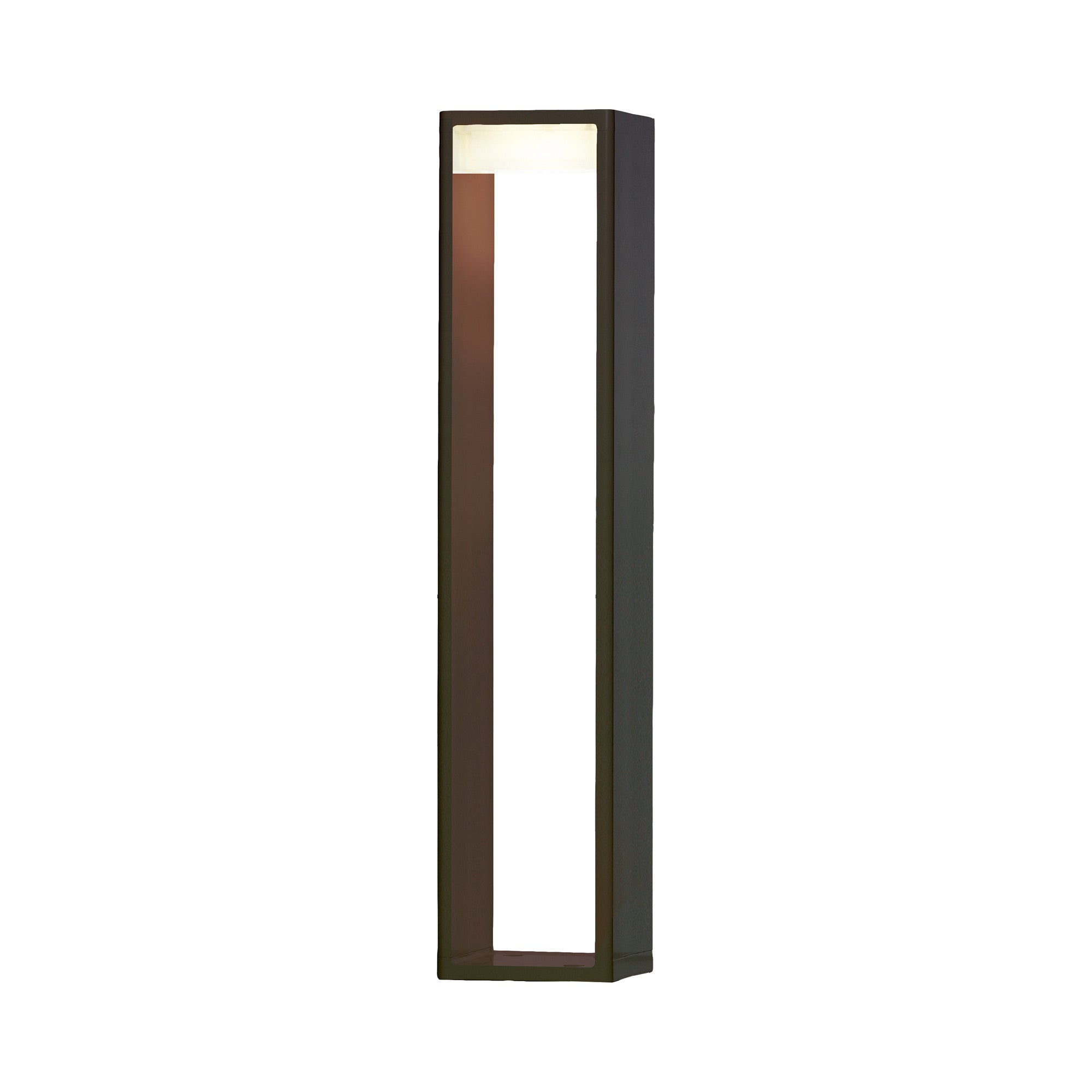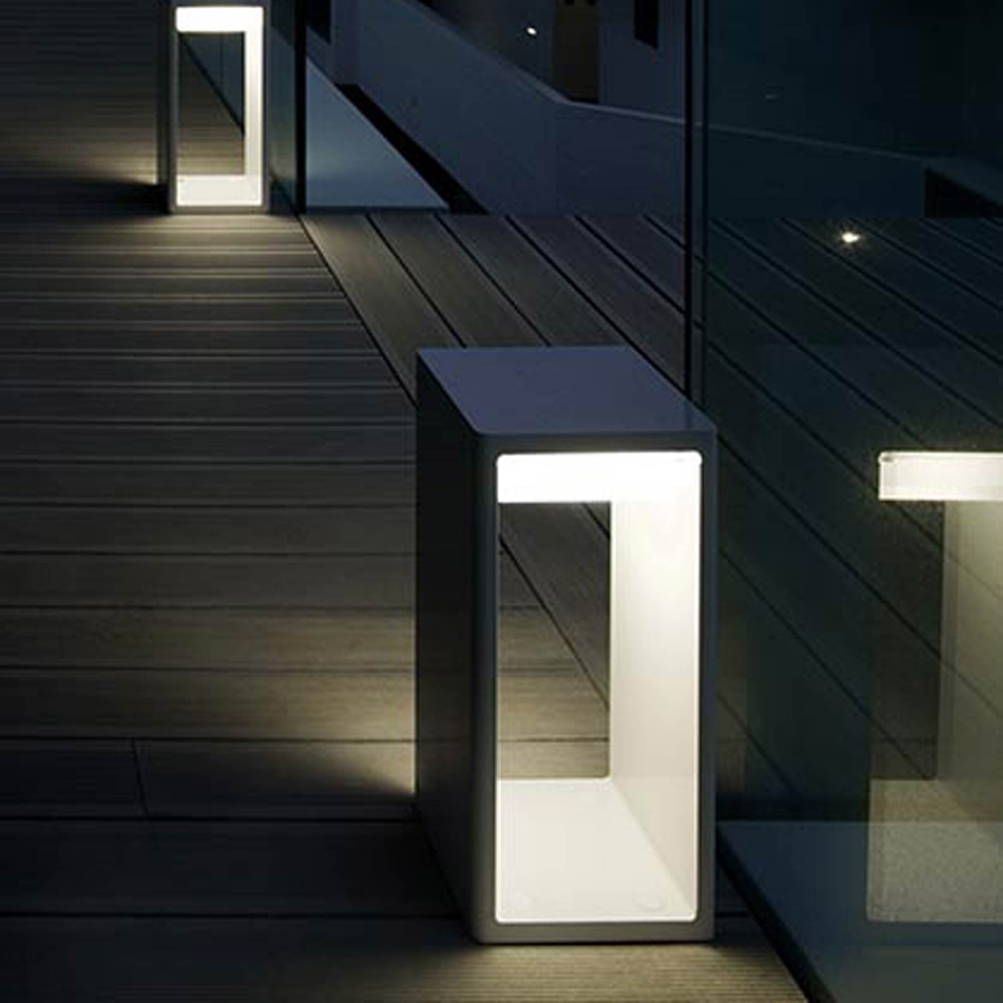 Pepper in a soothing glow throughout landscaped lawns and architectural paths with the Frame Outdoor Bollard from B.Lux. A vertical open metal frame designed with a pressed glass diffuser nestled inside casts a downward illumination, creating safe passageways with its minimalist utilitarian flair.
