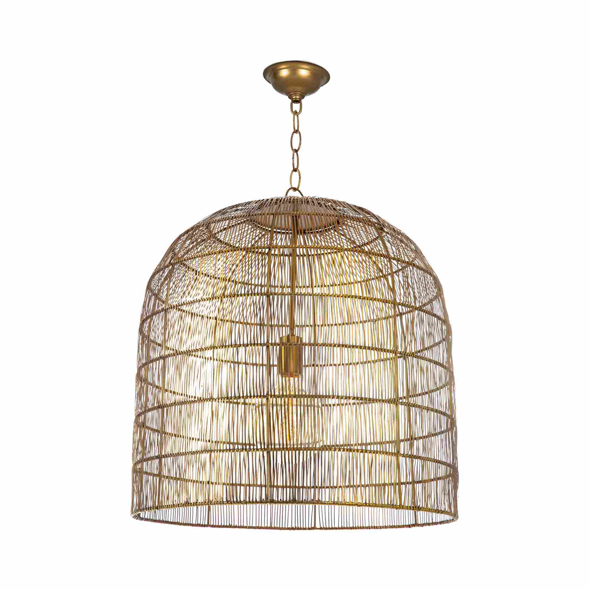 A new twist in boho style becomes a light source with décor power as the Fresco Pendant Light from Regina Andrew makes casual settings into charming havens. Metal construction features slender iron strips and framing that deliver a basket-like cage shade, deep and optically impactful. Sculptural elegance belies the low-key effect of a coastal-inspired look.