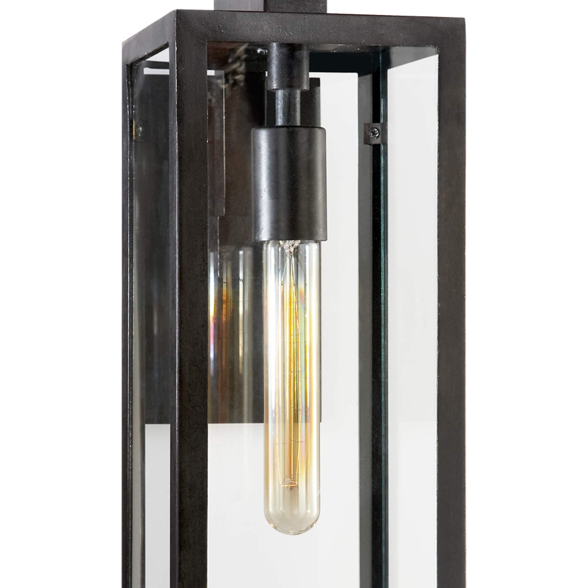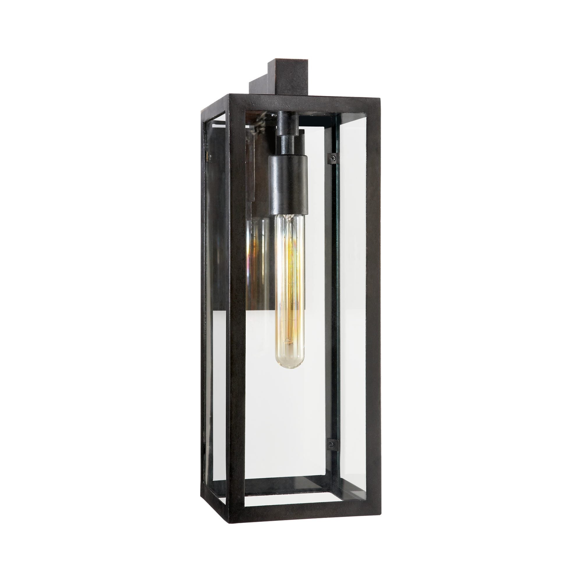 A stylish village theme alters the contemporary vibe of the Fresno Framed Outdoor Wall Light from Visual Comfort Signature. Add a charming feel to an exterior structure by capturing a geometric linear design featuring a thick metal frame with clear glass panels that invite a charming view of a classic bulb.