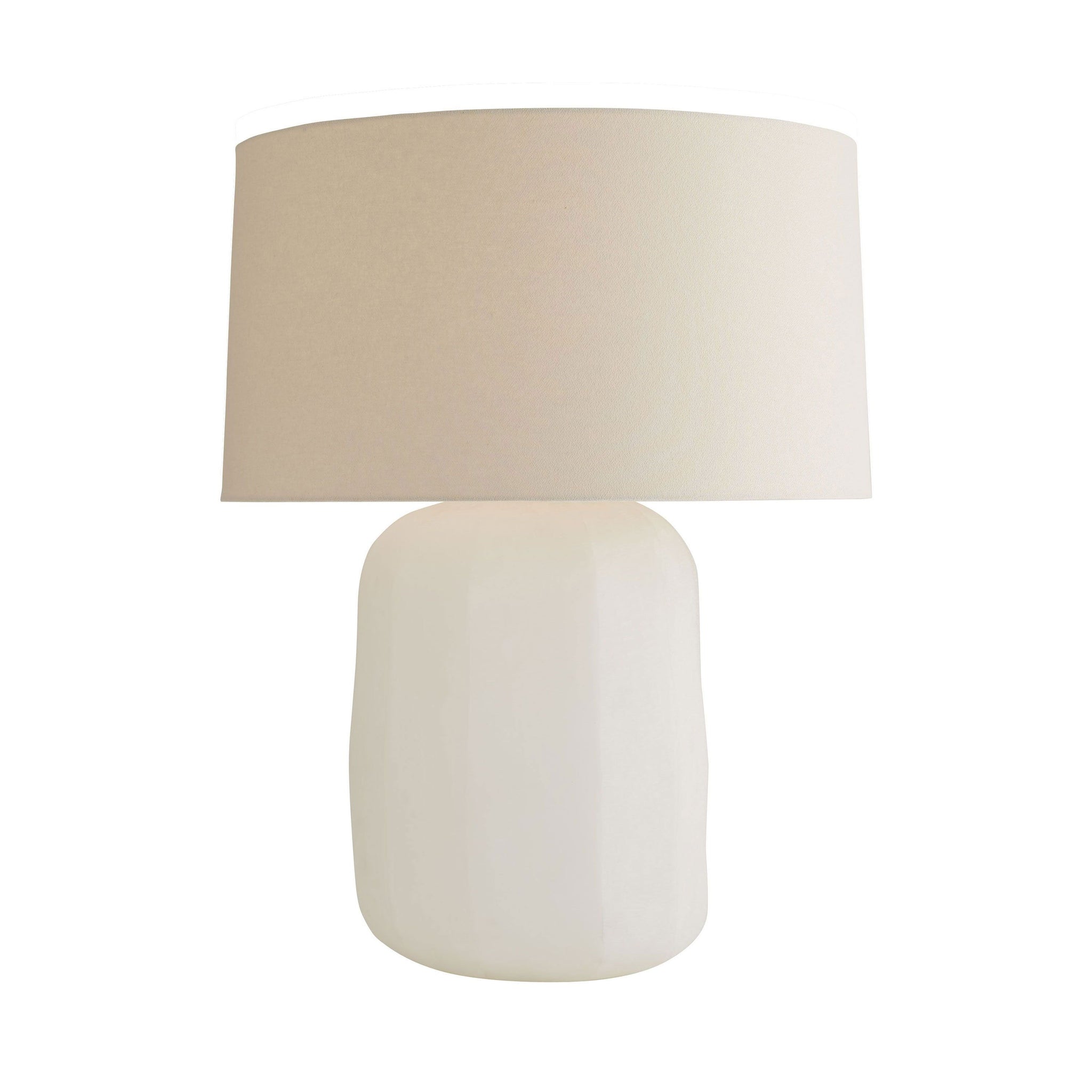 A slightly sculptural approach to the traditional craftsmanship of glasswork the Frio is a work of art in faceted form. Glass is blown by hand to create the large-scale vertical foundation of this multifarious lamp. Each side features a white hand-etched finish that delivers a textural quality to its organic yet symmetrical shape. Topped with a cloud beige linen drum shade with white cotton lining. Finish may vary.