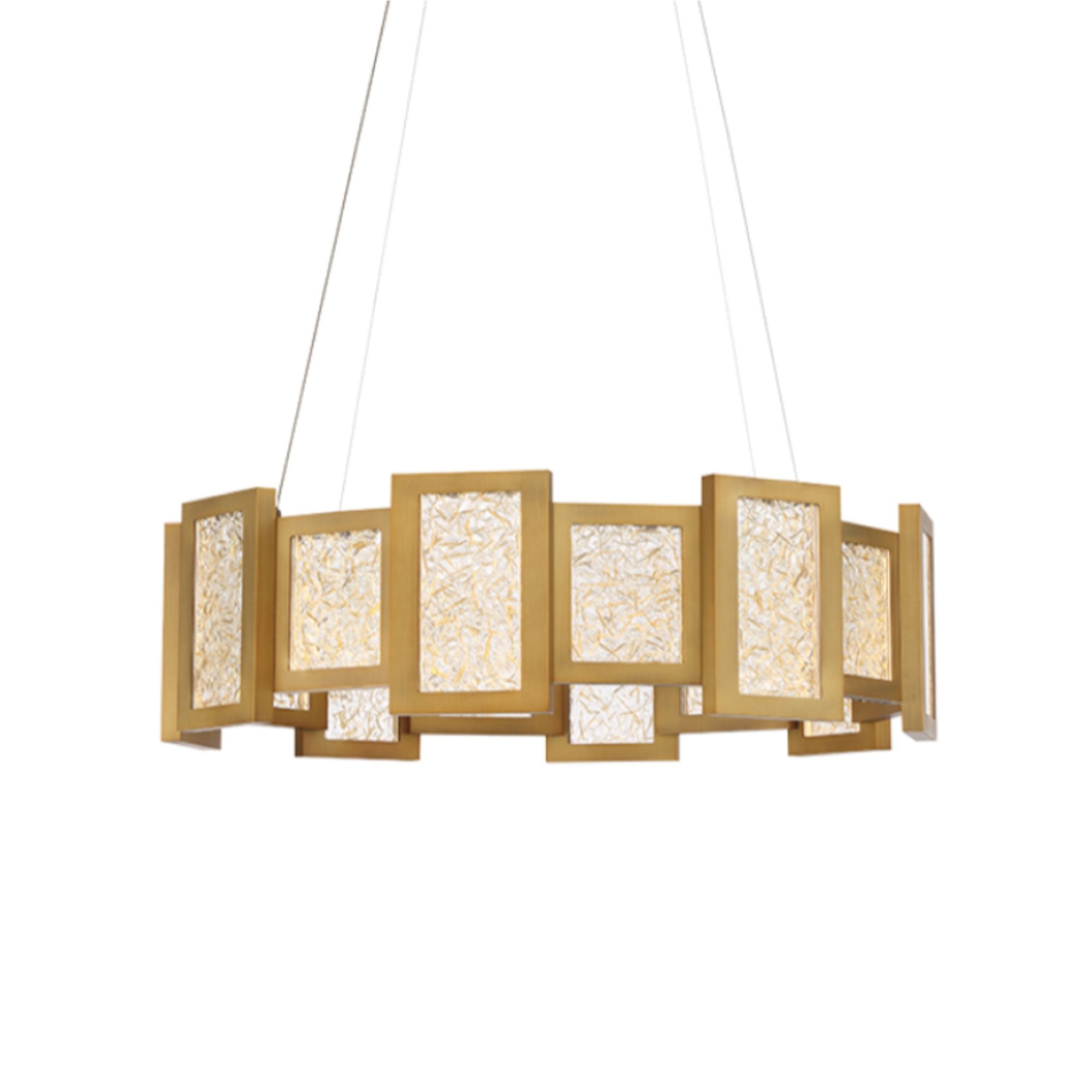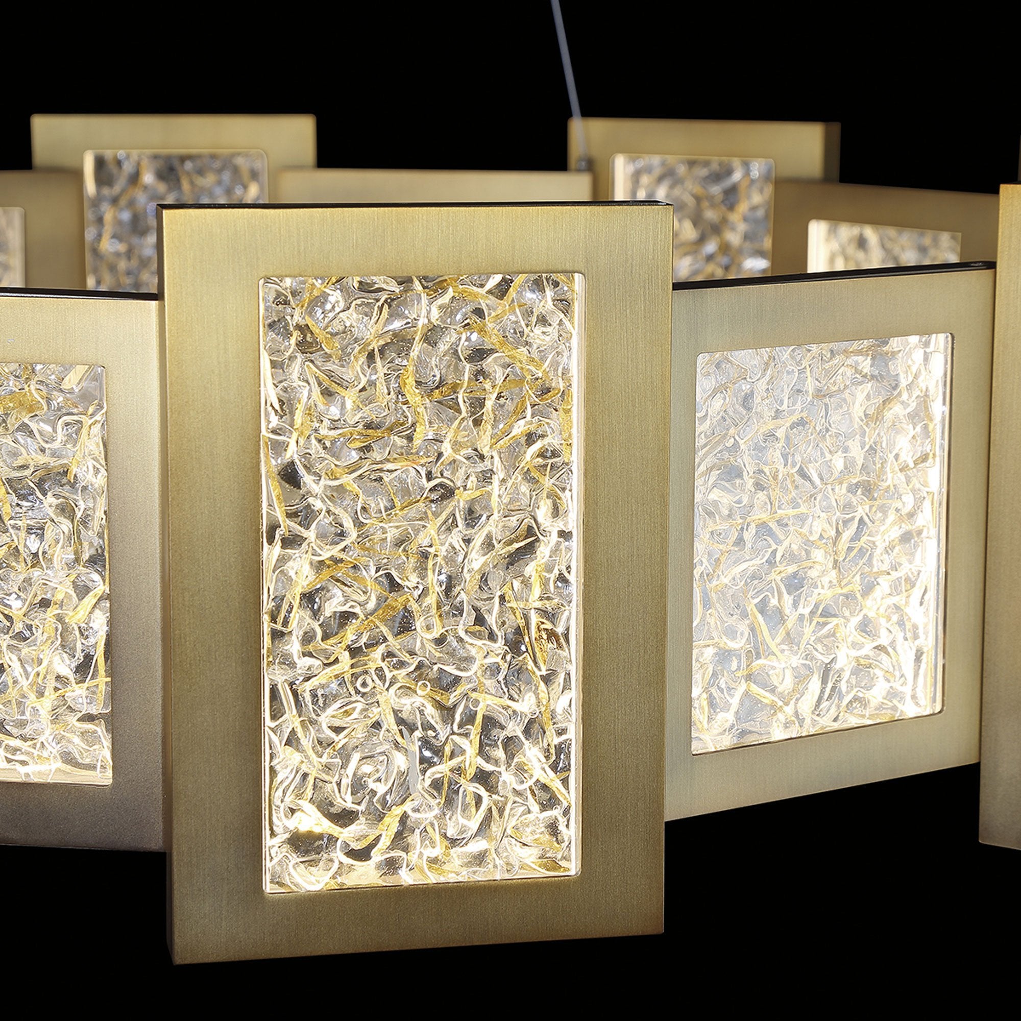 An elegant chandelier combining energy efficiency with lustrous metal finishes and gold encased art glass panes. Soft and even illumination from an innovative design only made possible with the latest in LED technology.