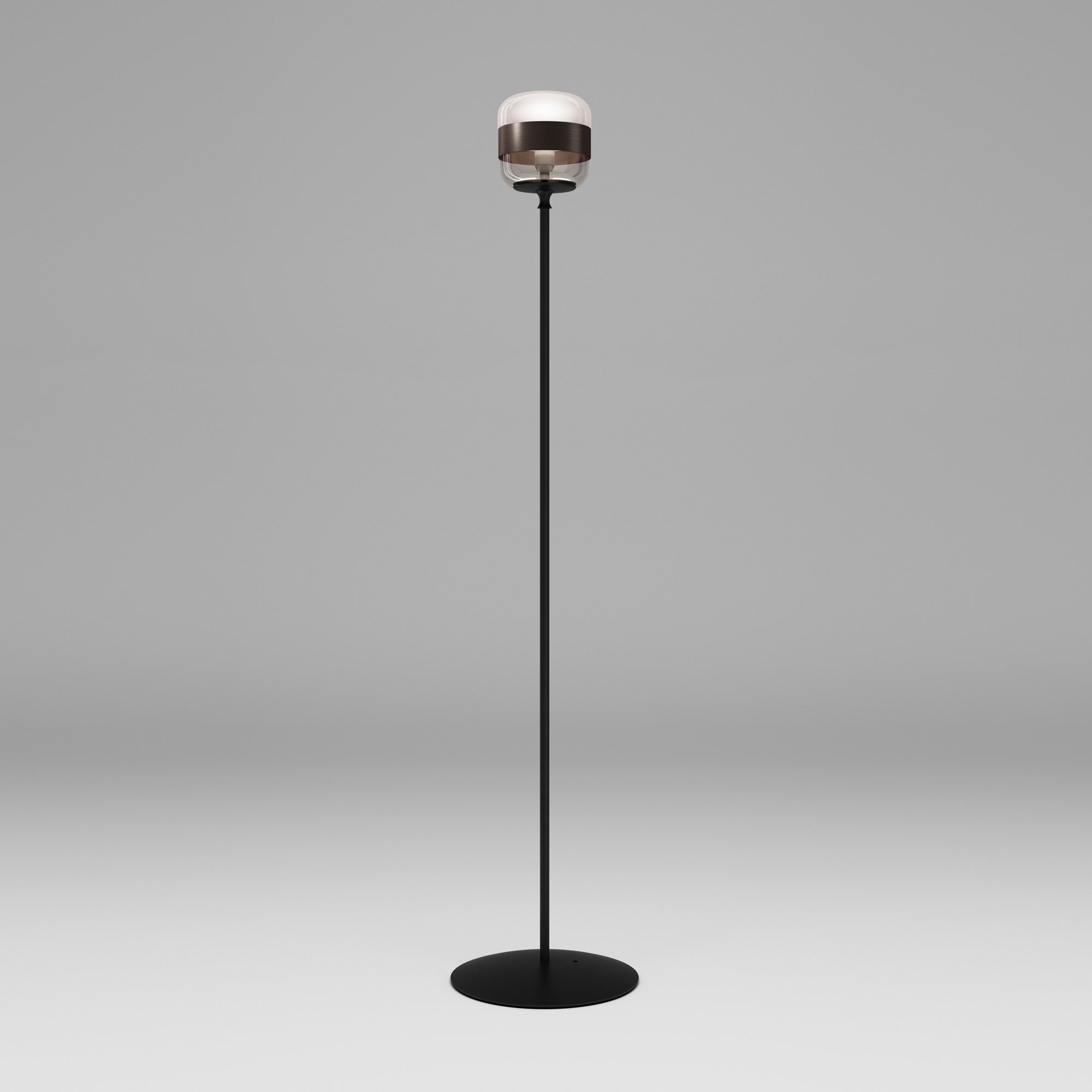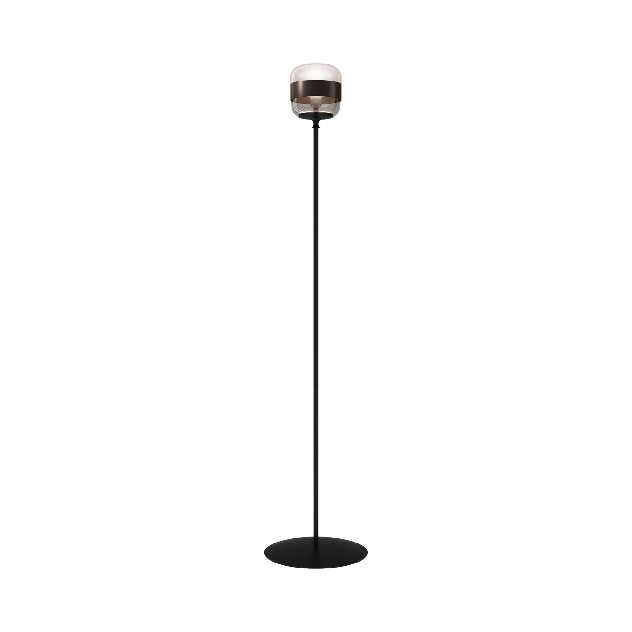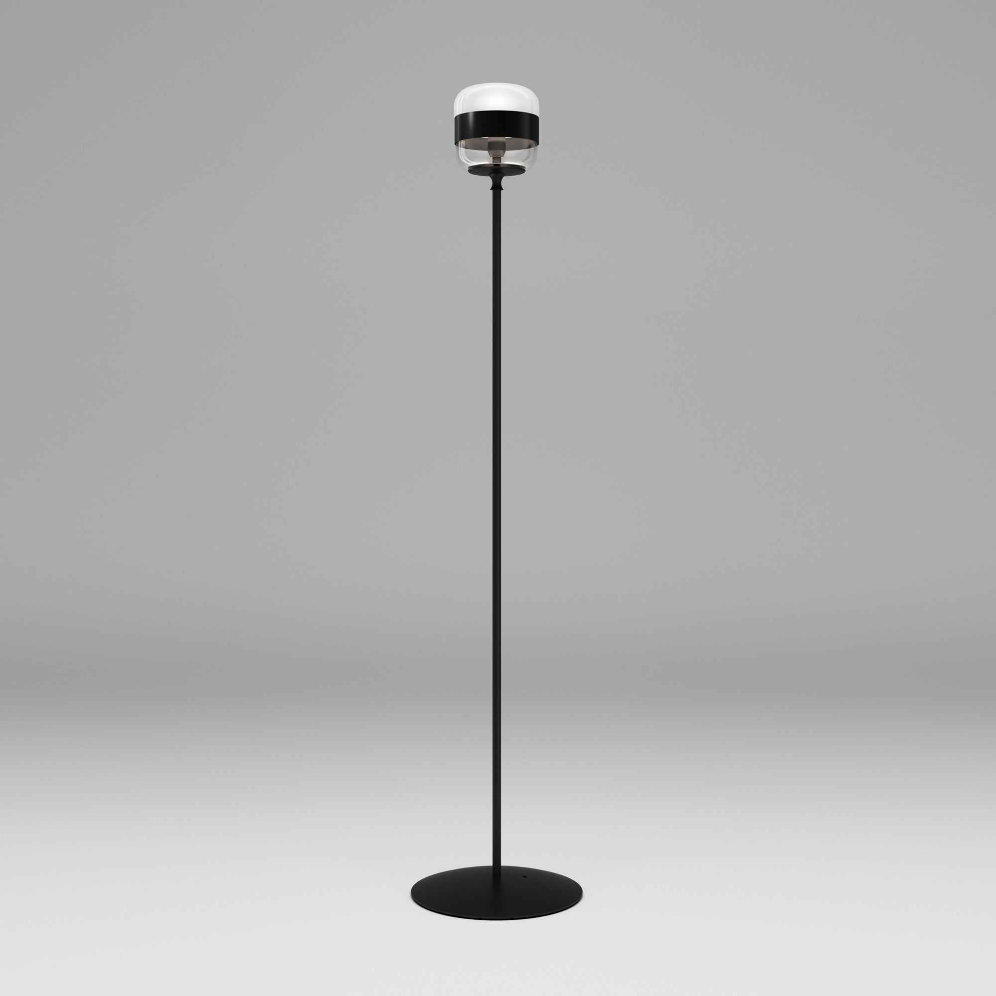 Notable industrial influence creates character and style in a light source with a distinctive look. Choose the Futura Floor Lamp from Vistosi to add a dynamic look fashioned of shapely glass with a sleek ribbon band that adds an extra light filter. Art Deco ambiance leans both casual and artistic in a lamp with a bold black finish metal frame.