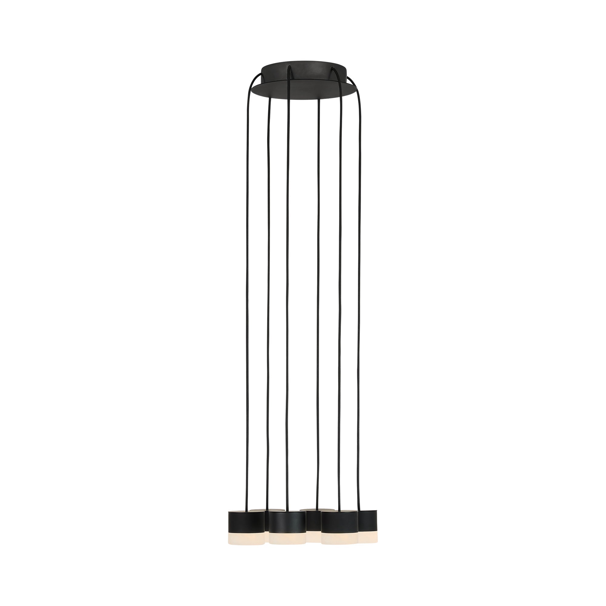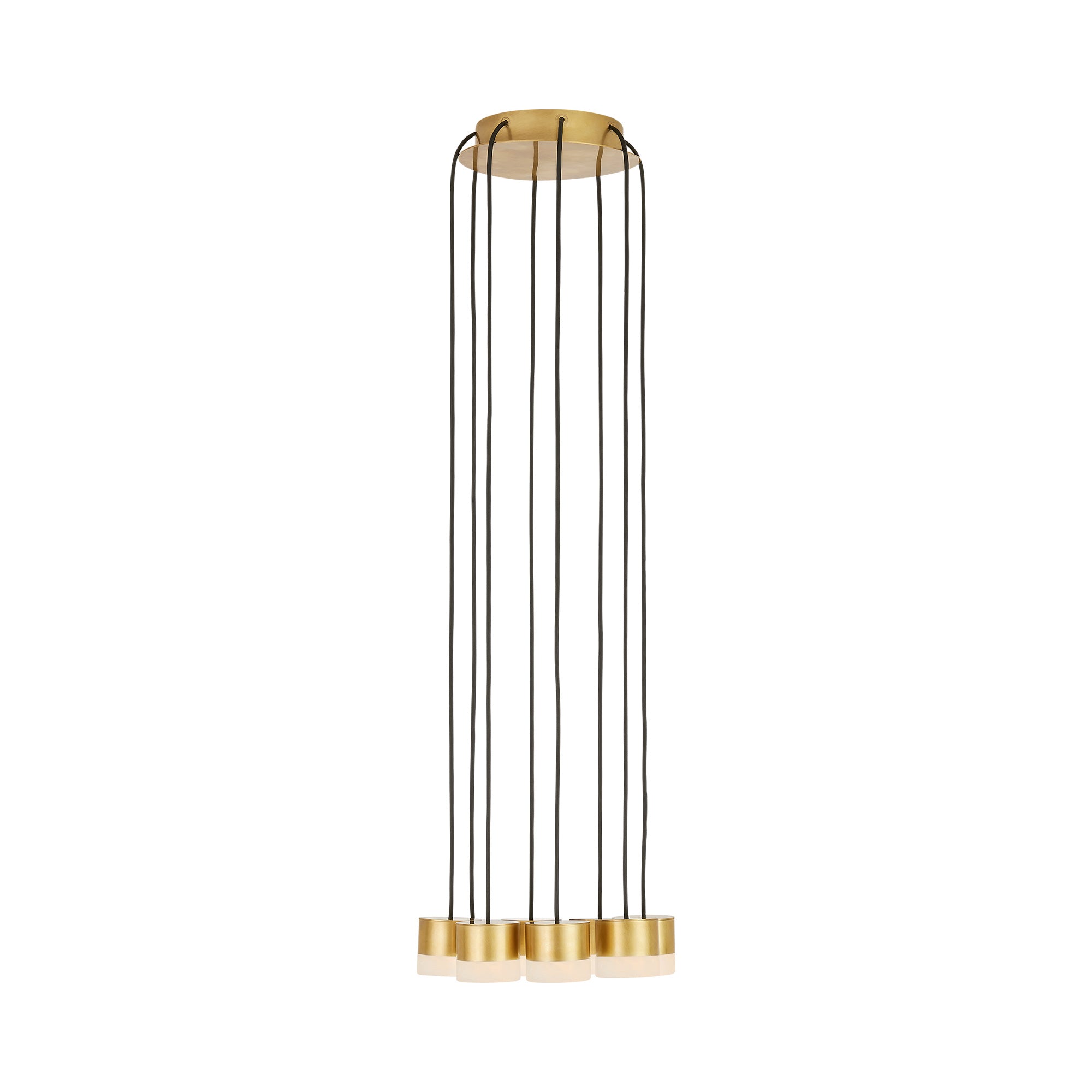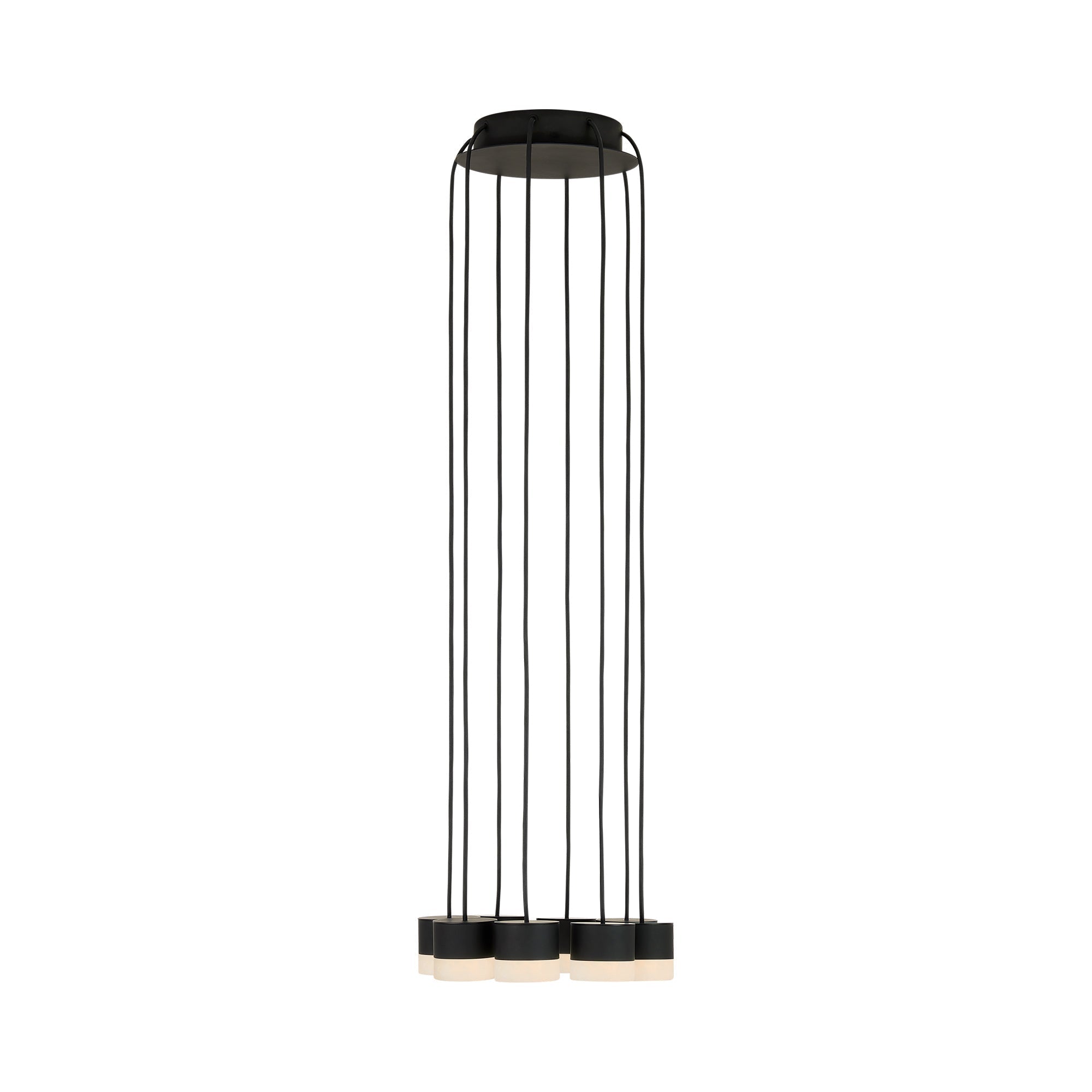 Linear silhouetting creates visual harmony in a light fixture with a dramatic tone and mood. The Gable LED Chandelier from Visual Comfort Modern invokes piano-like imagery created with slender cables dropping from a single canopy and culminating in diminutive disc shades. Gently curved diffusers cap each disc, infusing energy-efficient lighting with a striking impact.