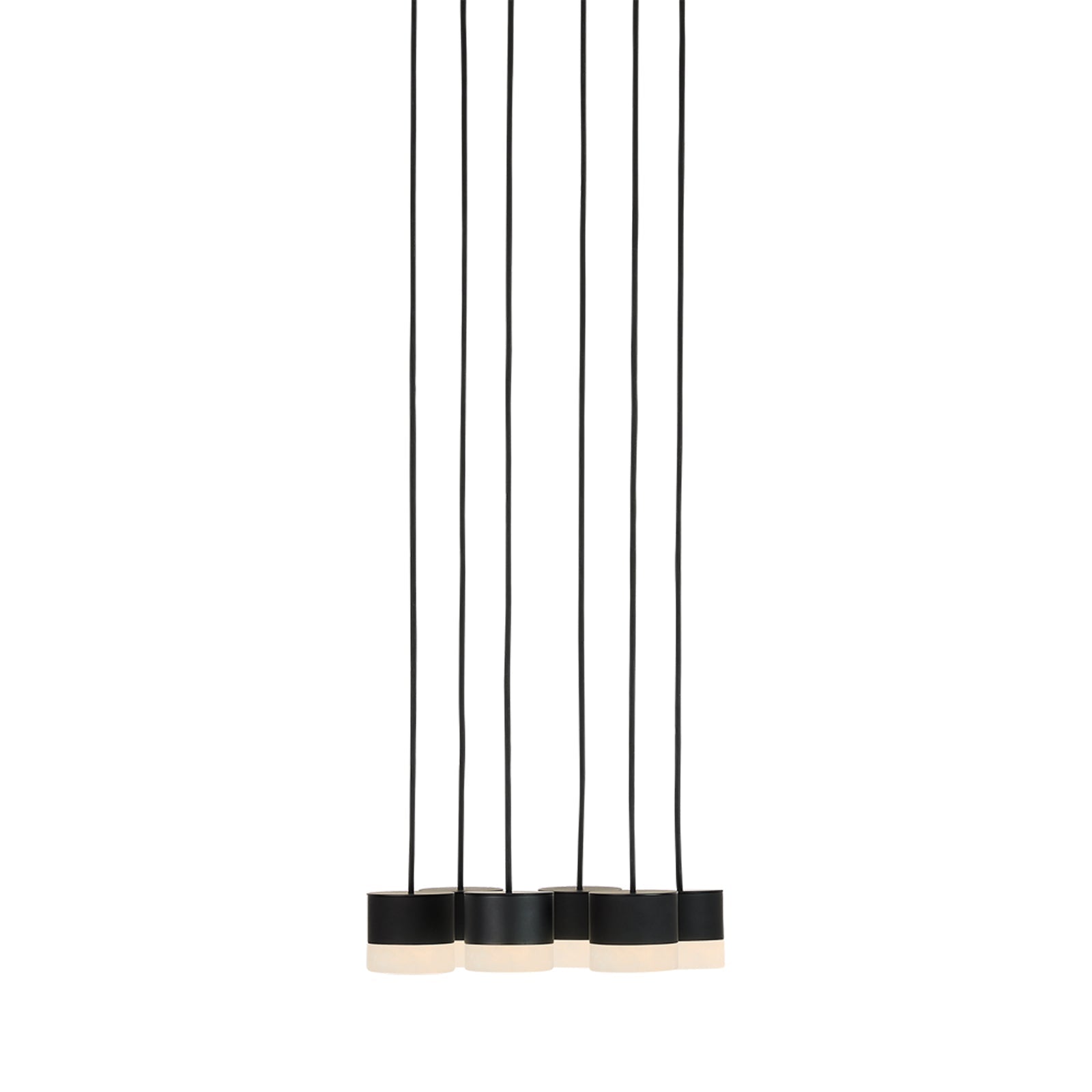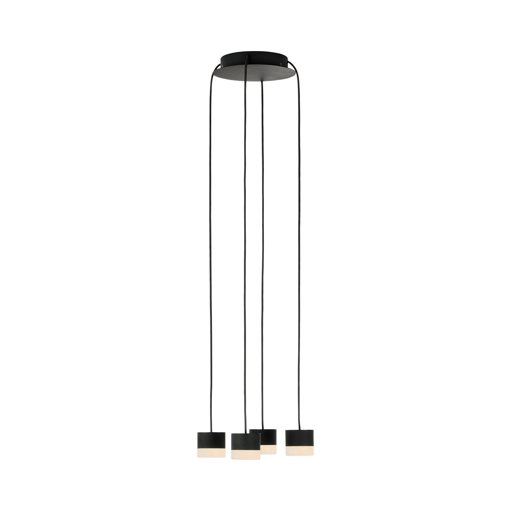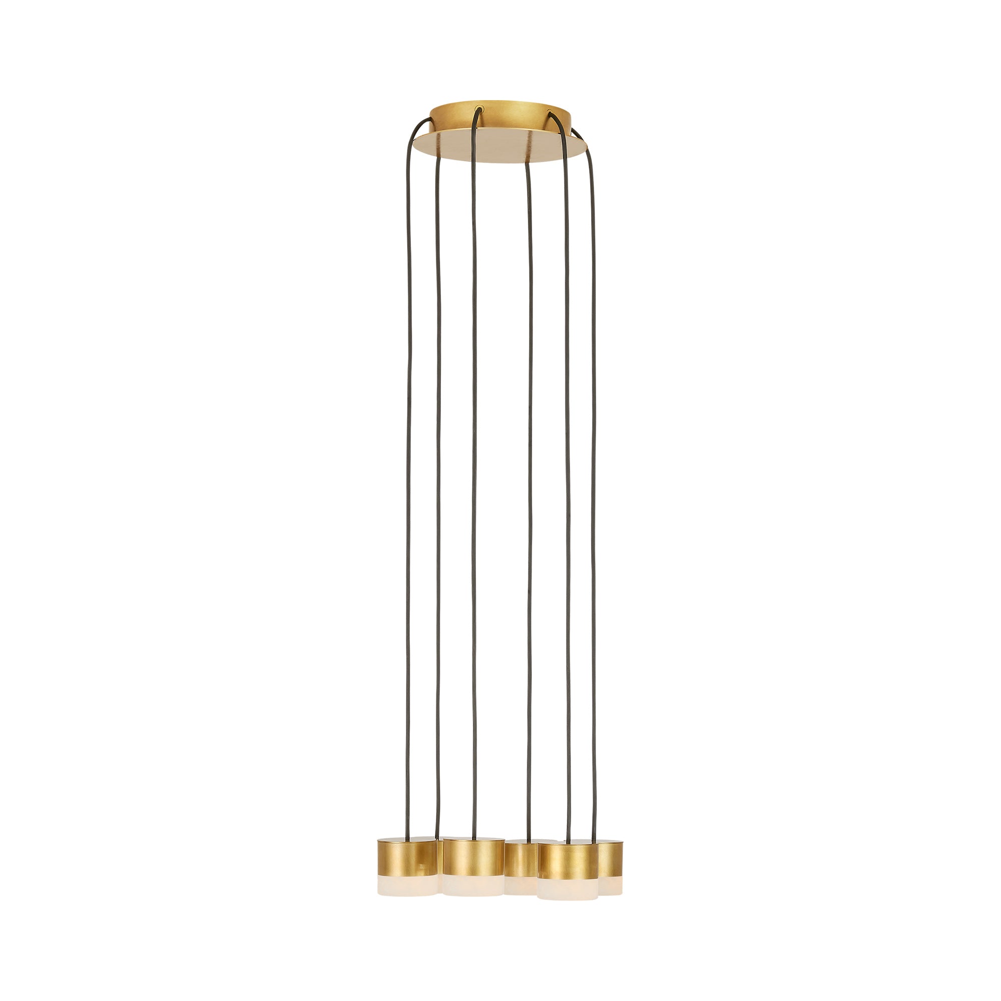 Linear silhouetting creates visual harmony in a light fixture with a dramatic tone and mood. The Gable LED Chandelier from Visual Comfort Modern invokes piano-like imagery created with slender cables dropping from a single canopy and culminating in diminutive disc shades. Gently curved diffusers cap each disc, infusing energy-efficient lighting with a striking impact.