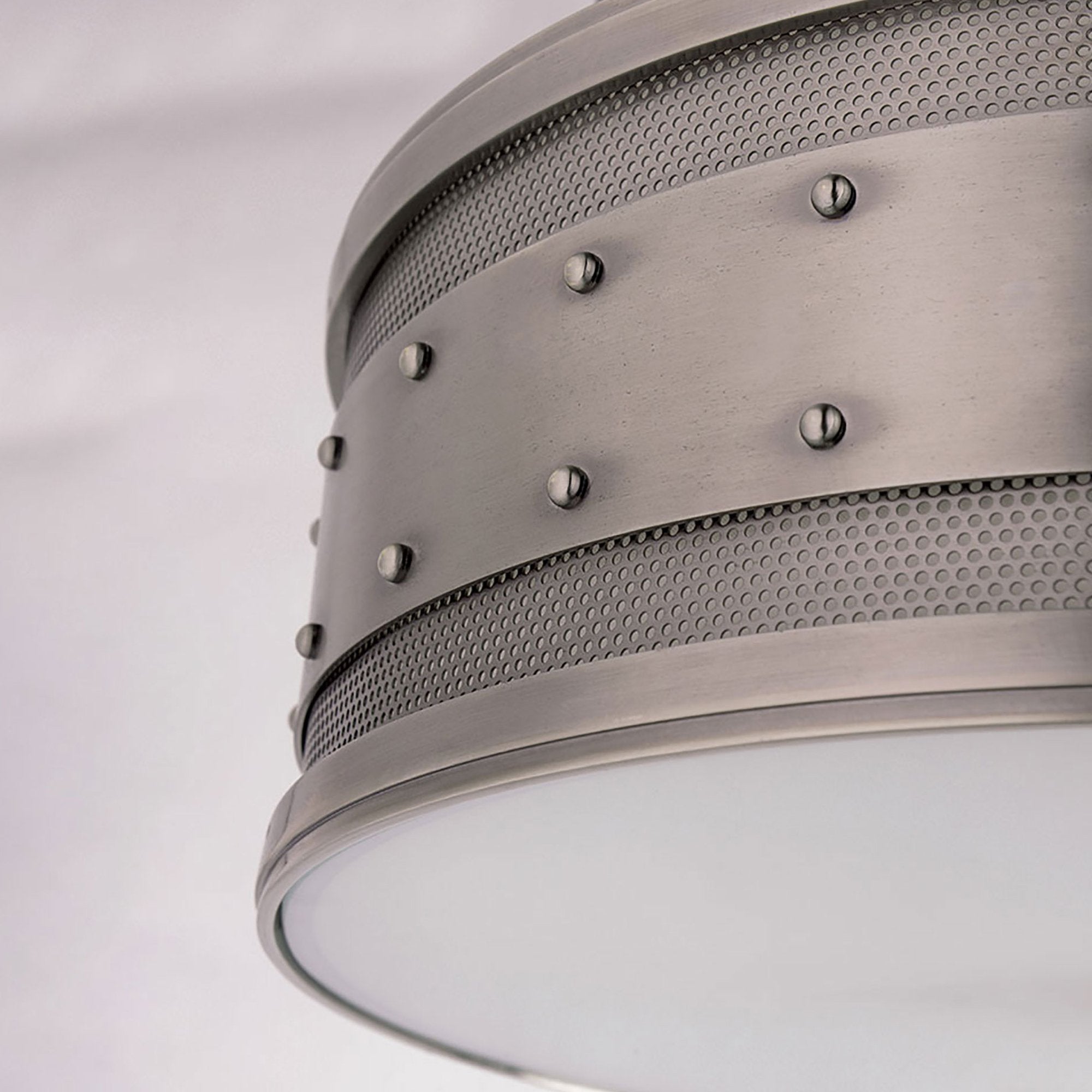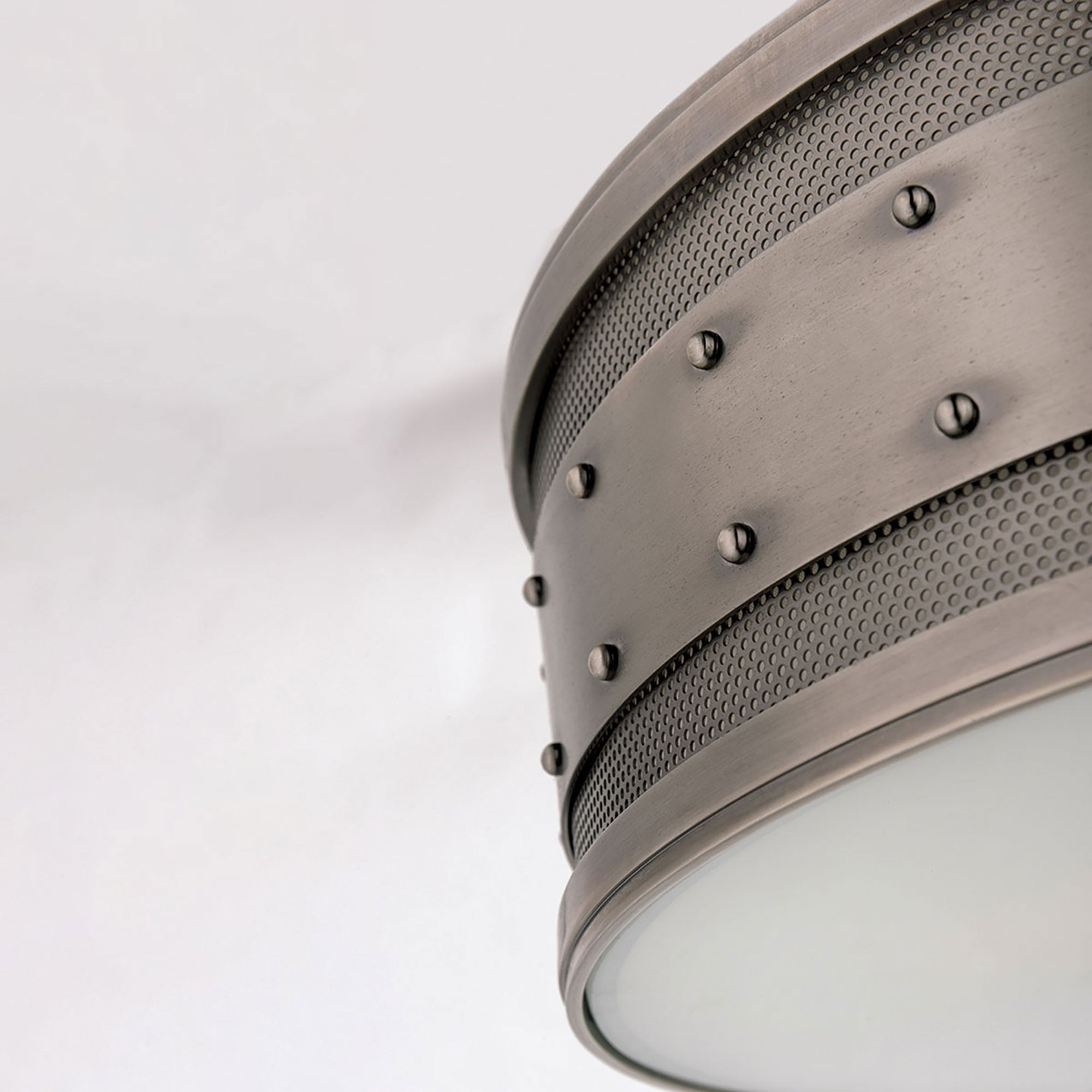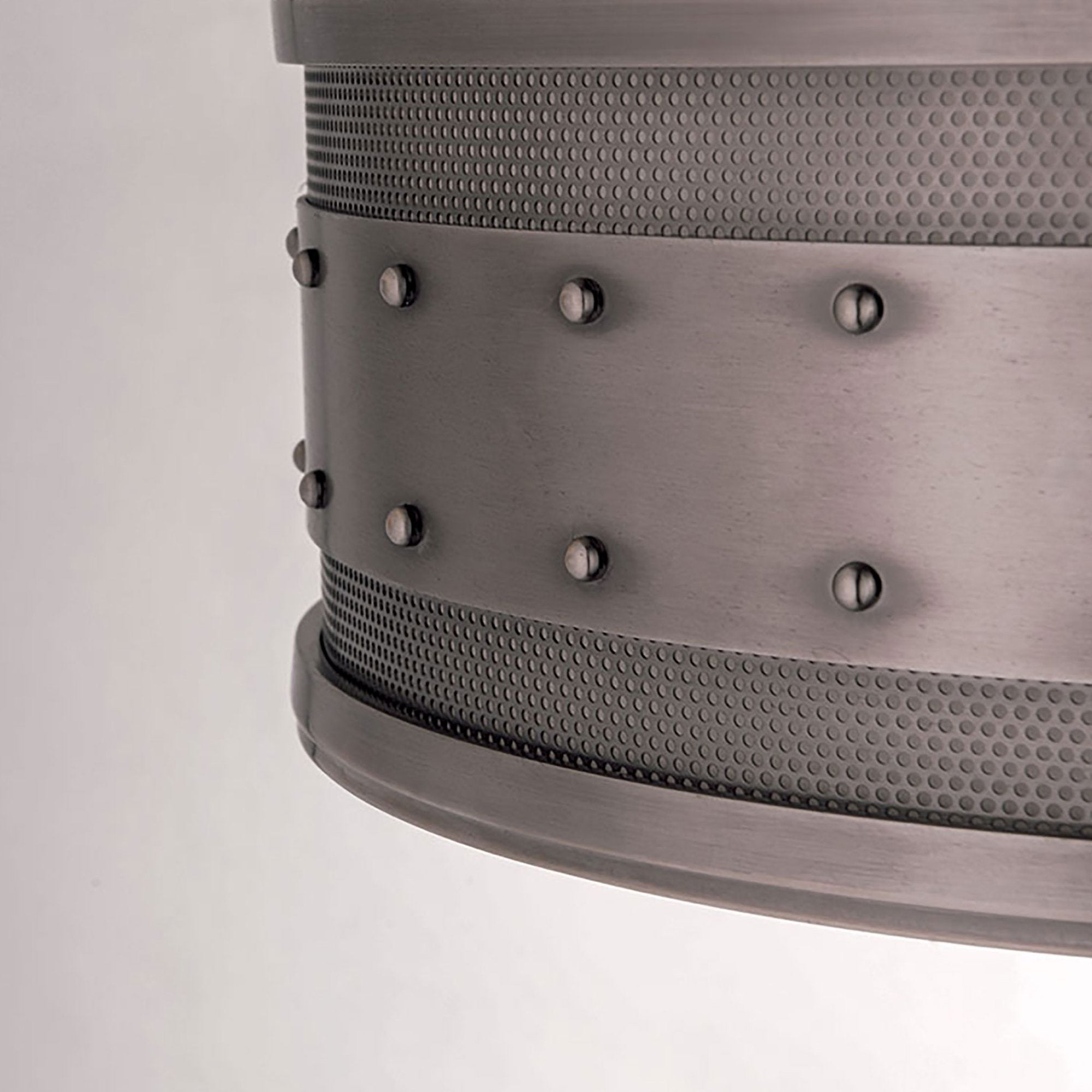 Our Gaines family applies industrial details such as studded rivets, perforated metalwork, and heavy brass extrusions to twenty-first century fixtures. Gaines offers a chance to add rich textural contrast and Machine Age intrigue to any space.