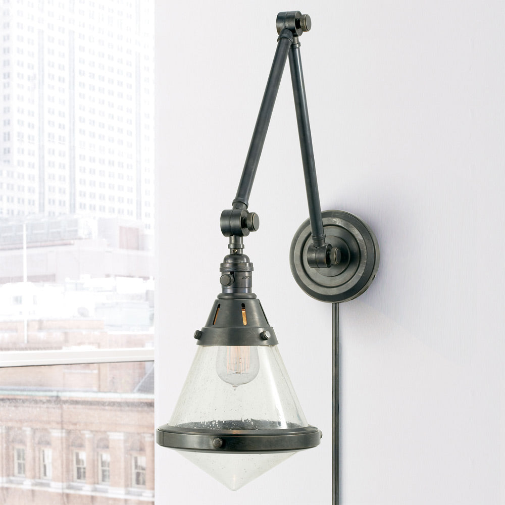 Flexible lighting fulfills a utilitarian function in the Gale Library Wall Light from Visual Comfort Signature, as a mix of decadent materials blend elegance with function and create a superb option for illuminating a sophisticated space. Adjust light positioning with an arm joint built into a metal frame, as a chic, shapely glass shade mixes up the motif with an eye-catching silhouette. This fixture reflects the marriage of industrial aesthetics with glam artistry.