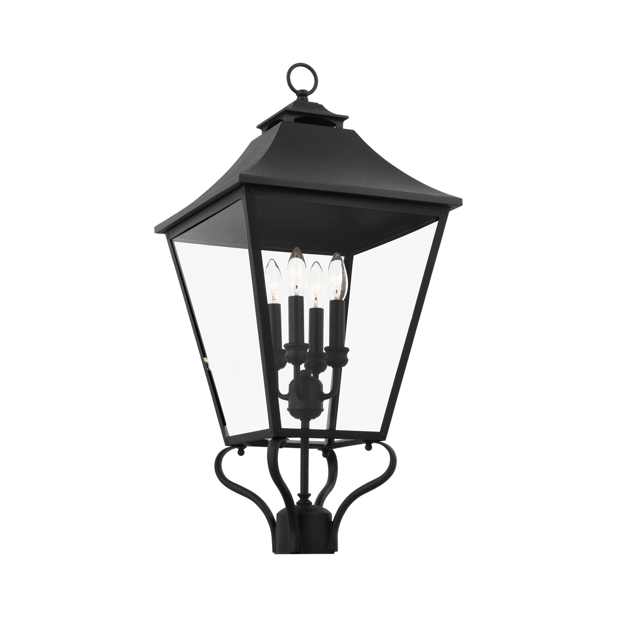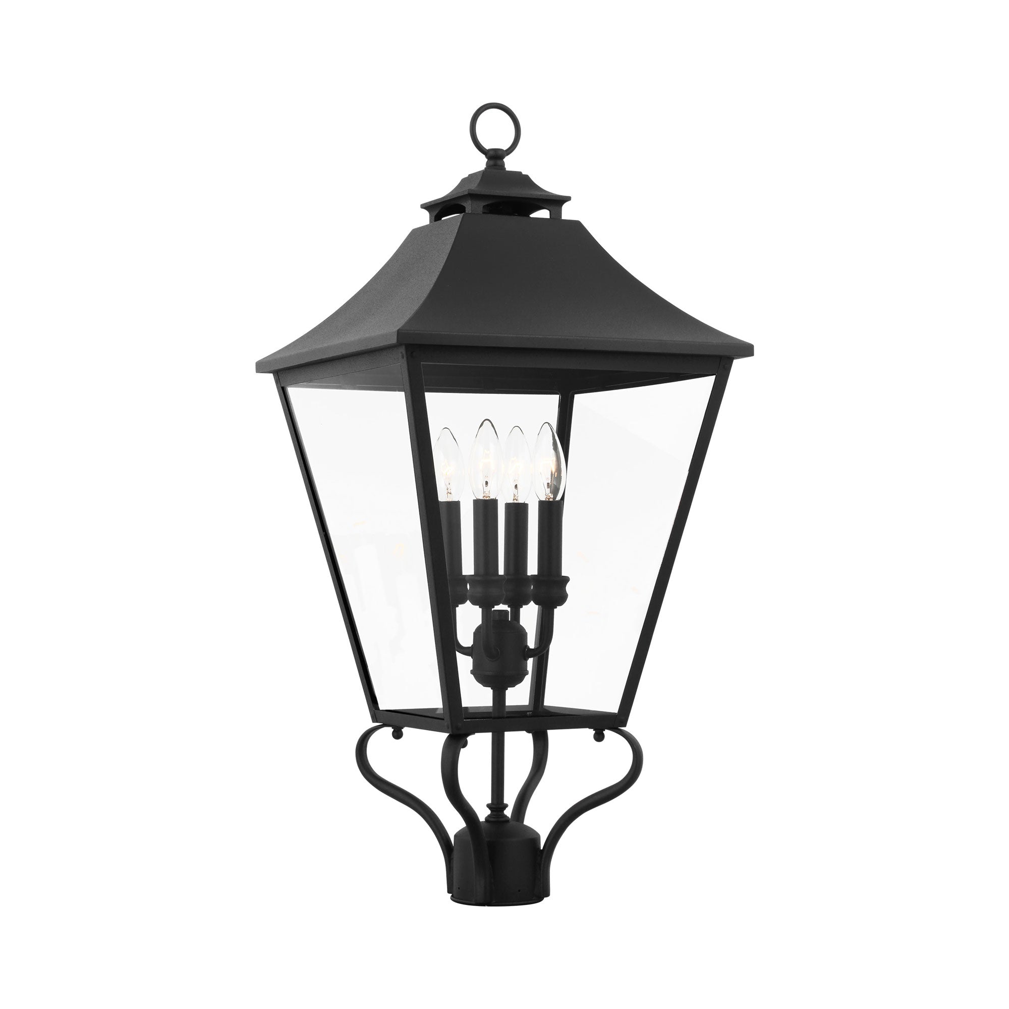 Curving arms add lift to the timeless lantern featured in the Galena Outdoor Post Light from Visual Comfort Studio. Sleek, tapering lines define the classic silhouette, which boasts textured glass for a rain-inspired look and feel that casts a welcoming glow across paths and walkways. This three-light lantern design is wet location rated and designed for durability.