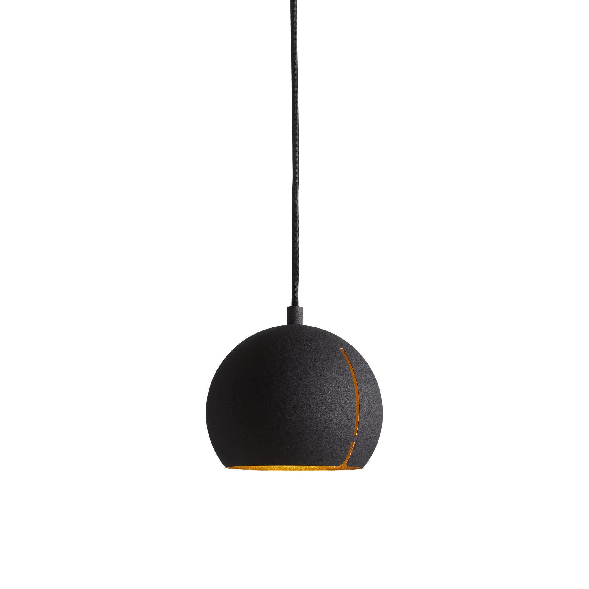 The Gap Pendant Light from WOUD offers a soothing organic feel with a dose of Euro style, perfect for today's trending minimalist spaces. Its rounded powder-coated metal outer shell is gritty and dramatic, embellished with rich brass finish lining. Illumination casts downward and through a subtle side slit, magnifying the impact of its brass interior.