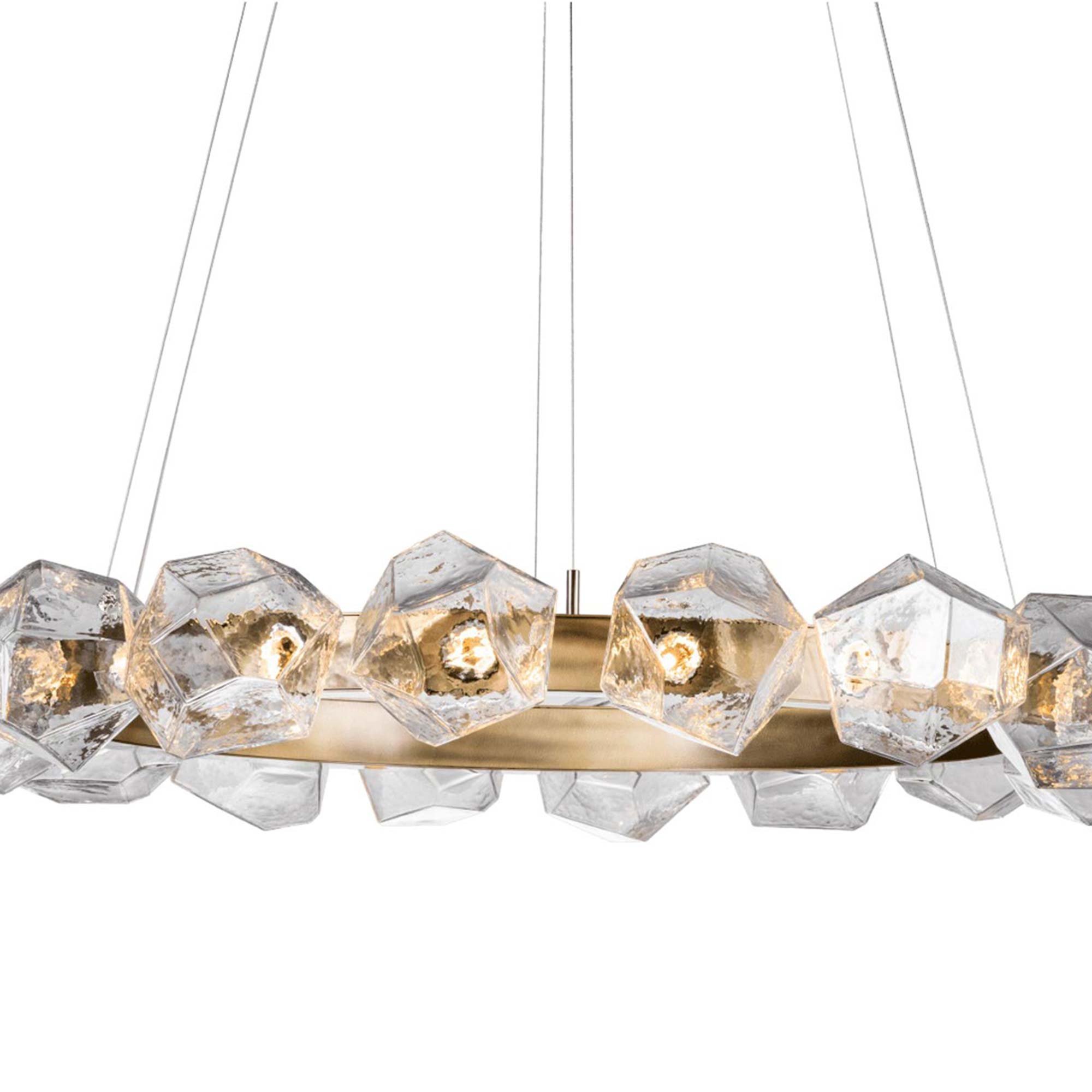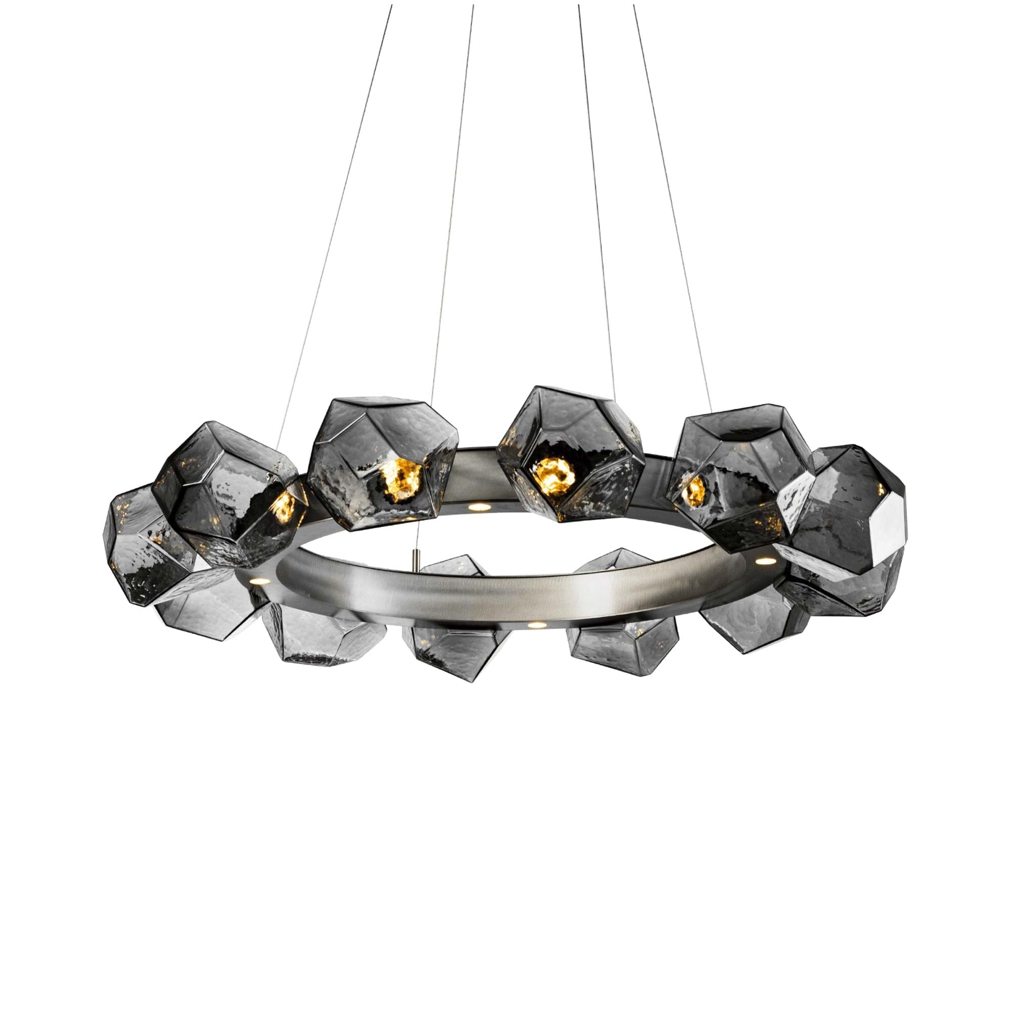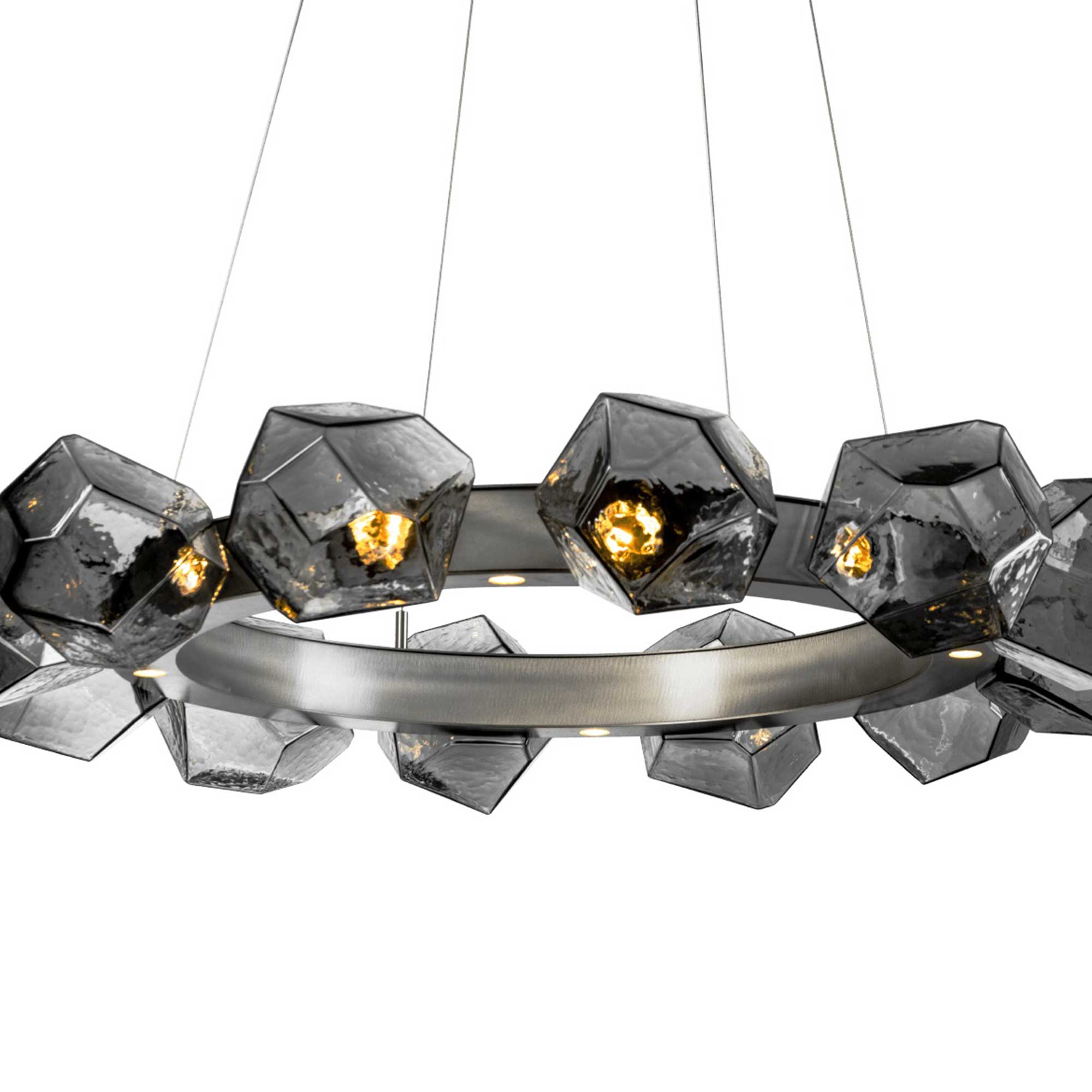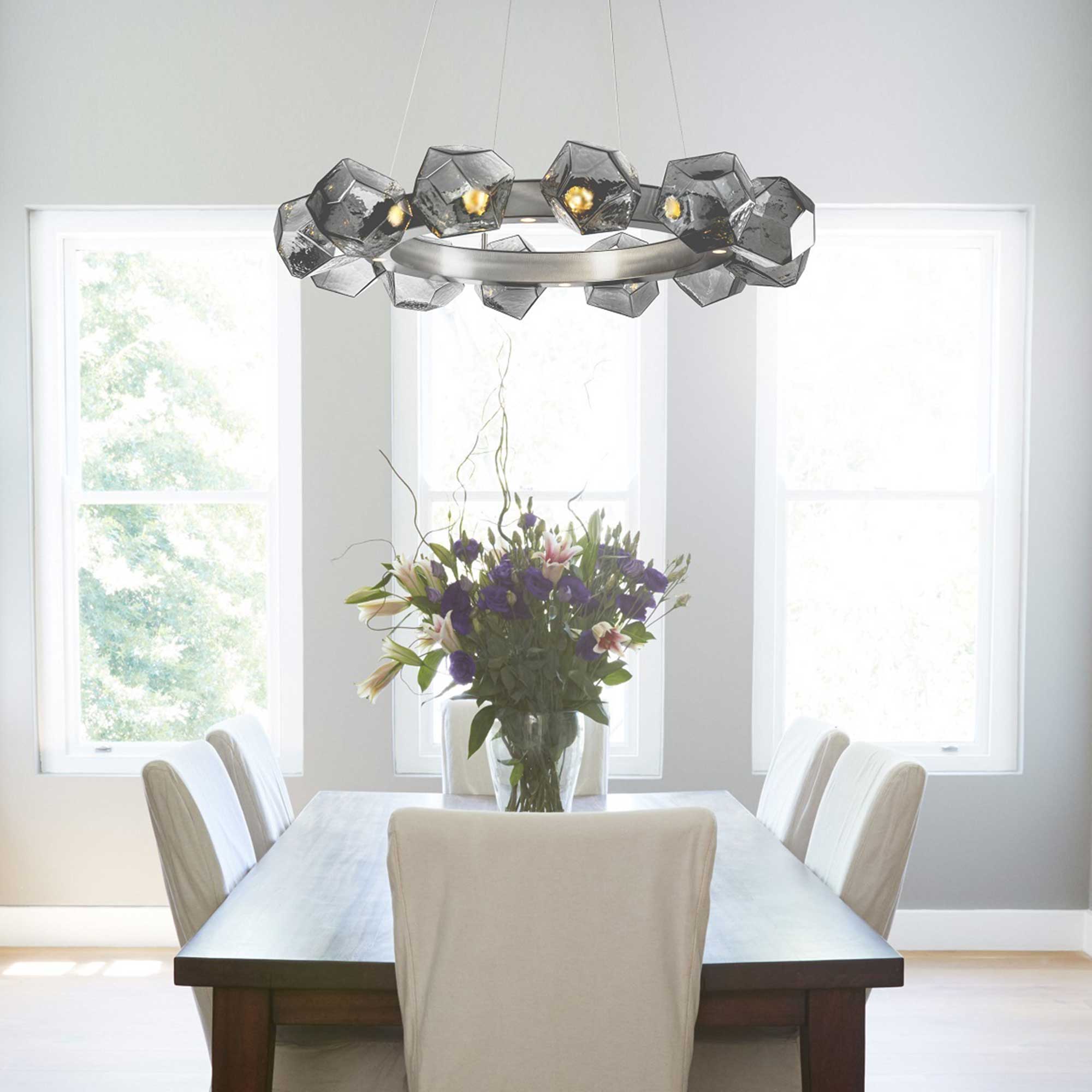 Undeniably inspired by beautiful jewelry, the Gem Radial Ring LED Chandelier from Hammerton Studio is a true focal point in a kitchen or dining room. Faceted blown glass glows with the illumination of energy efficient LEDs to bring bold style and wonderful lighting.