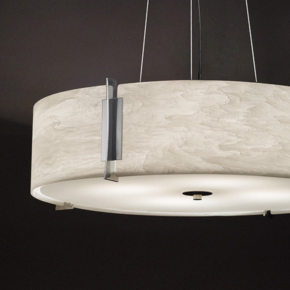 Casual style leans chic and eye-catching as the Genesis Pendant Light from Ultra Lights reflects a contemporary look perfect for easy-living spaces. Dress up a dining ensemble, entryway, or living room with this pendant featuring a drum shade wrapped in beautifully neutral fabric with linear metal accents and an elegant premium diffuser.