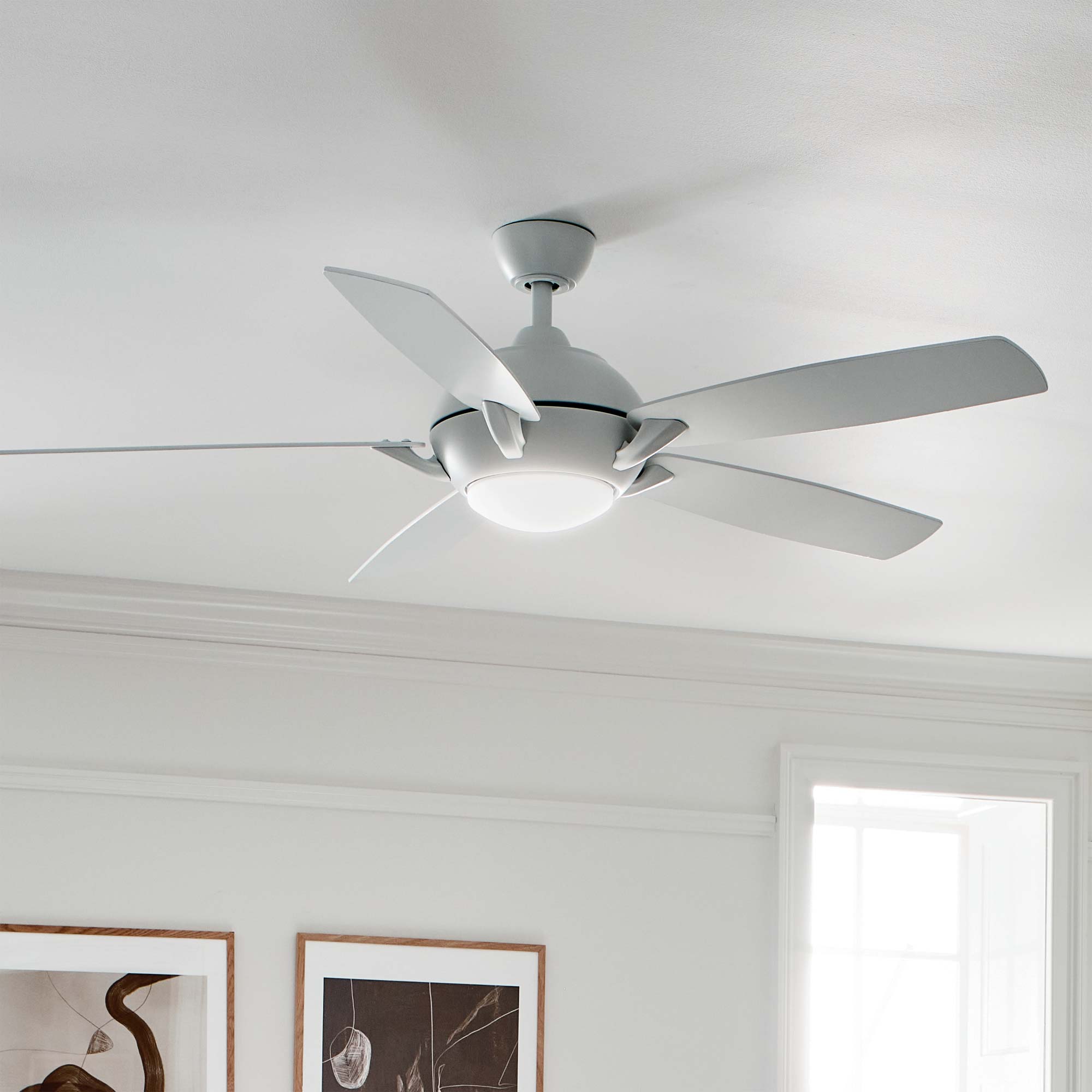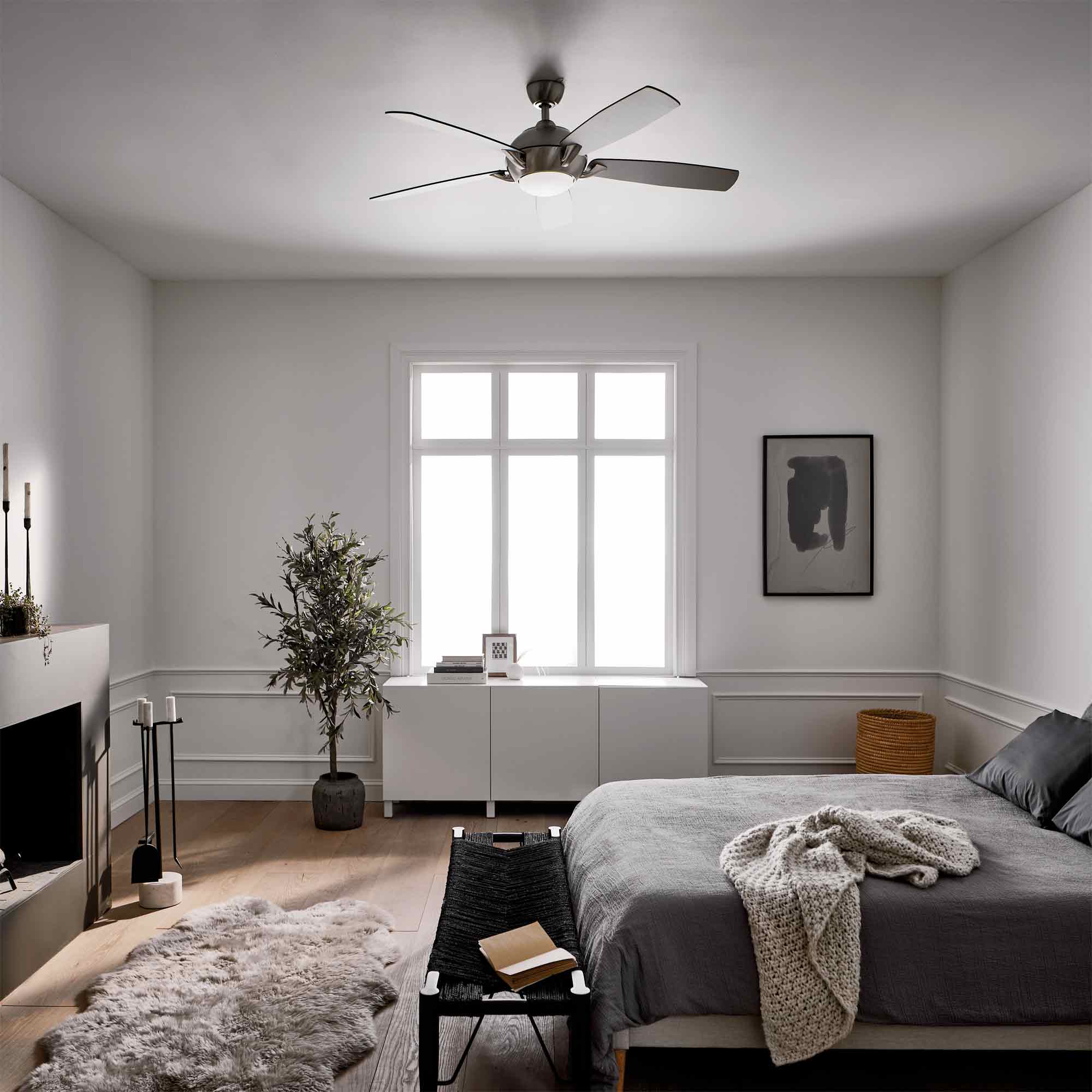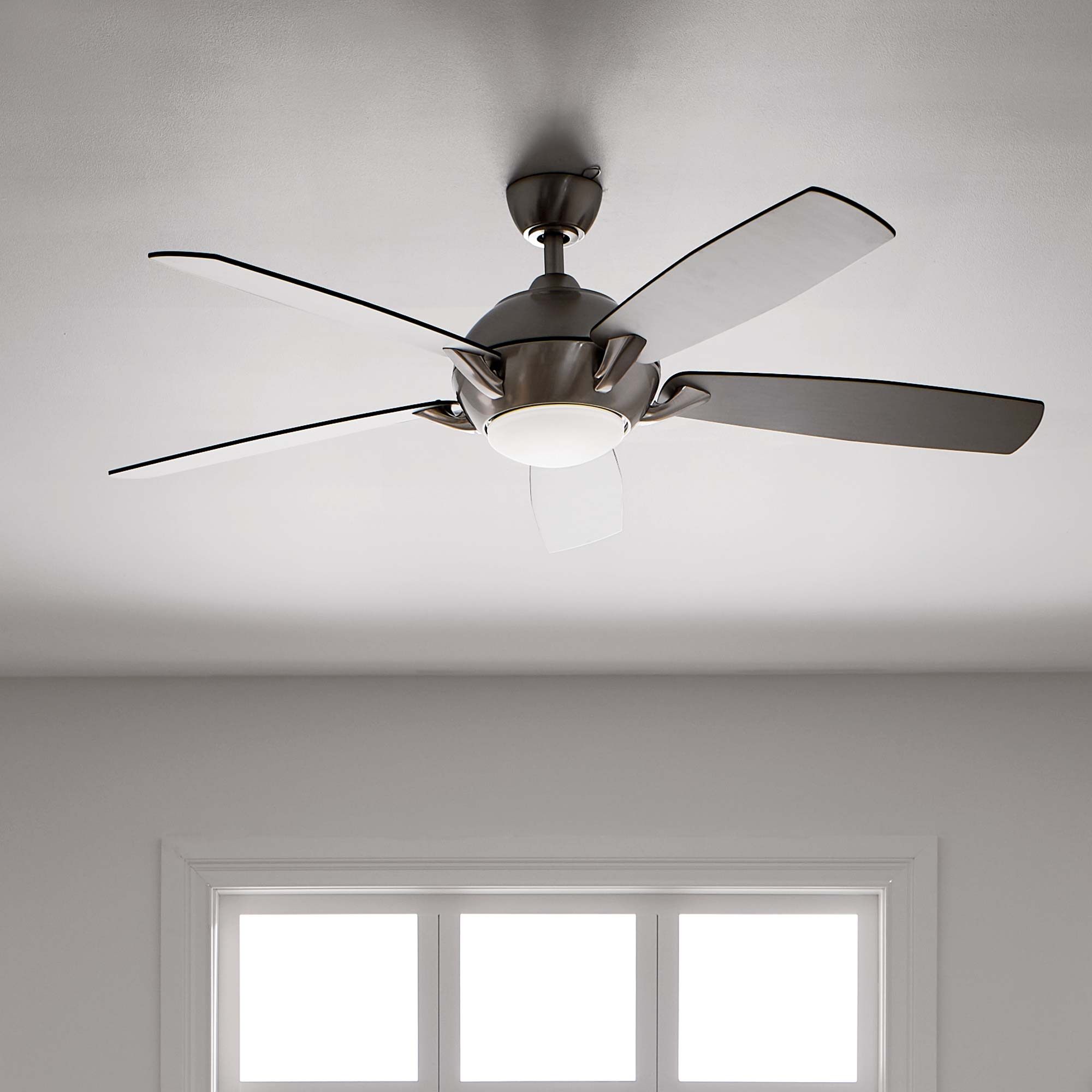 This transitionally styled, Brushed Stainless Steel, Matte White, Olde Bronze and Satin Black ceiling fan from the Geno™ collection fits a range of decorating tastes. Attractive blade irons, integrated LED light kit and an included remote control operating system make this a great choice for your home.