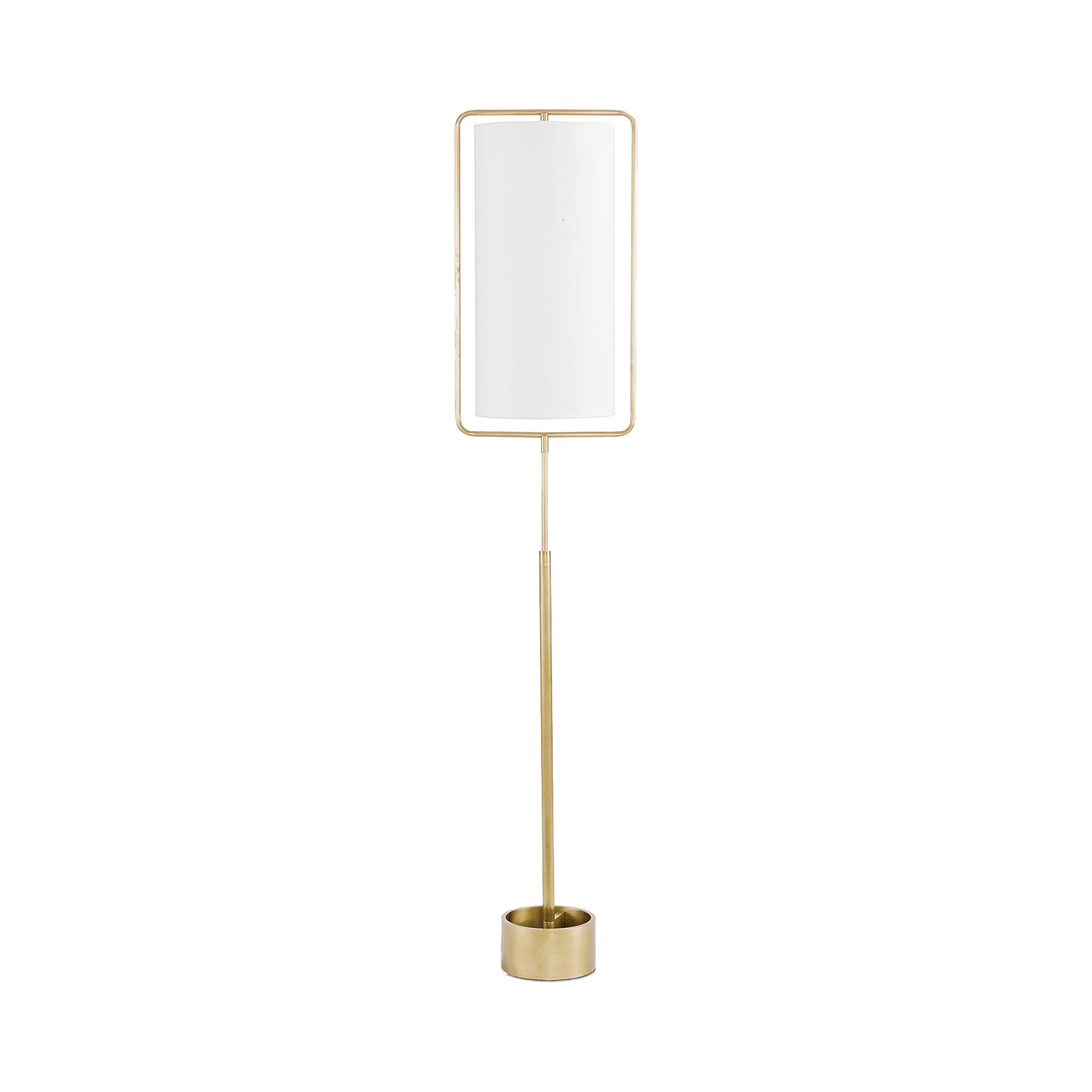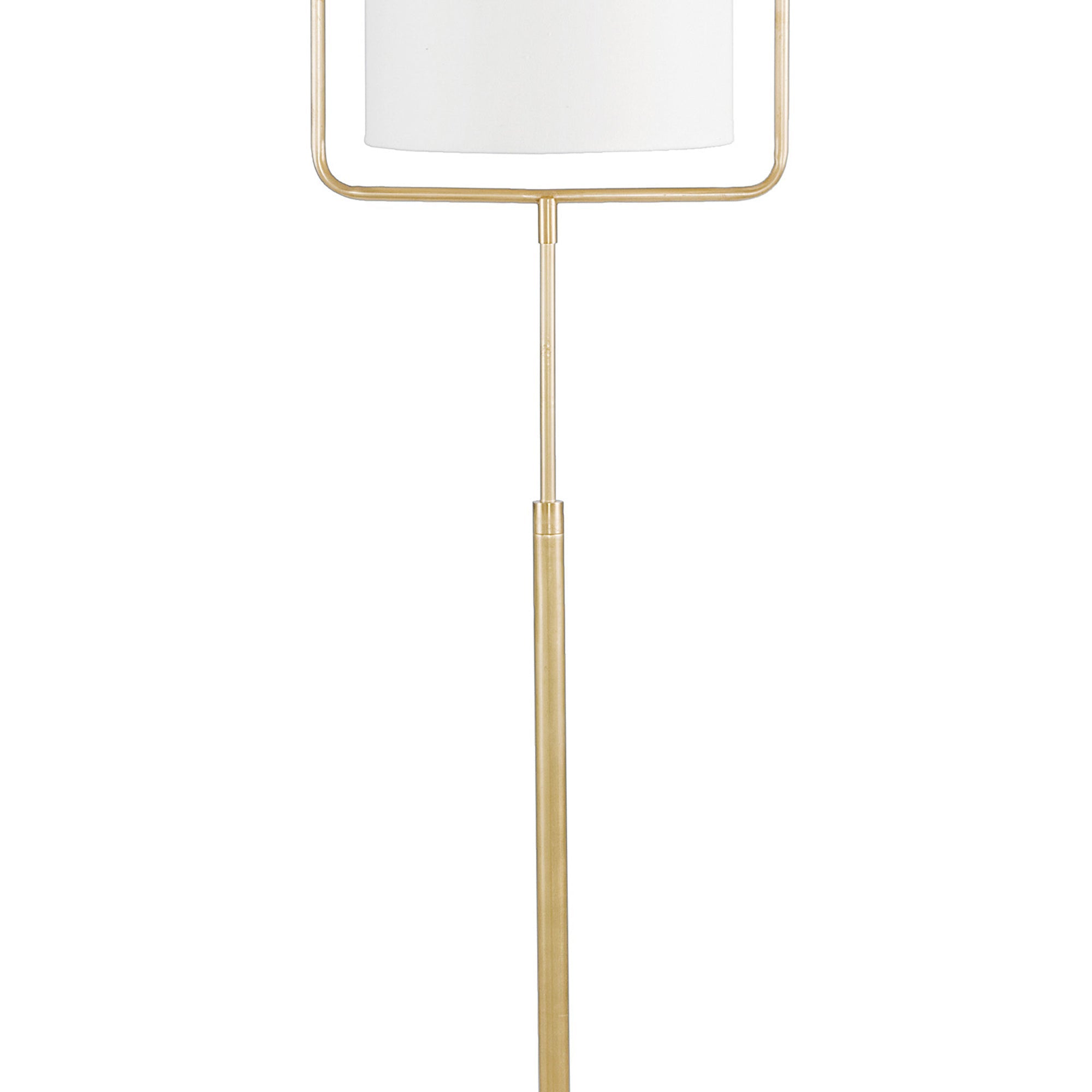 Illusion and spatial construction produce a striking impact in the design of the Geo Floor Lamp from Regina Andrew. Contemporary style builds an ethereal look with natural brass finish tubular steel framing that leaves a margin surrounding this lamp's elongated shade. A tribute to silhouetting and proportion, this lamp delivers a sleek, sophisticated element perfect for modern settings.