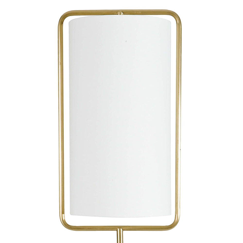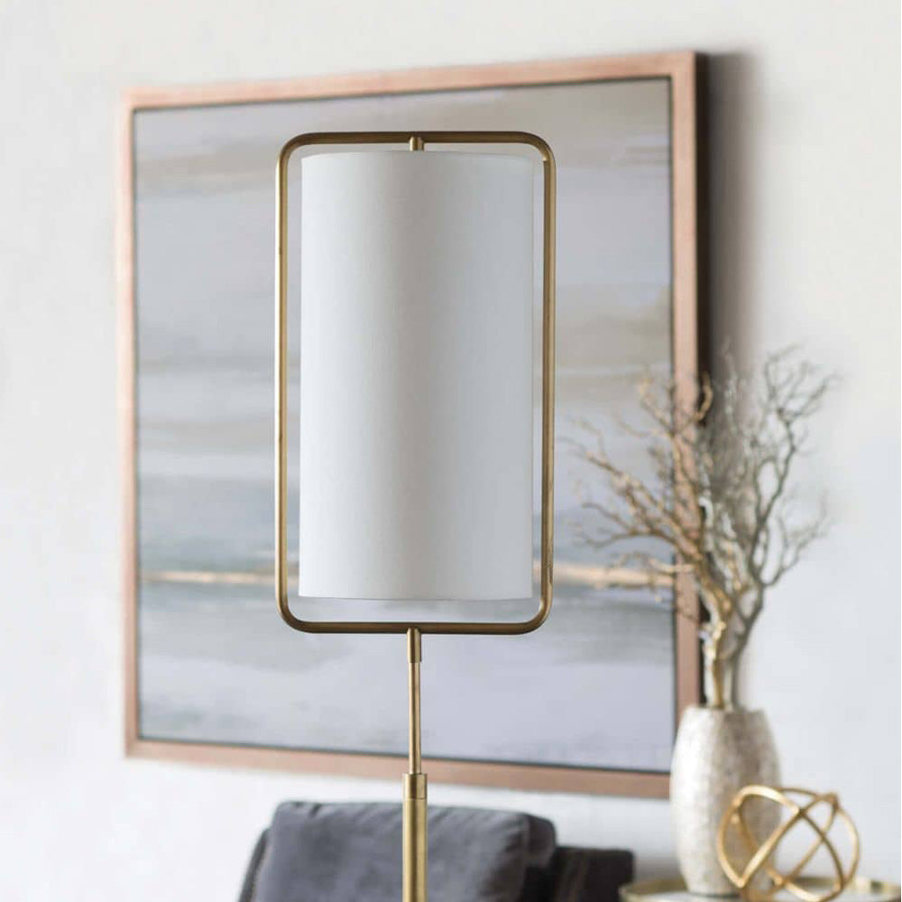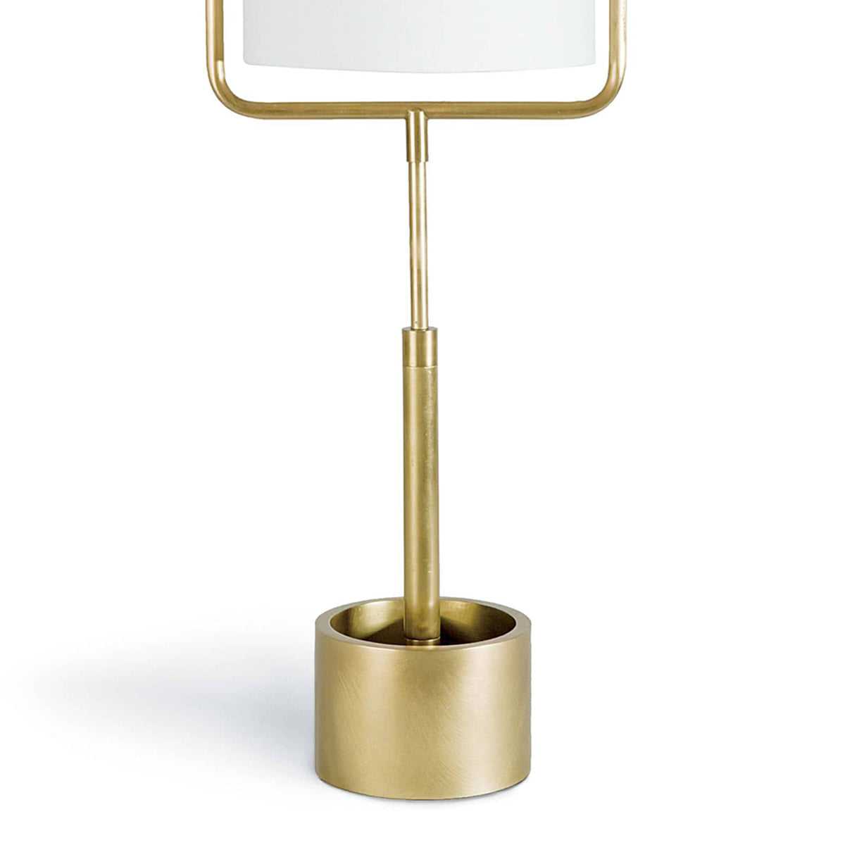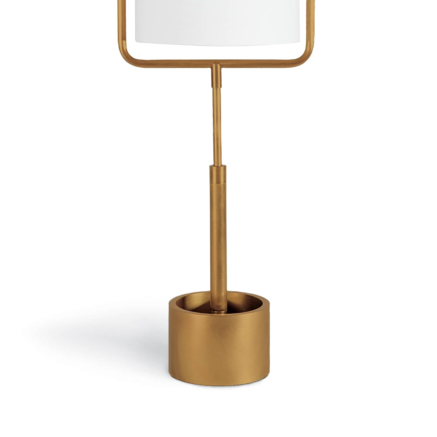 A cumulative impact of gentle shaping and proportionality turns the Geo Table Lamp from Regina Andrew into a primary décor piece, artisan and elegant. Tubular steel framing with a rich natural brass finish contrasts with a crisp white elongated shade, as an open margin produces a framed visual impact.