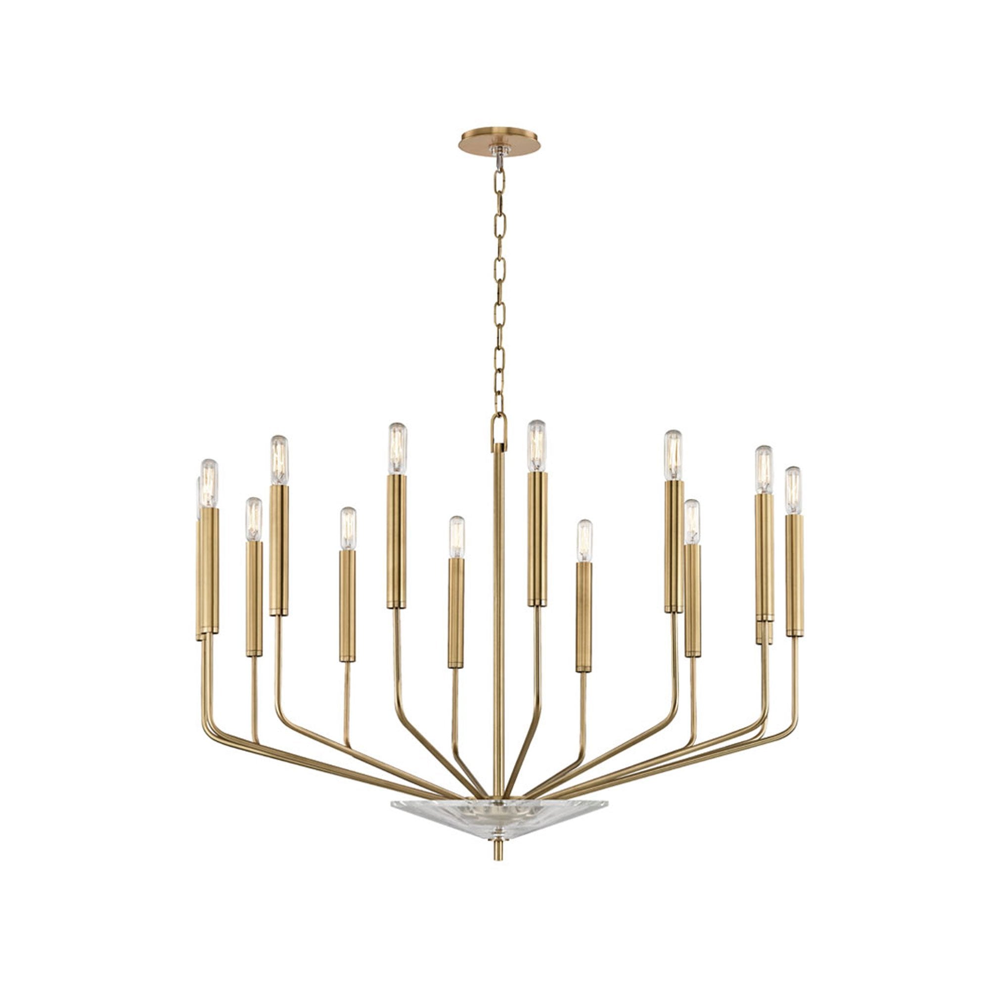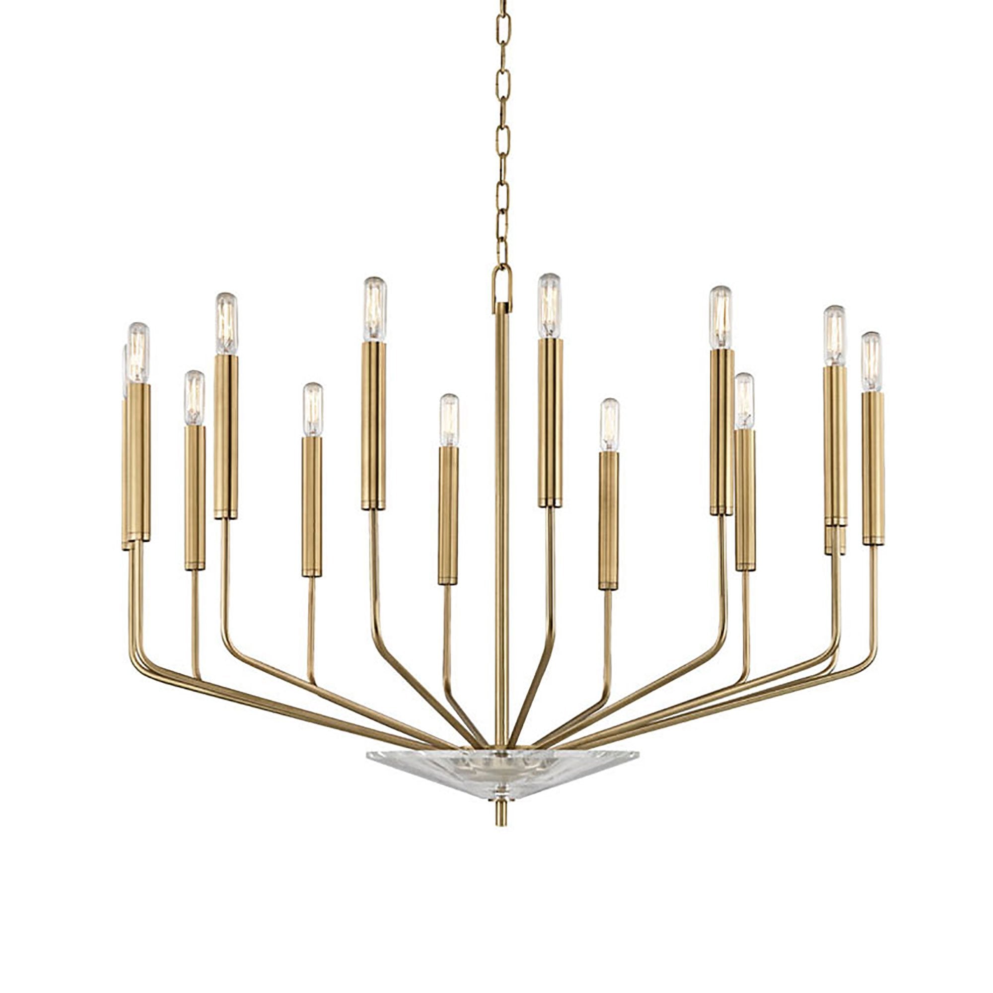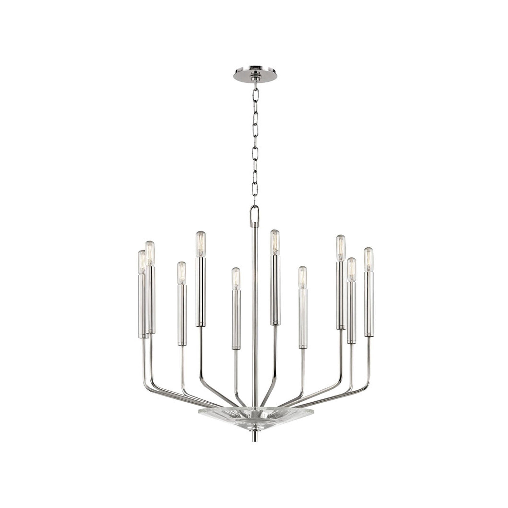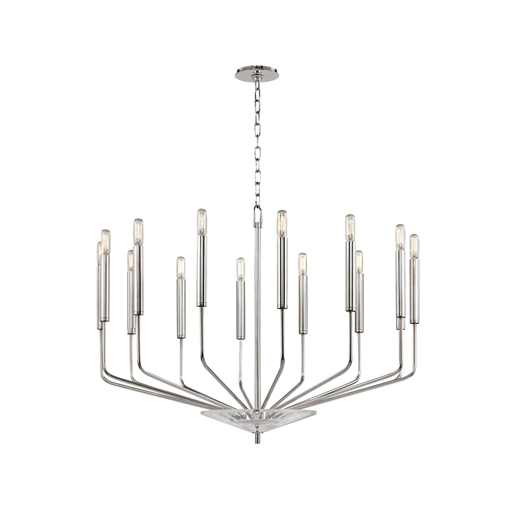 Gideon’s arms are round rods bent at obtuse angles, submerging into long tubes of metal the same diameter as the tubular bulbs which fit into them. In its chandelier form, a large crystal plate at its base, secured between arms and finial, adds just the right accent to Gideon’s minimalism.