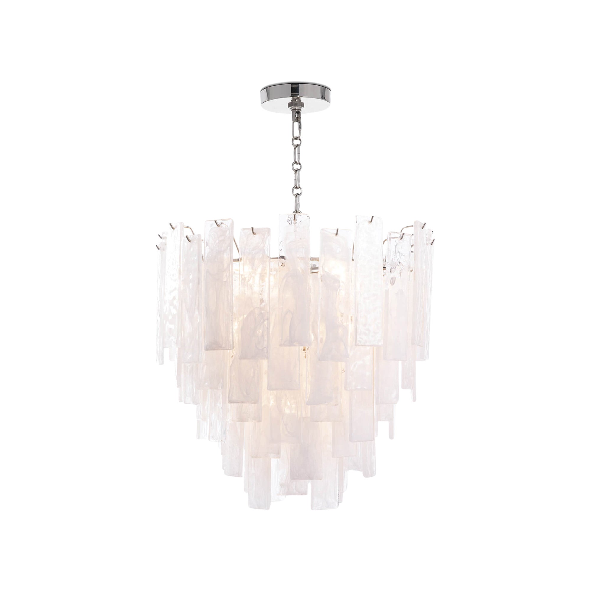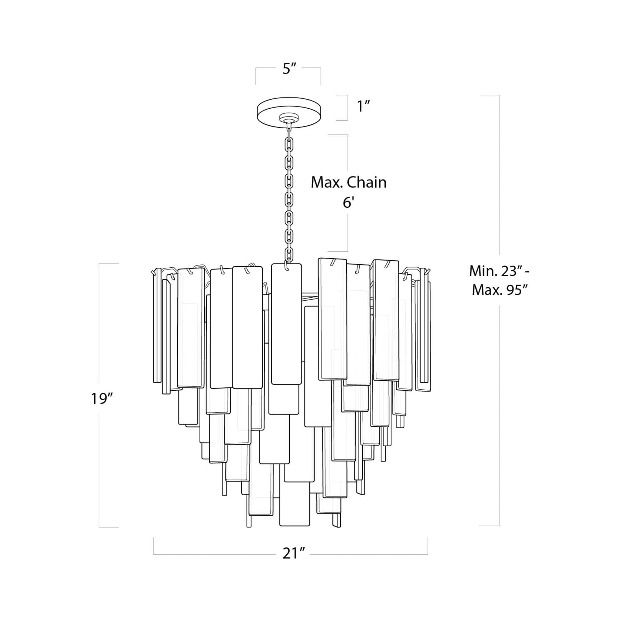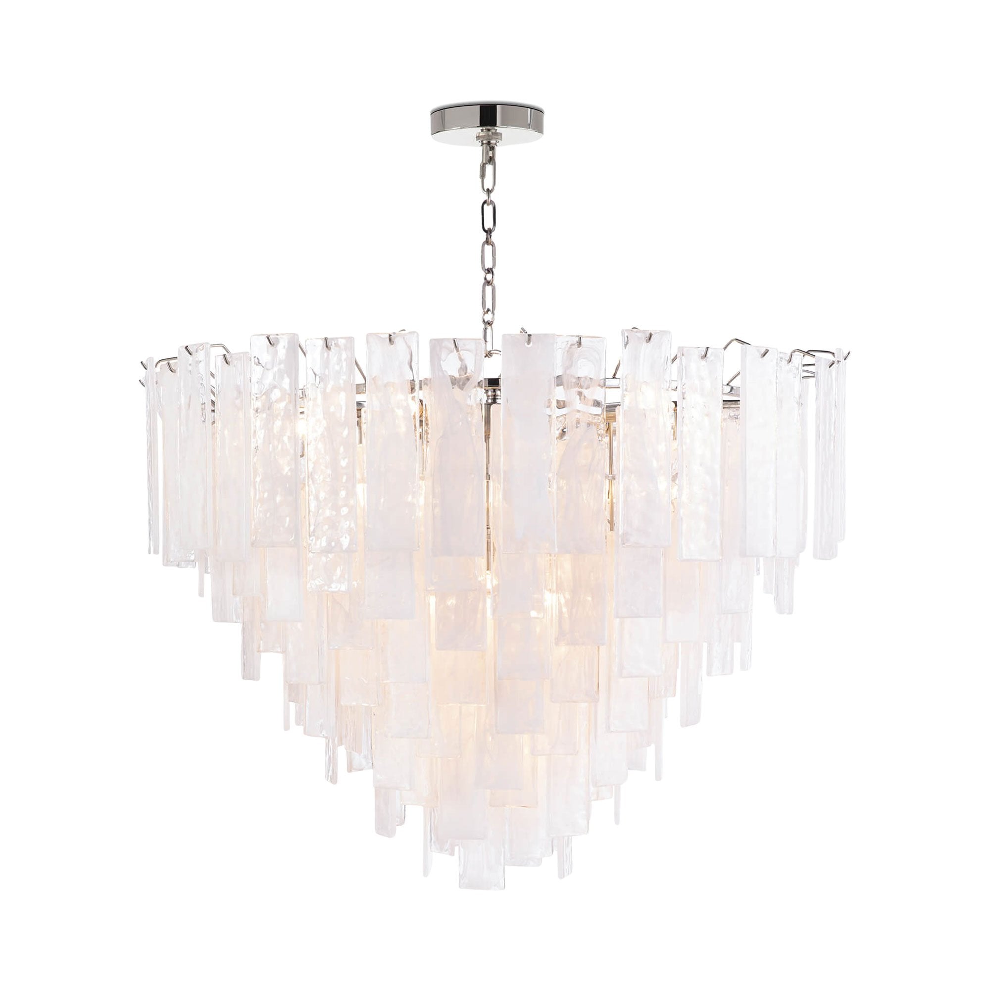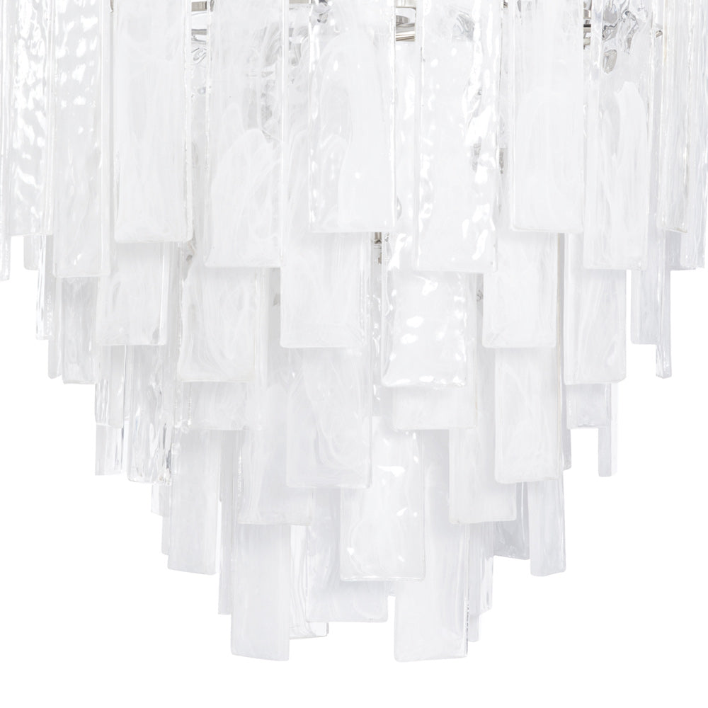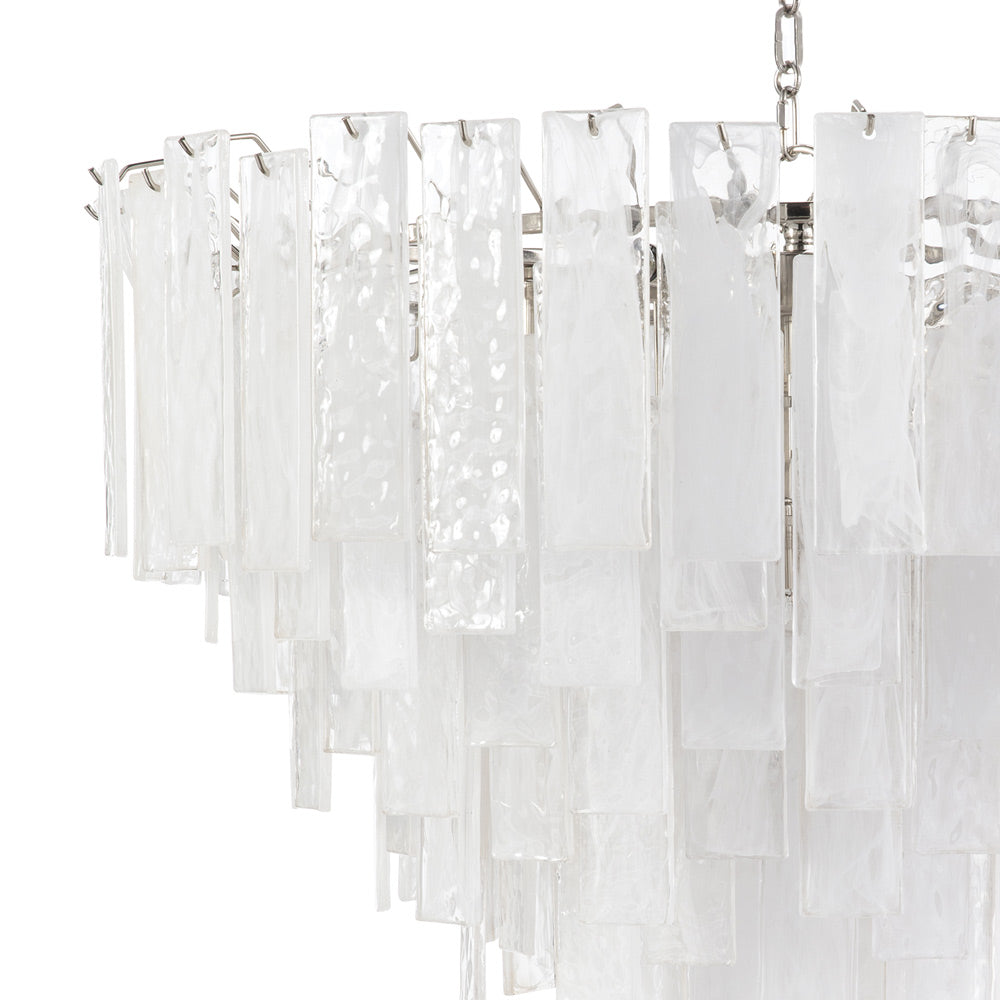 Glam influence takes a natural path to artistry in the Glacier Chandelier from Regina Andrew. Lustrous strips of decadent water glass dangle in tiers, reflecting and diffusing illumination sourced from partially hidden lamping. With plenty of versatility and a warm tint, the chandelier is a focal point in any setting.